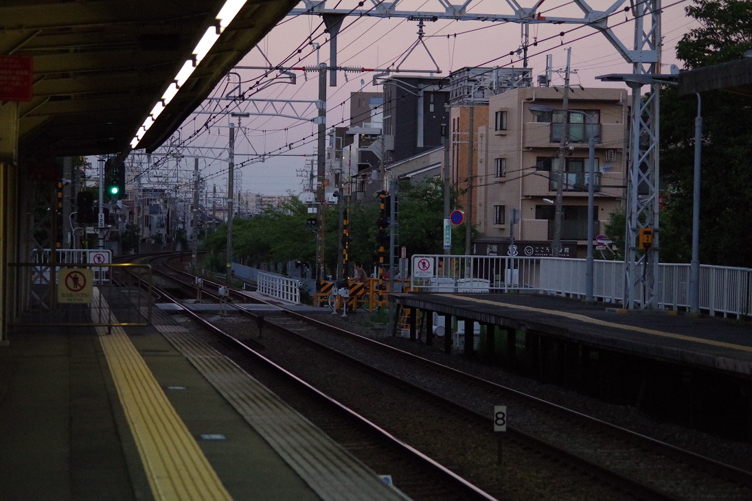 柵の手前からだとかなりの望遠を使わないとホームが入るほか、踏切があるので障検が入る。