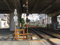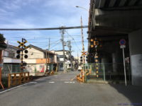 この踏切は一方通行だが、西側から東にある176号に入るためには、この踏切を通るしかないので交通量はかなり多い。ちなみに176号から踏切西側方向へは高架への斜路があるので一方通行でも大丈夫。176号の渋滞対策で下りだけ斜路が整備されて踏切が廃止されたのかとも思ったが、そうなると踏切のナンバーに欠番が無いのがおかしい。そもそも踏切名は高架道路が無いころからあったのではという気もする。とすると、もともとこの踏切があり、あとからこの地に高架が作られることになって、西行きのみ踏切渋滞が176号に及ぶのを懸念してはじめから斜路が作られていた、ということだろうか…?