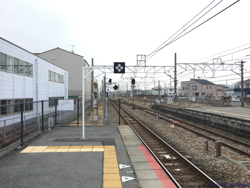 ただし奥は夢前川に向けて右にカーブしながら登っていっていくため、長編成は後ろが切れる。また、ホーム直前に機器箱があるので、引きつけるとかぶりやすい。