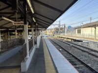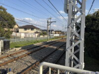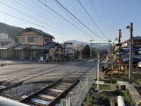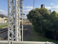 嵐山行きホームから嵐山行きの列車を撮るとなると、ホーム端は架線柱なのでその右から。木の隙間からなんとか、上桂駅と同じような撮れ方になりそうです。