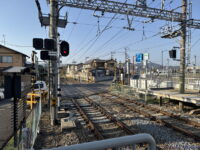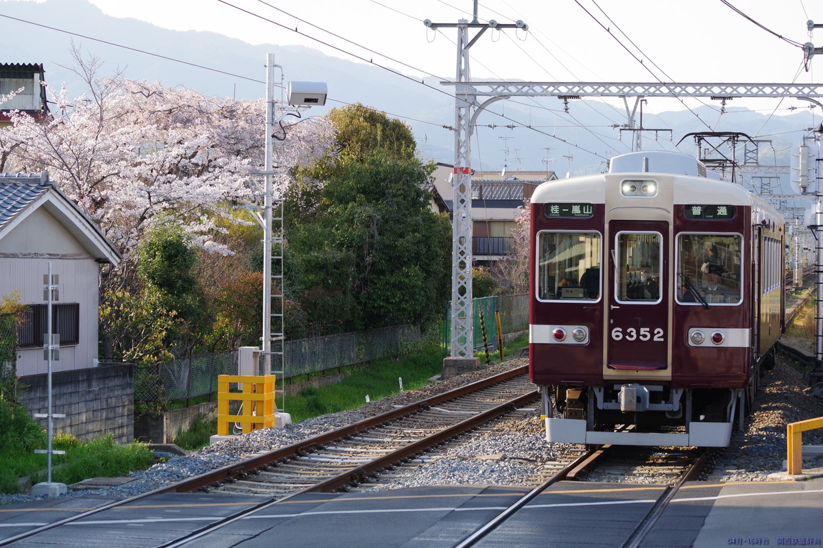 桂方面ホームから嵐山行き列車の撮影。ホーム端には架線柱と信号機があるため、下がって望遠のほうが撮りやすいです。ゆるく坂をくだってきた列車が撮影可能。嵐山行きが直線です。スプリングポイントは被ります。