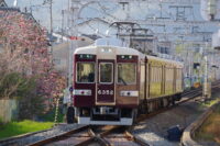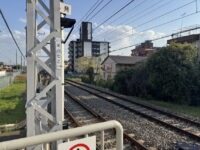 嵐山行きホームからの桂行き列車の撮影。桂行きが分岐を通り、信号機の関係から後ろが切れます。ただ上桂駅よりポイントまでの距離が遠いので、まだ撮りやすくなっています。