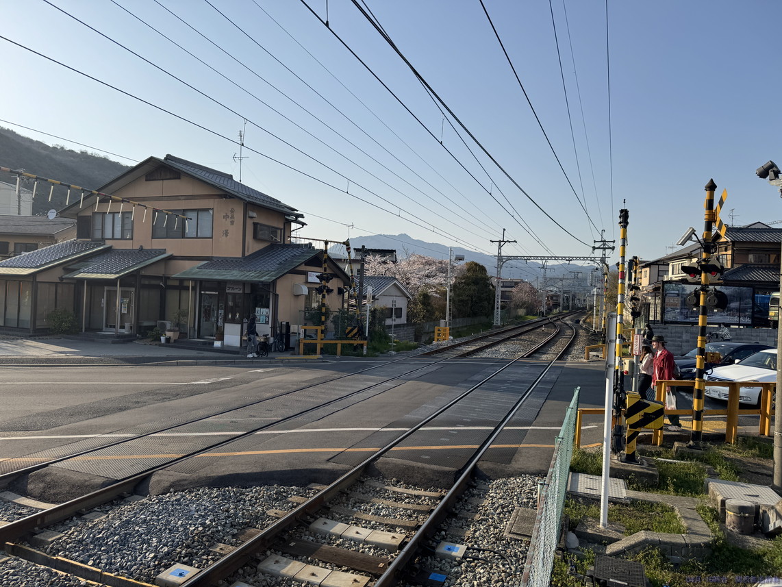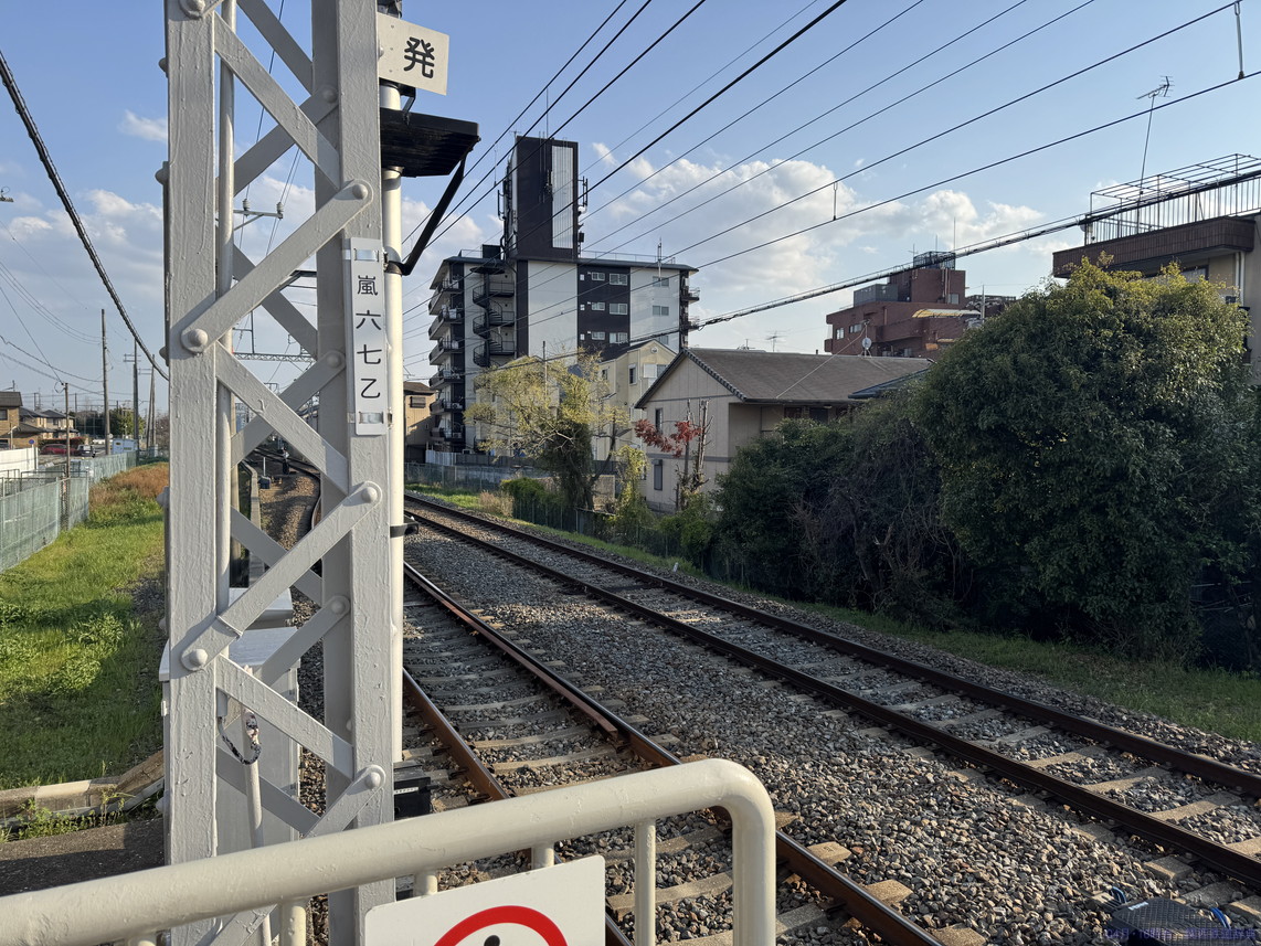 桂方面ホームから嵐山行き列車の撮影。ホーム端には架線柱と信号機があるため、下がって望遠のほうが撮りやすいです。ゆるく坂をくだってきた列車が撮影可能。嵐山行きが直線です。スプリングポイントは被ります。