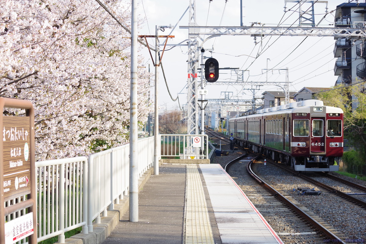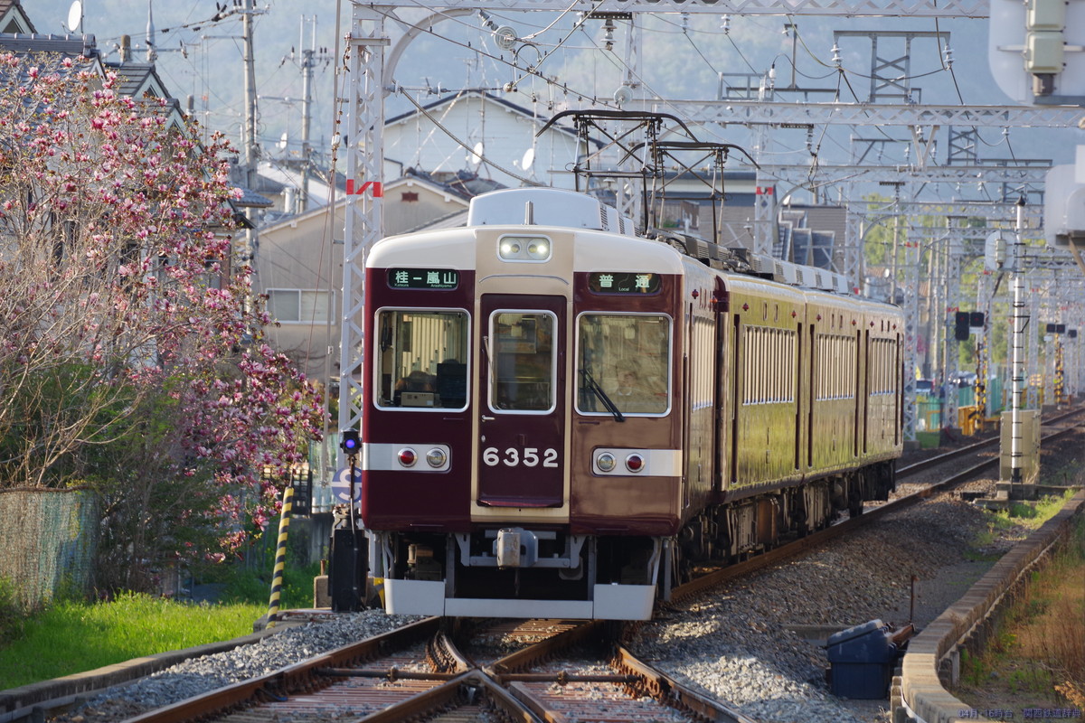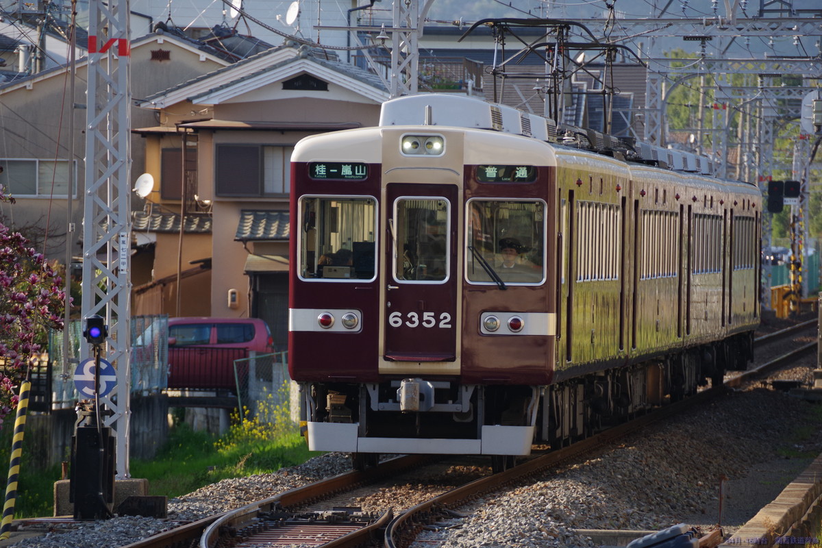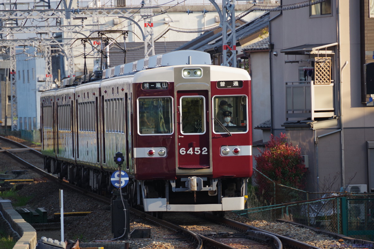 嵐山行きホームからの桂行き列車の撮影。桂行きが分岐を通り、信号機の関係から後ろが切れます。ただ上桂駅よりポイントまでの距離が遠いので、まだ撮りやすくなっています。