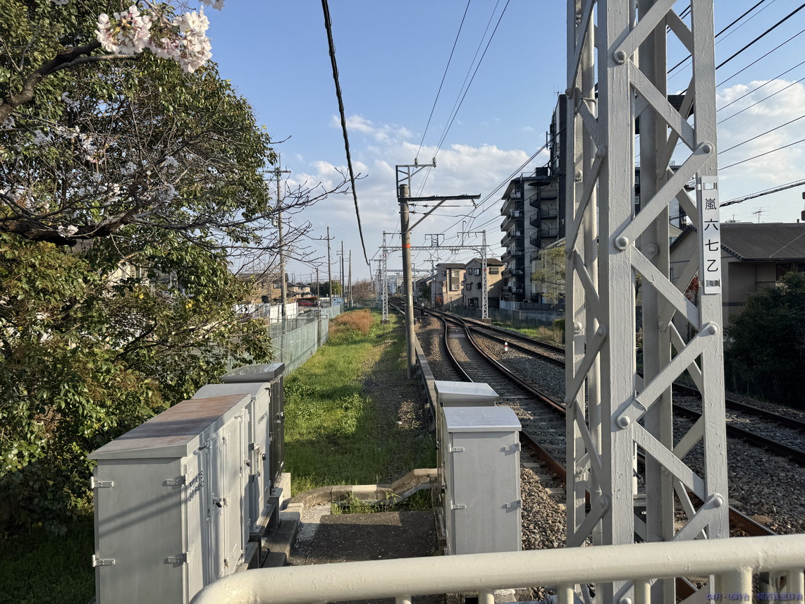 嵐山行きホームから嵐山行きの列車を撮るとなると、ホーム端は架線柱なのでその右から。木の隙間からなんとか、上桂駅と同じような撮れ方になりそうです。