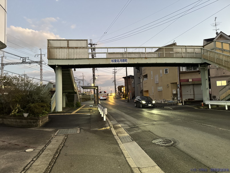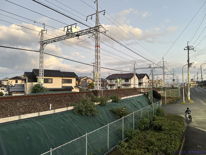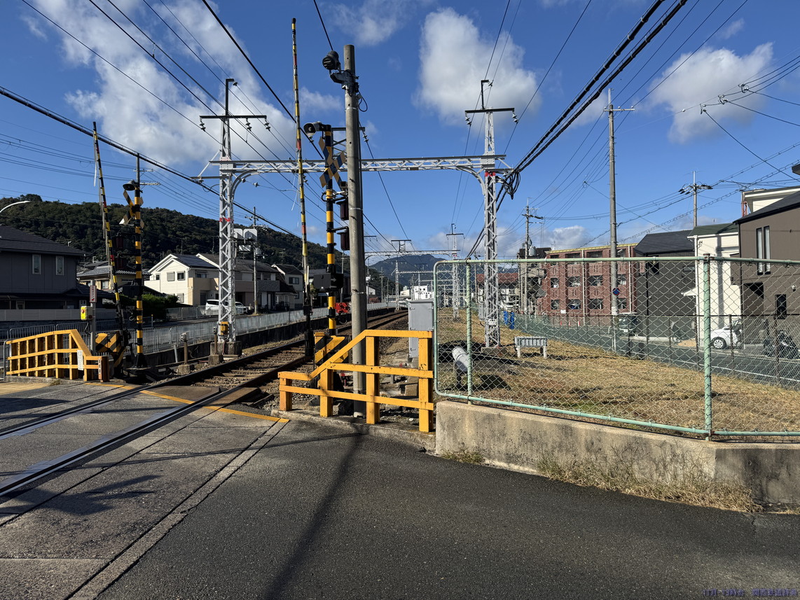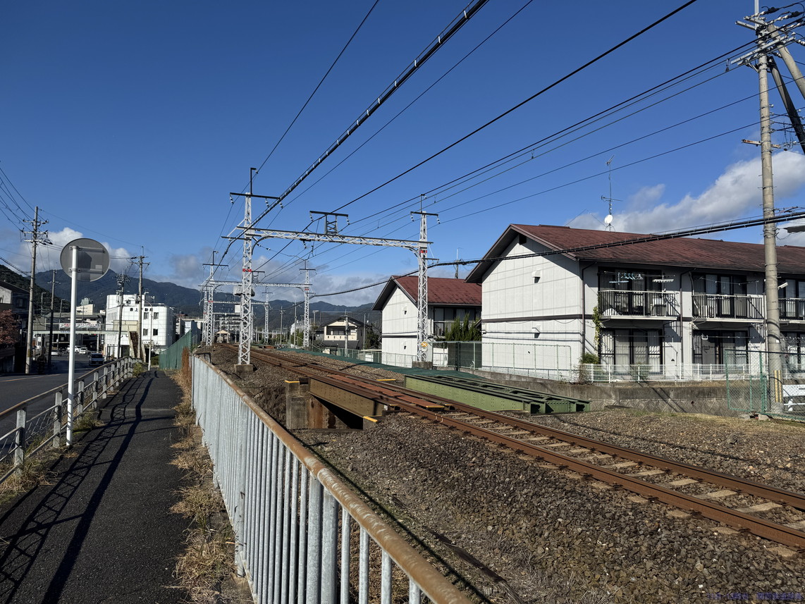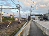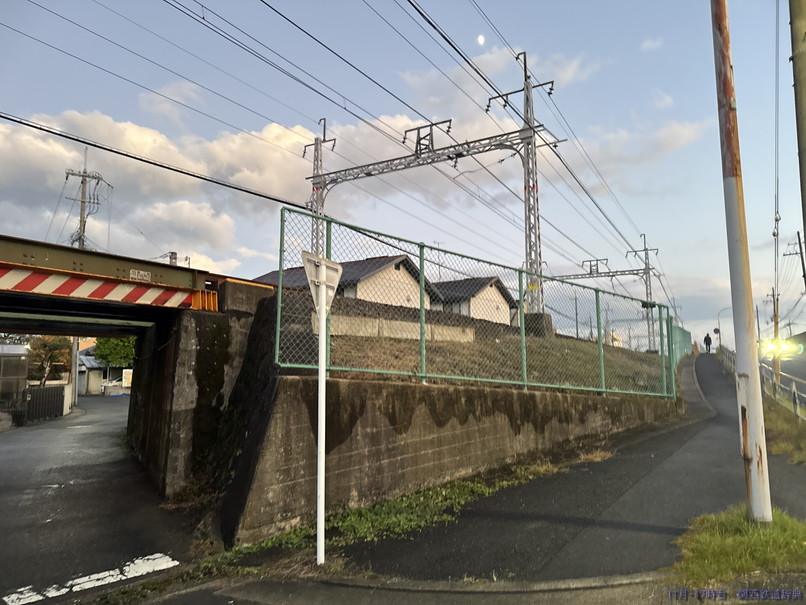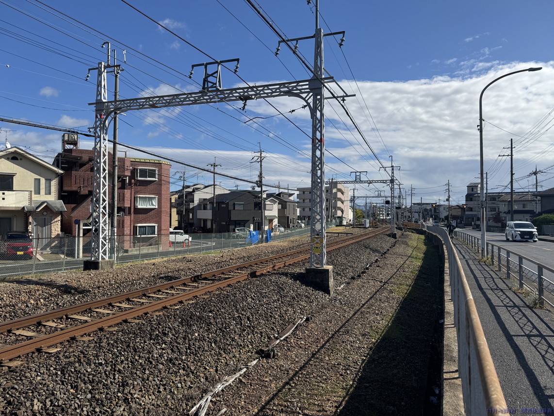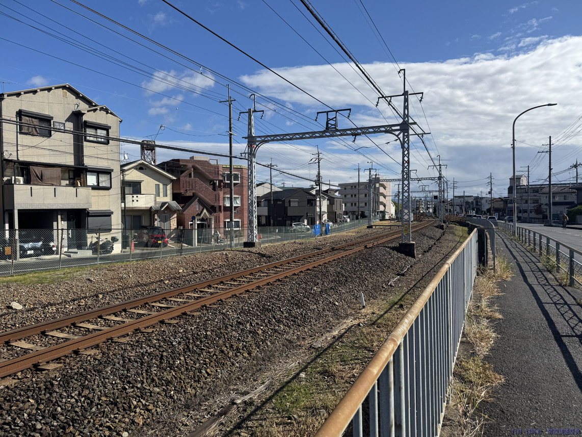 駅間の途中で府道が線路により沿ってきます。合流点にある歩道橋。架線柱はかかりますが真横から撮影できそうです