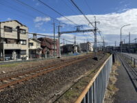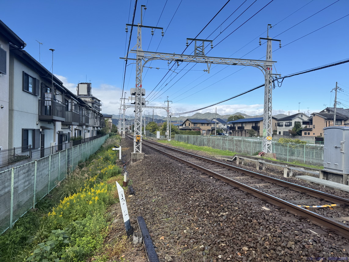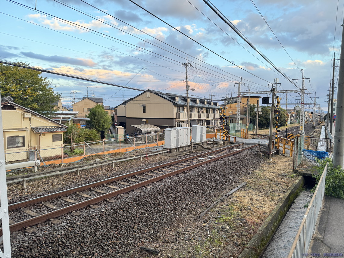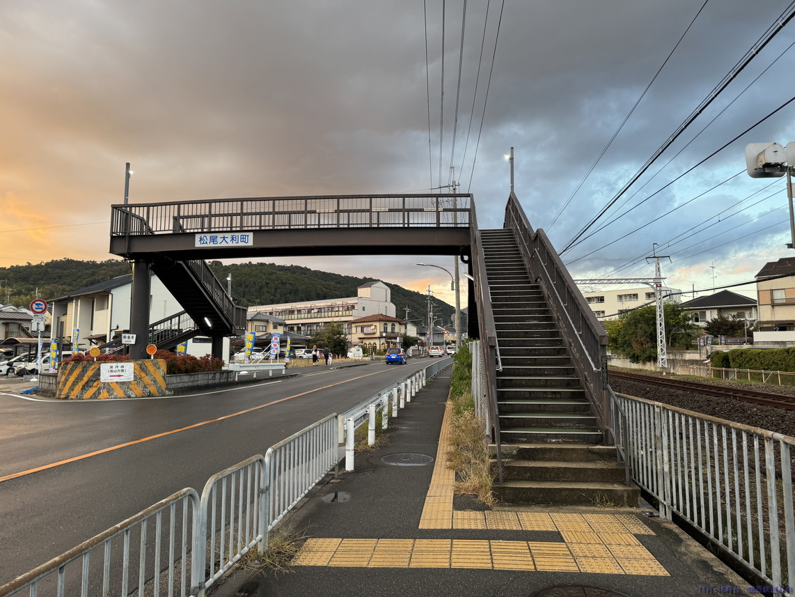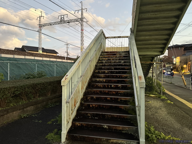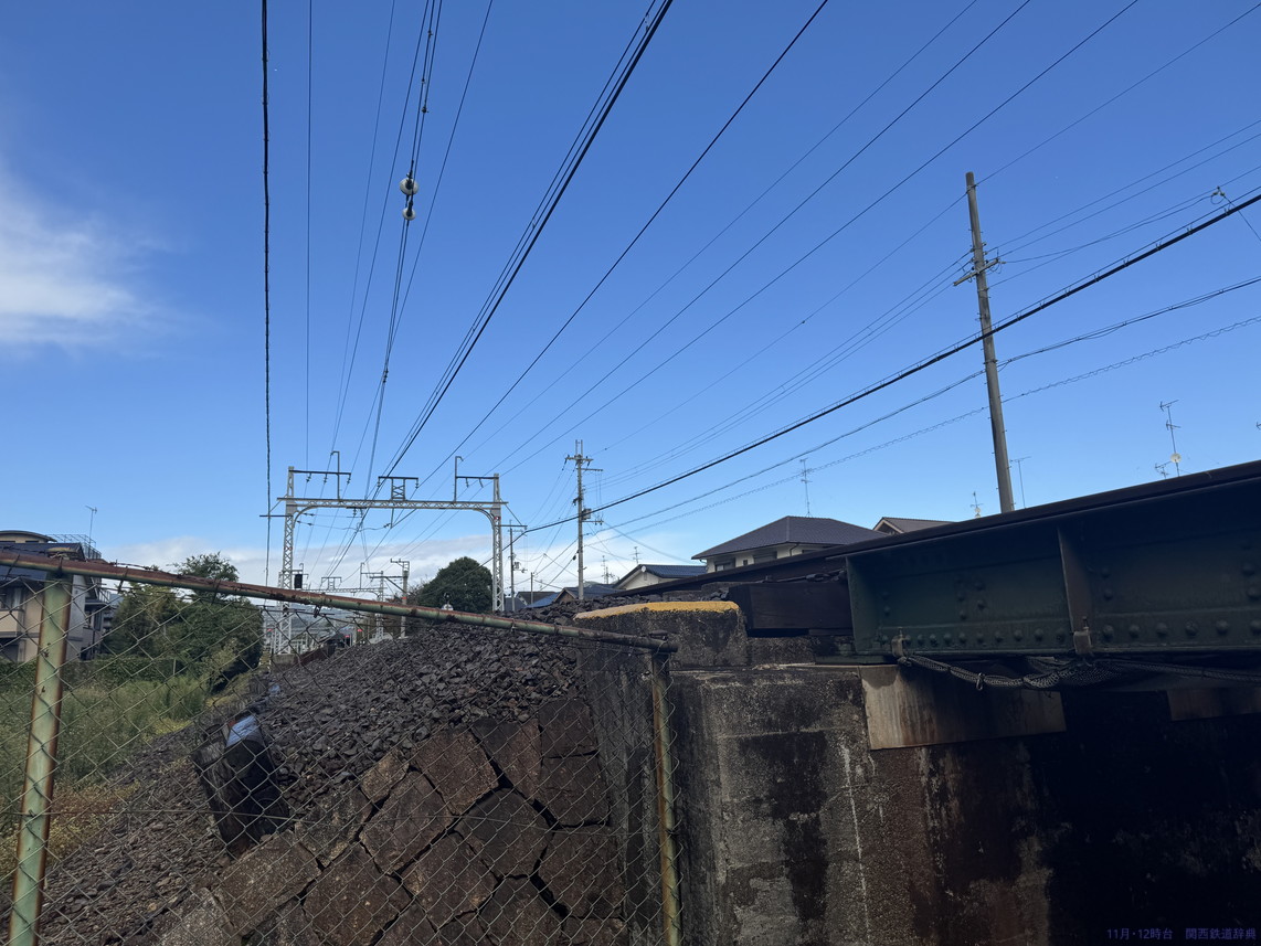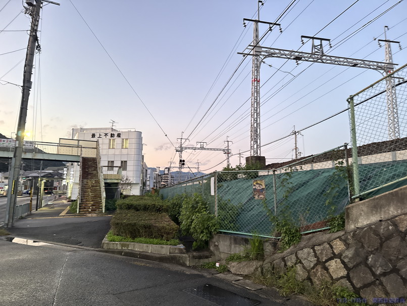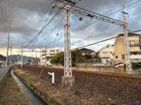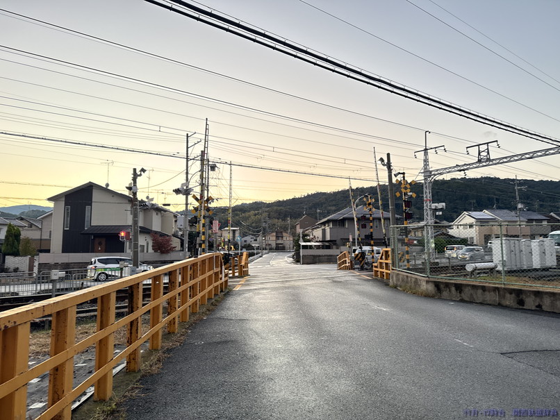 駅間の途中で府道が線路により沿ってきます。合流点にある歩道橋。架線柱はかかりますが真横から撮影できそうです
