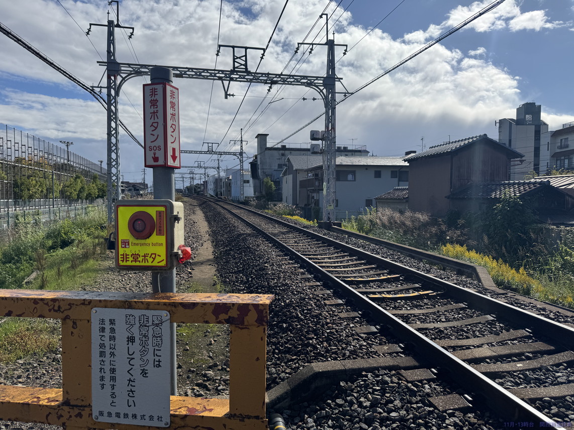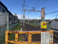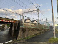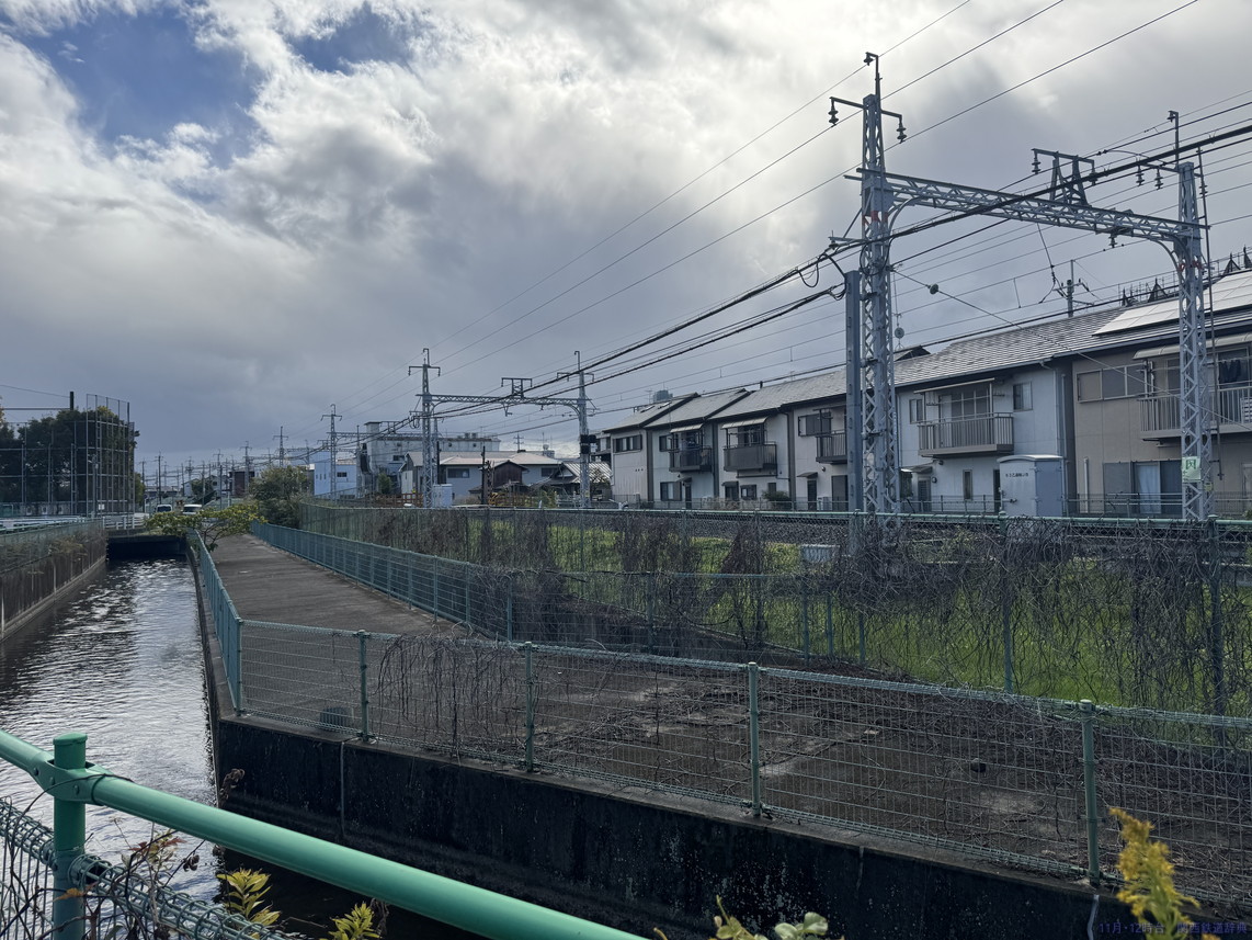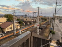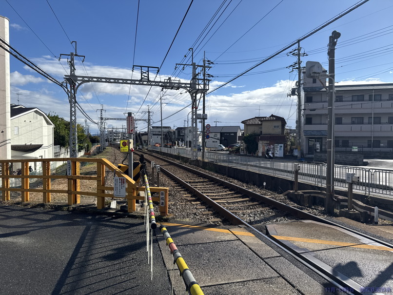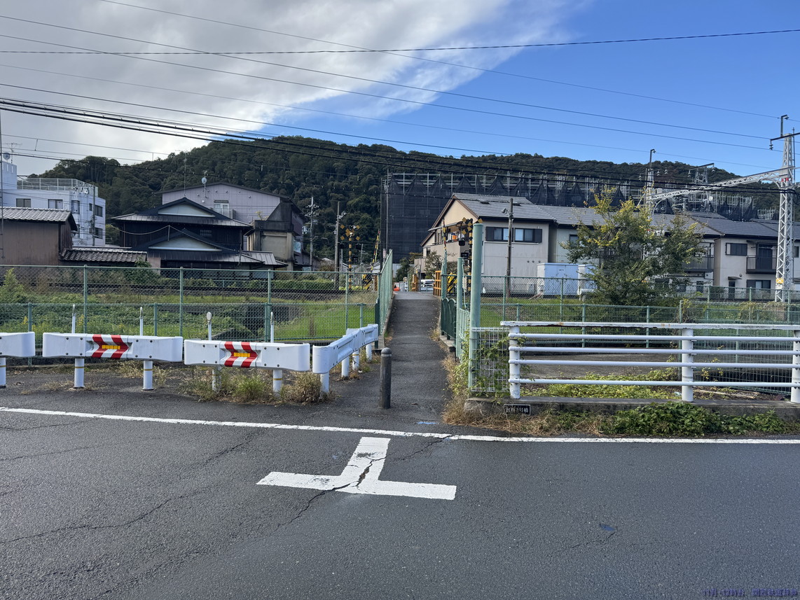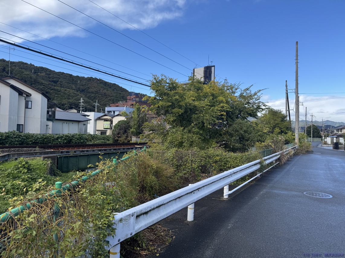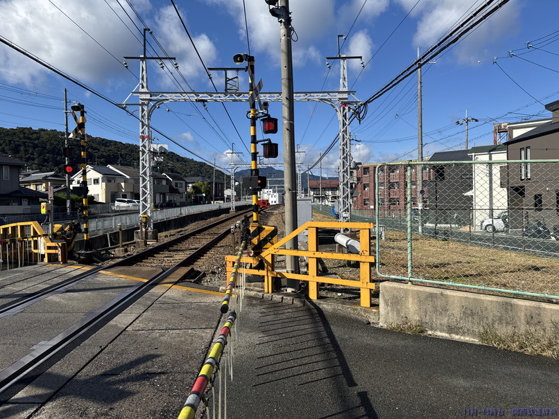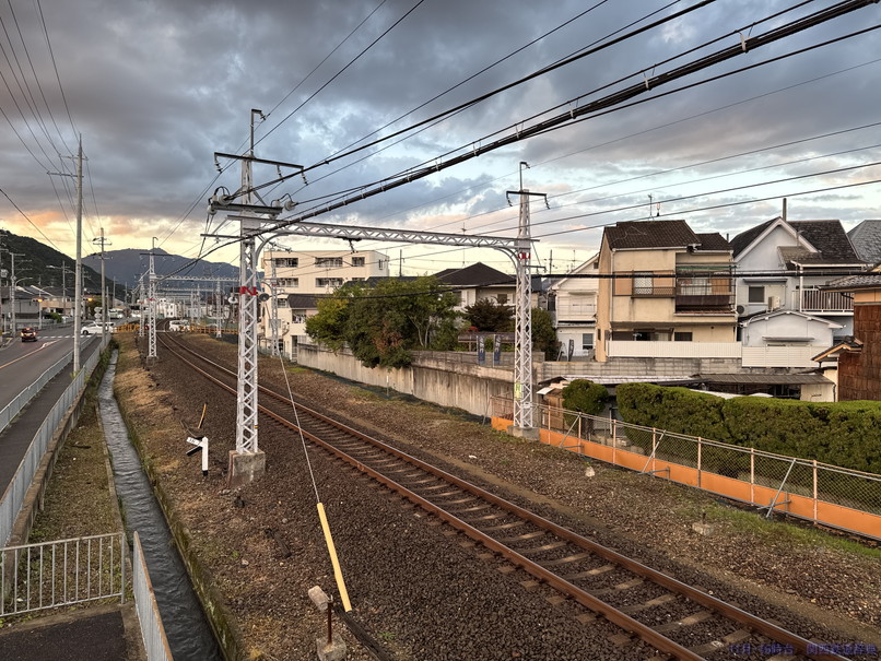 駅間の途中で府道が線路により沿ってきます。合流点にある歩道橋。架線柱はかかりますが真横から撮影できそうです