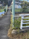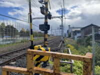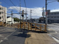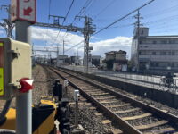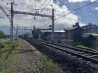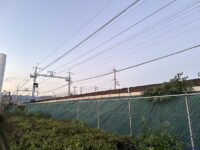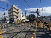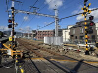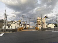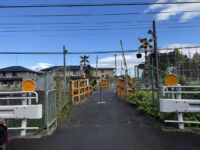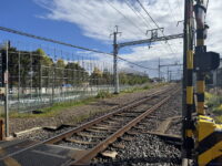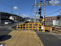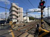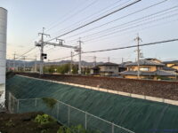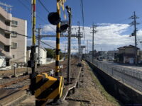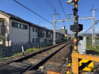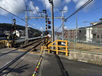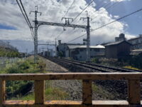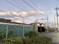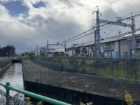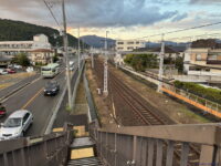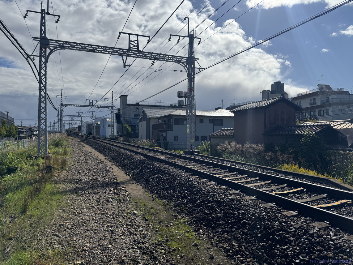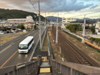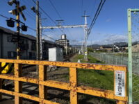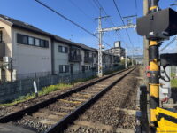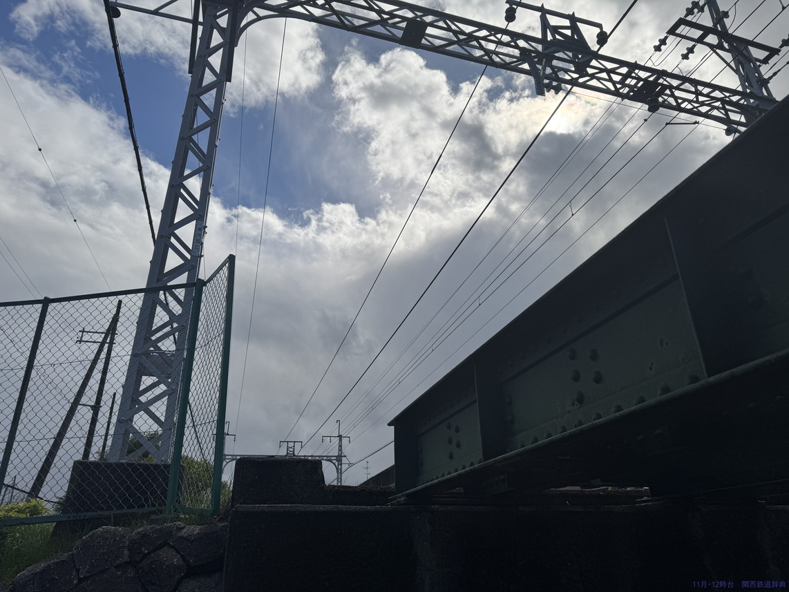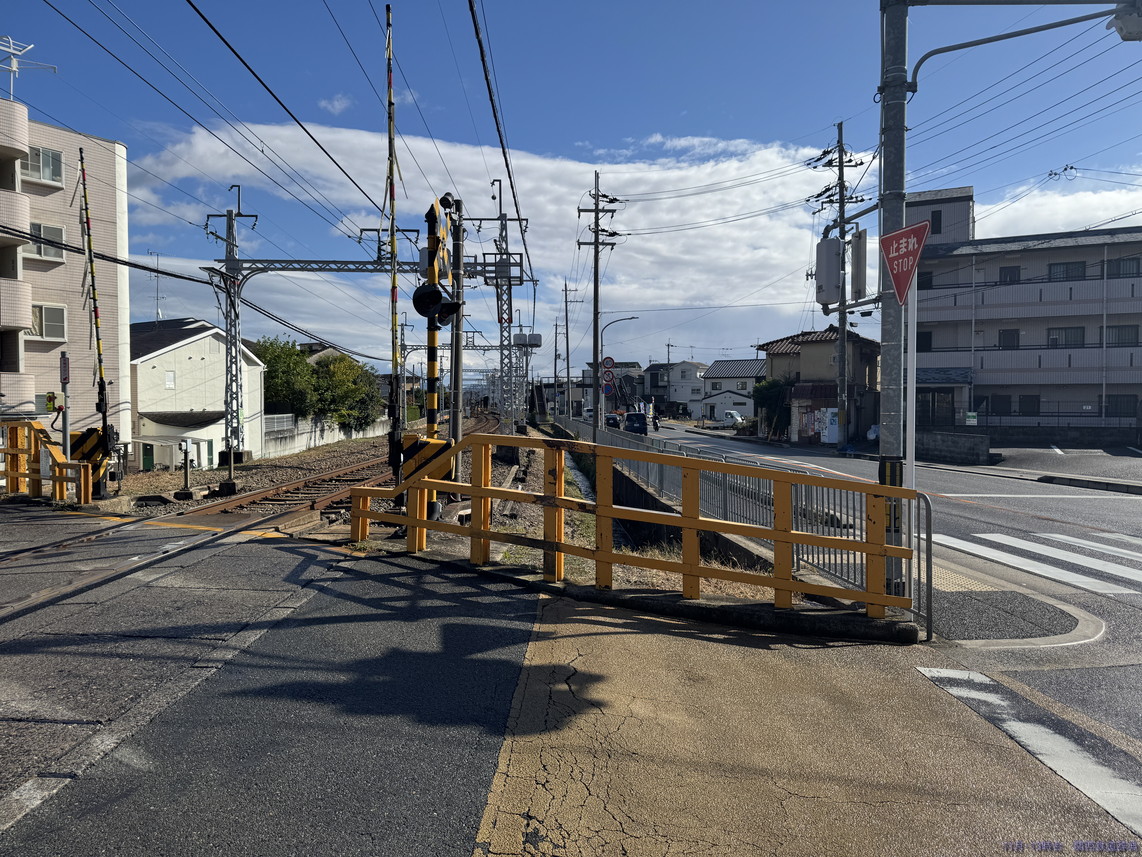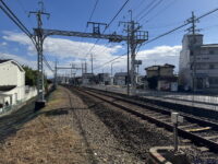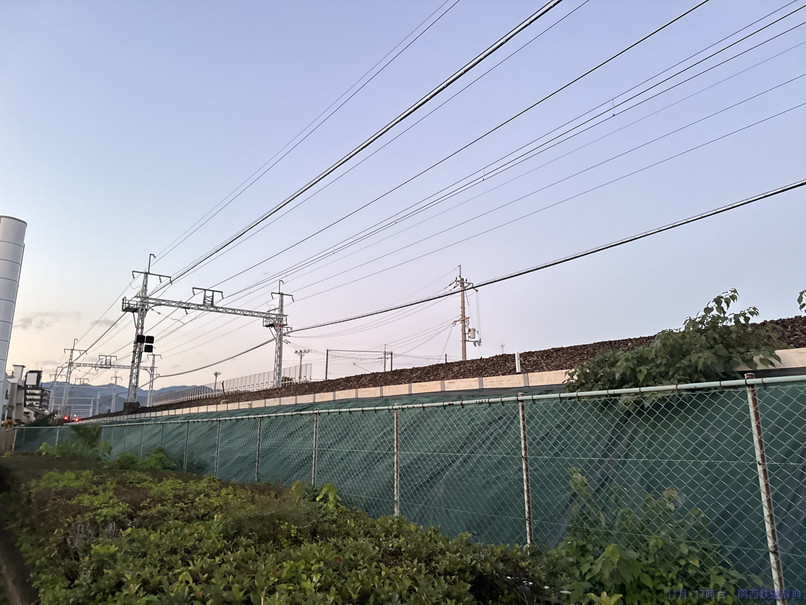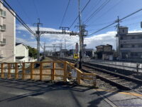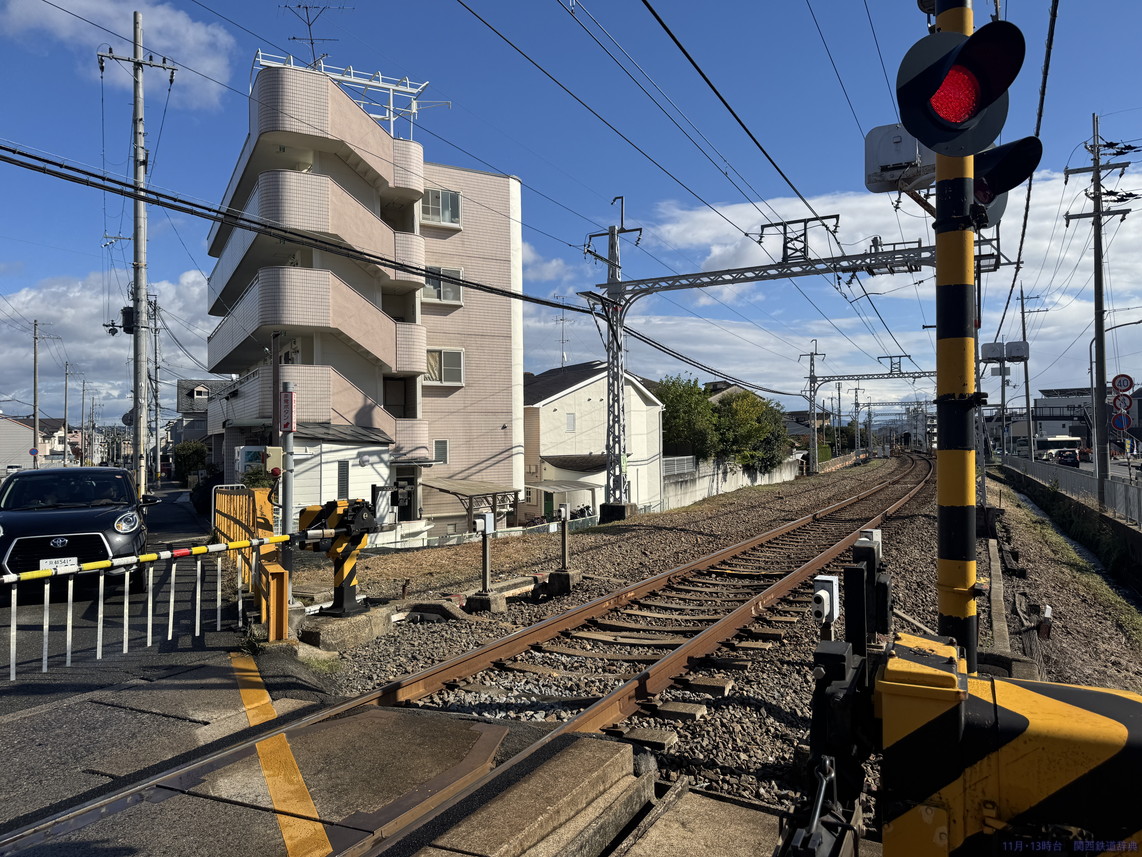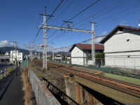 駅間の途中で府道が線路により沿ってきます。合流点にある歩道橋。架線柱はかかりますが真横から撮影できそうです