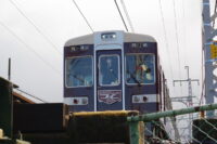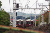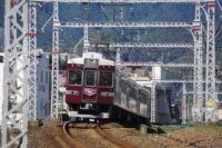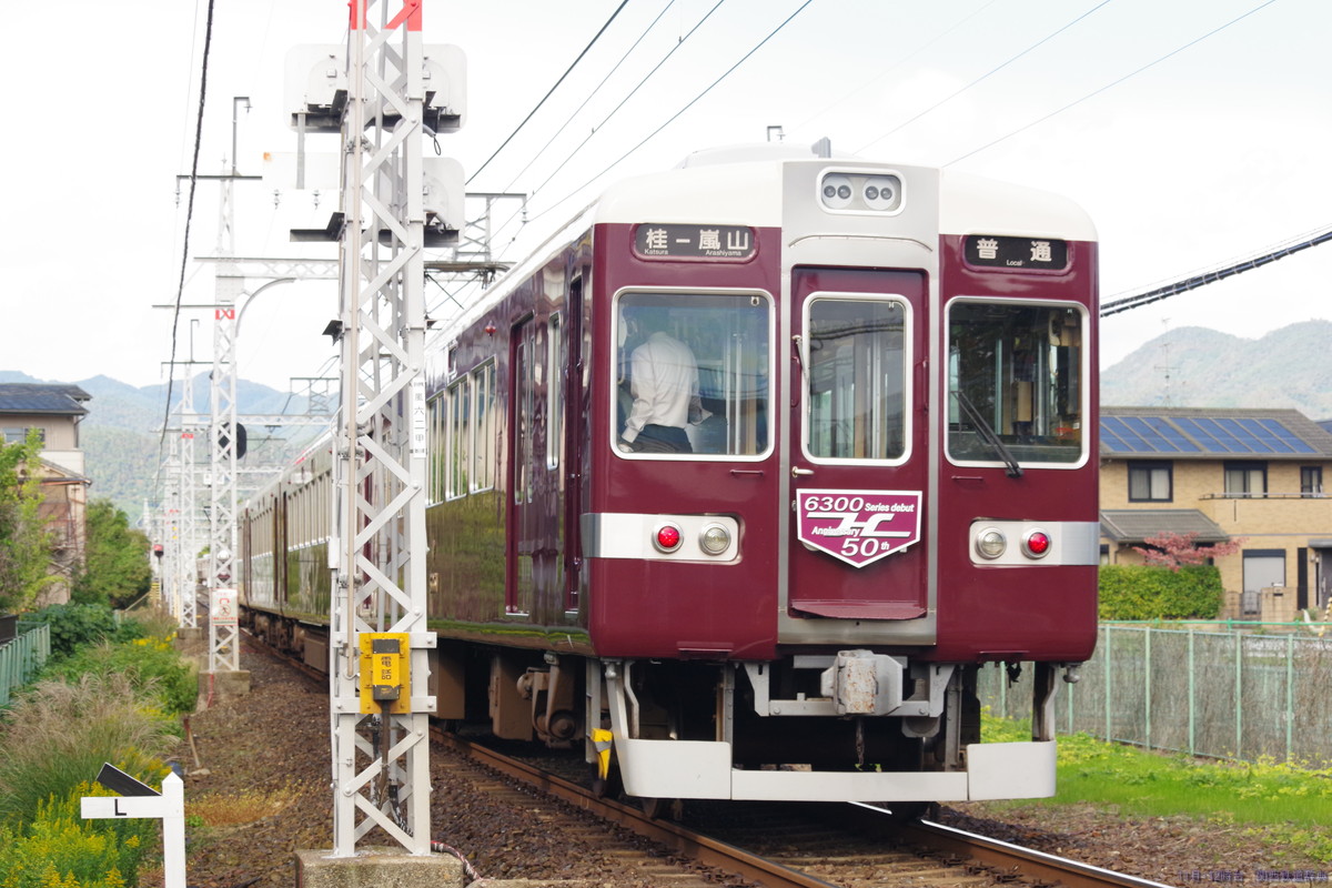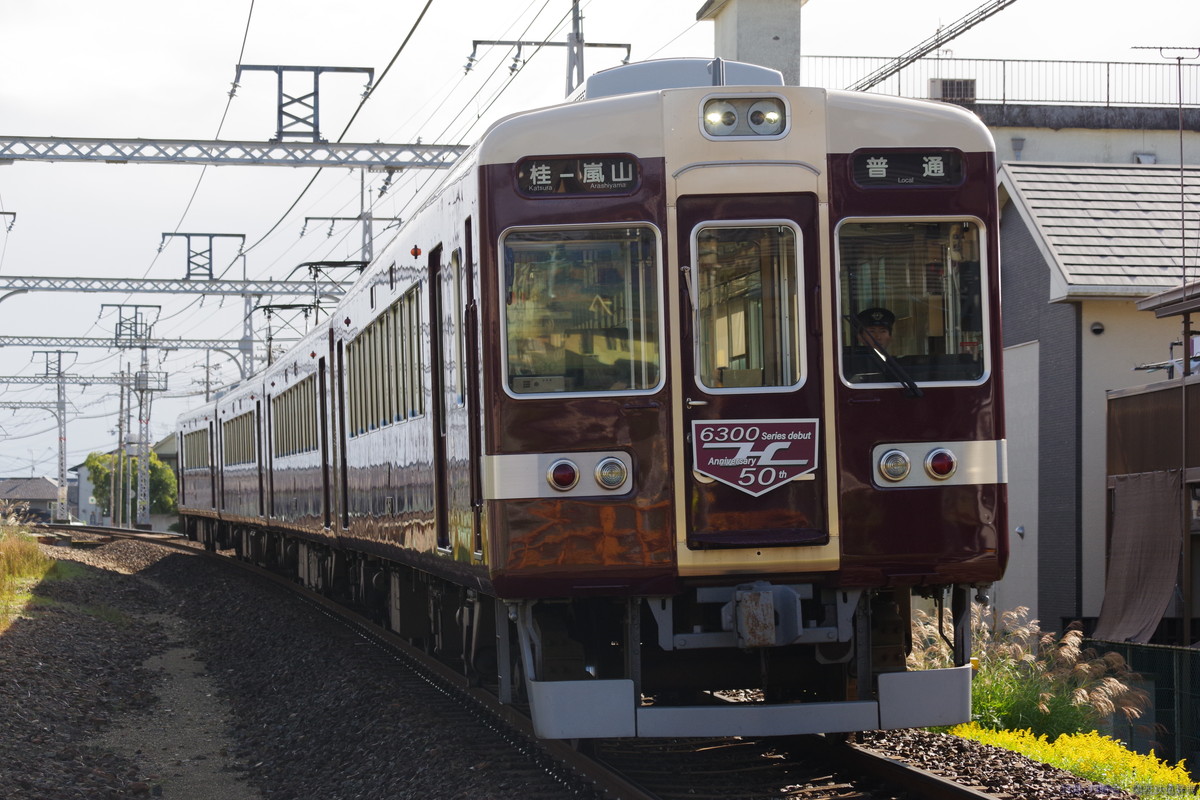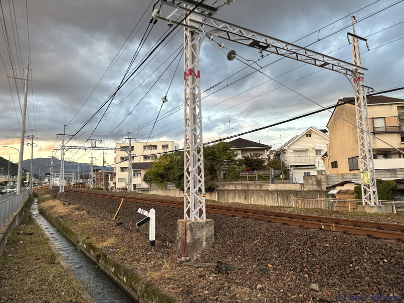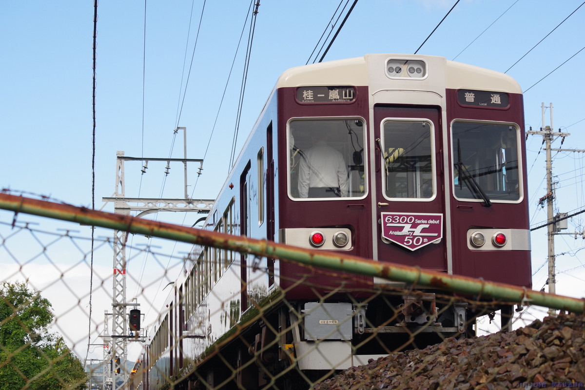 松尾大社駅付近からの撮影。松尾大社駅付近は直線で、駅間にかけて大きなカーブとなります。カーブ内側は架線柱の内側で、特に午前の桂行きの撮影に向いています。