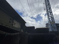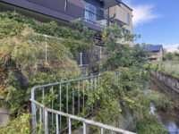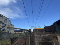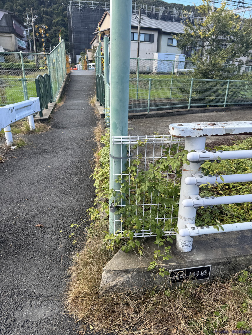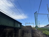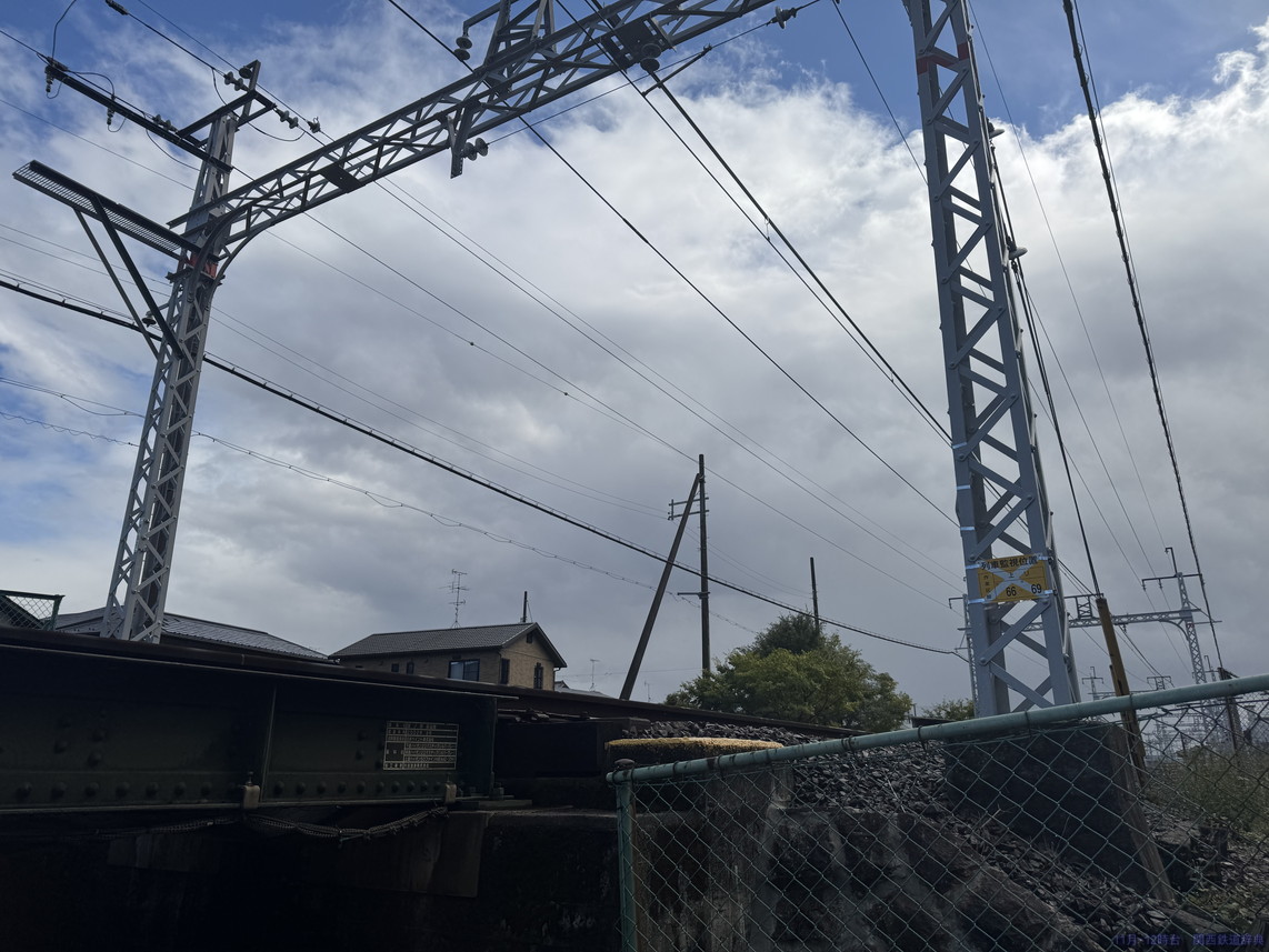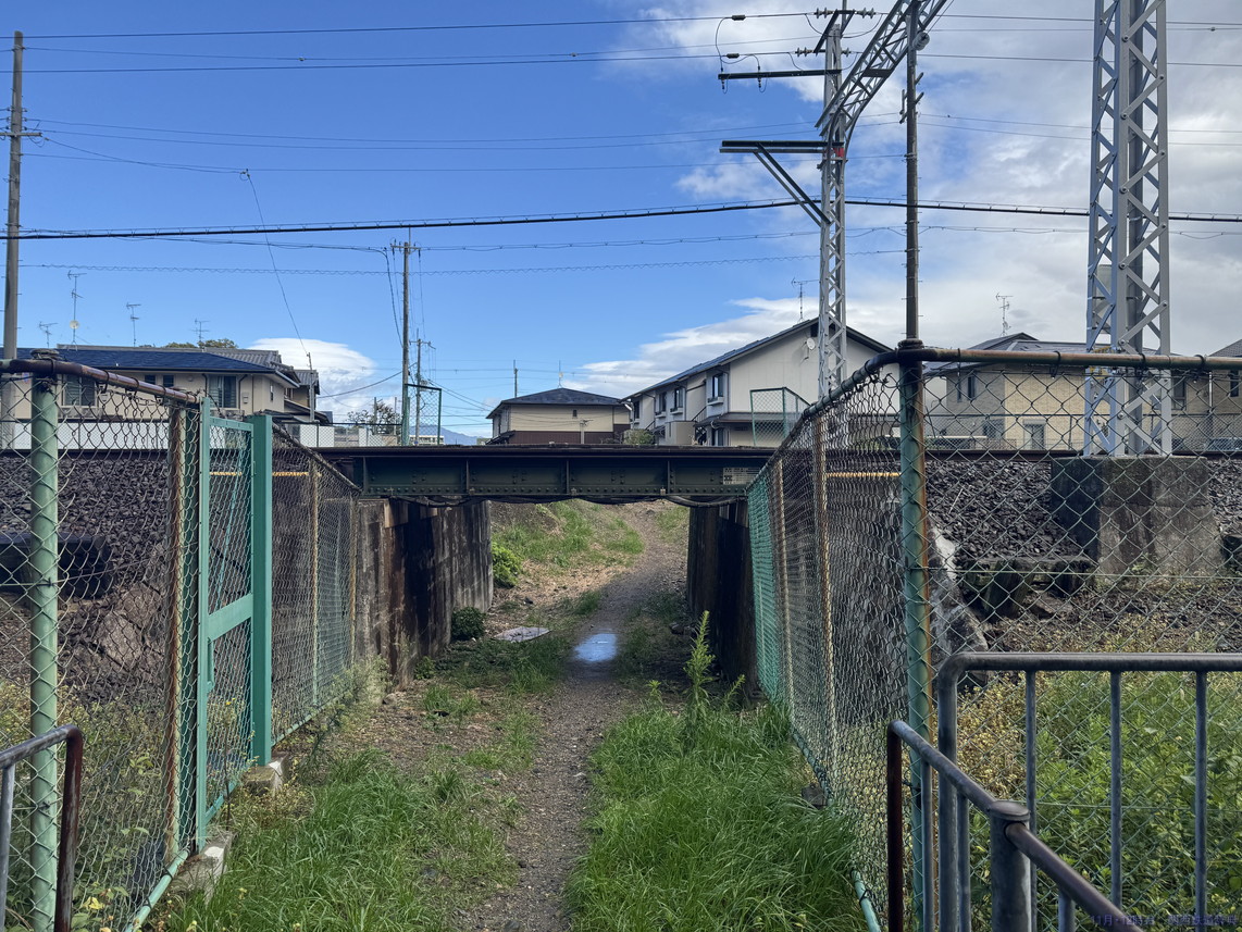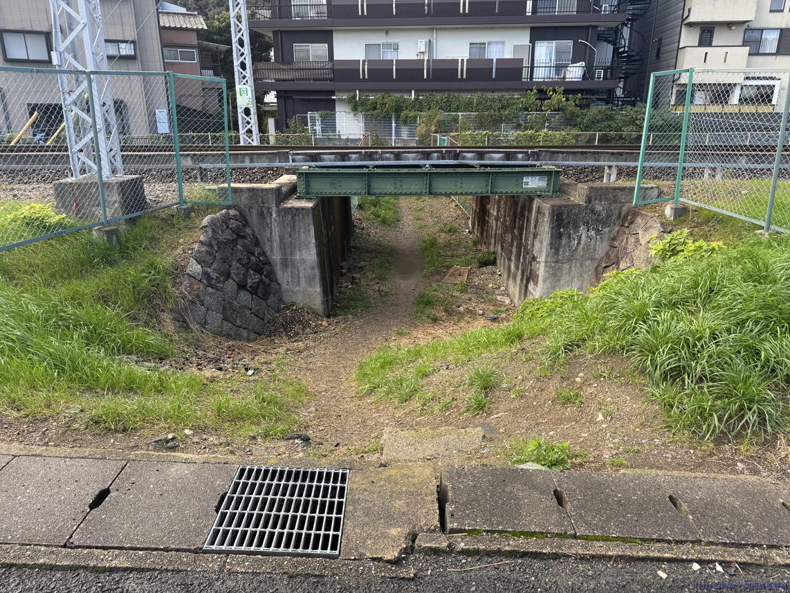避溢橋は西京極~桂にもいくつかあり、桂川の氾濫を想定した設備のようです。普段は水が流れていません。というか横の道路は線路と同じ高さなのに、線路を潜る高さまで下りて潜る形。真下から撮るのもそれはそれで。