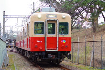 市道・鳴61号線の陸橋上(名称は「11号橋」か「遊覧橋」のいずれか)から撮影。武庫川線を俯瞰で撮影できる数少ないポイント。線路の上は高いフェンスだが、すぐ横は普通の手すりになるので何の問題もなし。