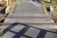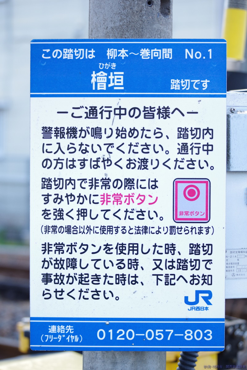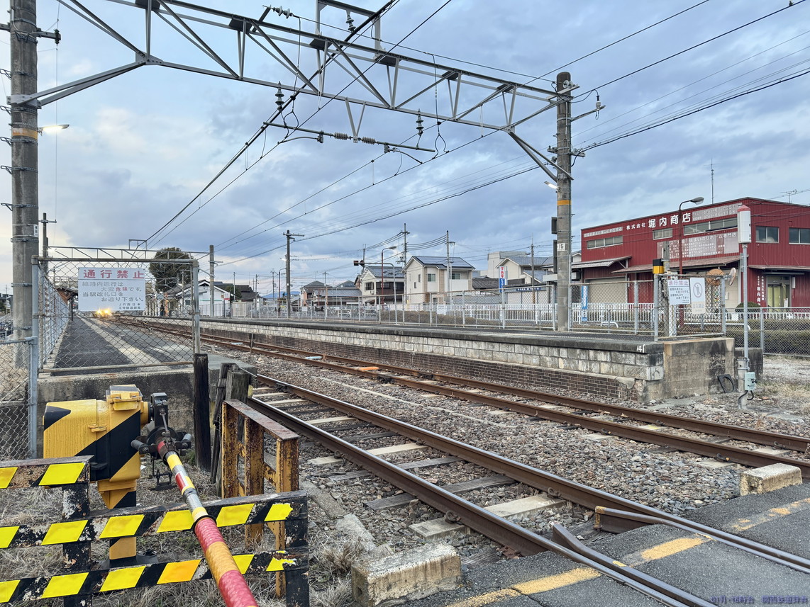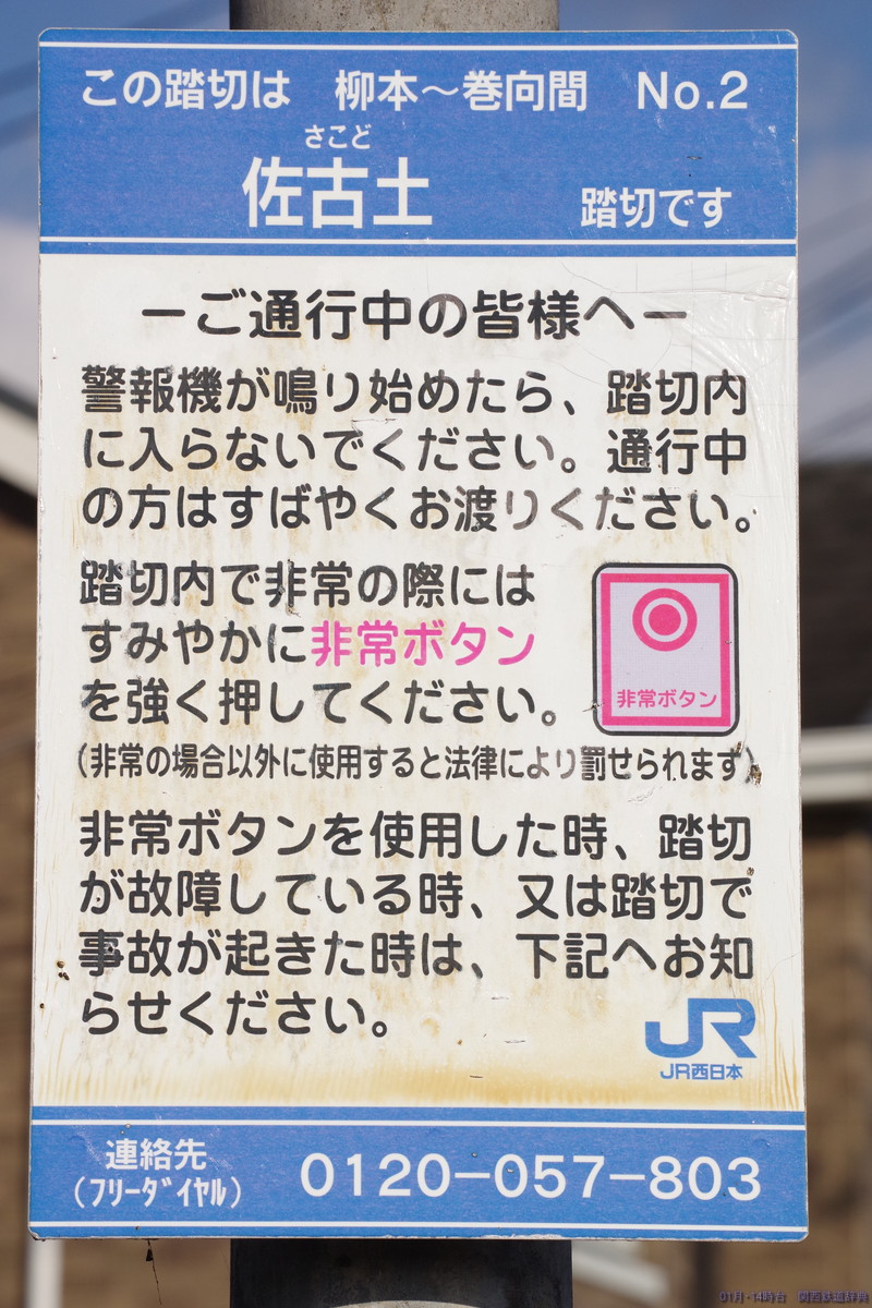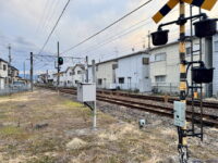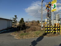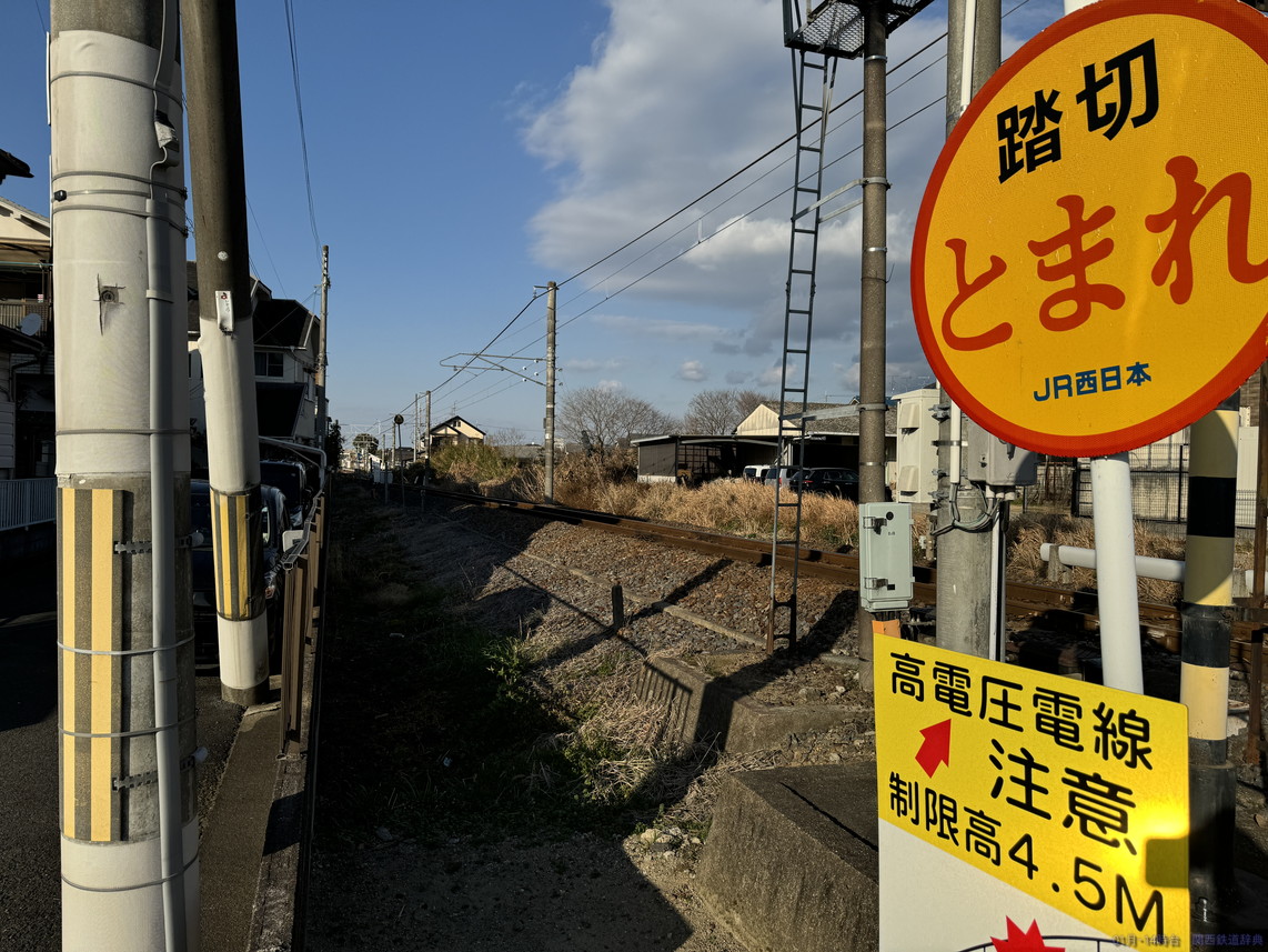 柳本駅のすぐ南にある踏切です。ポイントの内側にあり、やはりすぐ南で単線になります。奈良行き列車の撮影については、架線柱は被らないものの信号柱や機器箱の柱で撮りにくいと思われます。