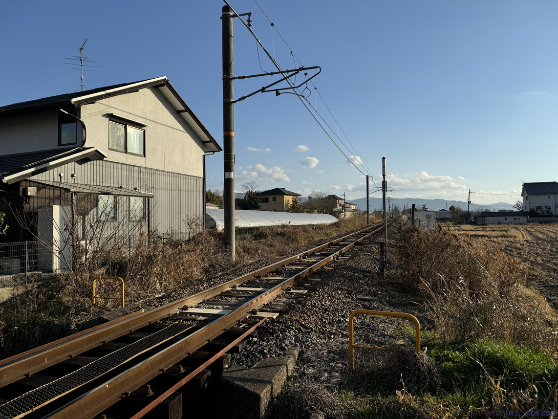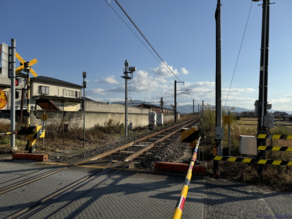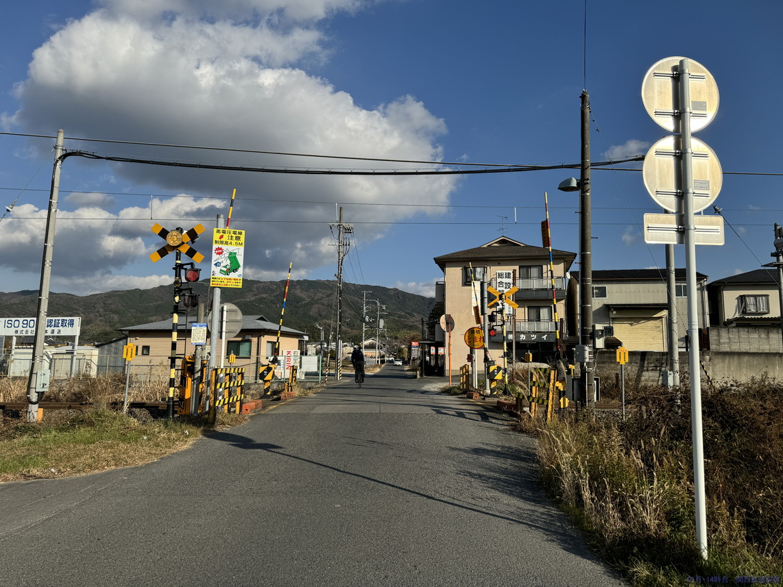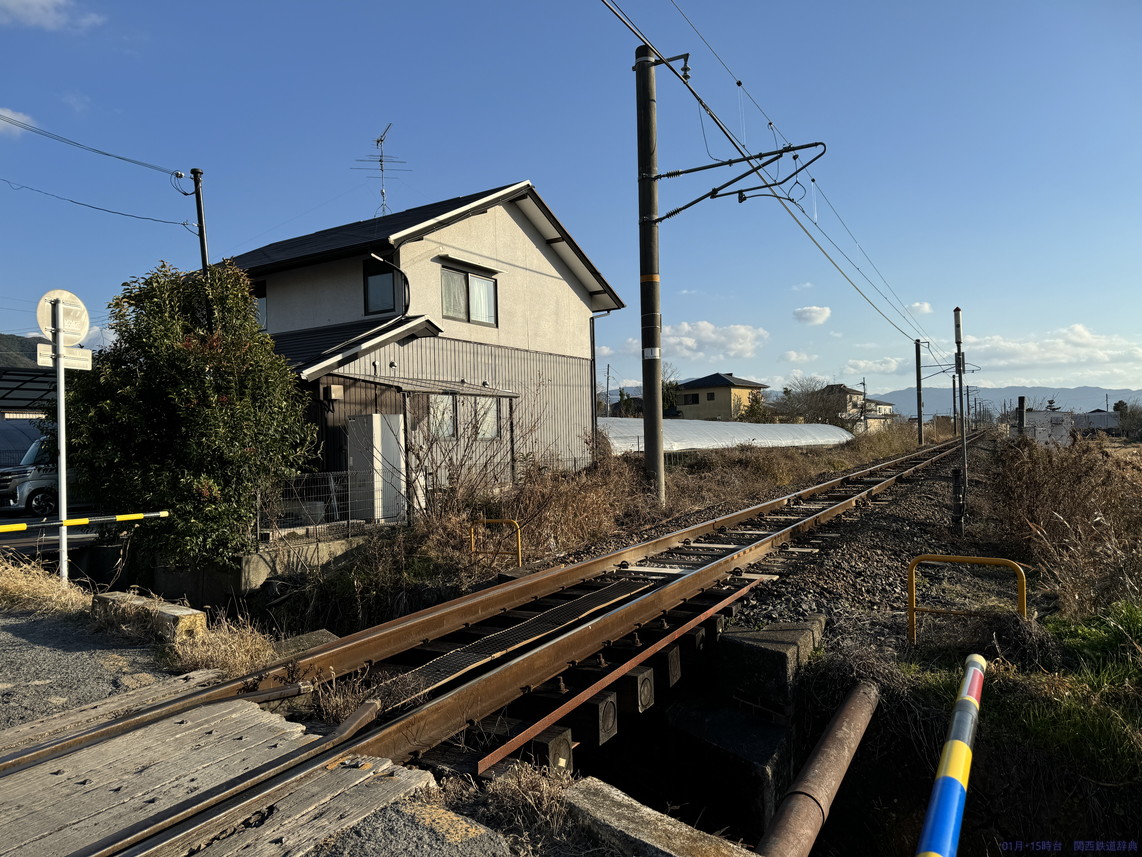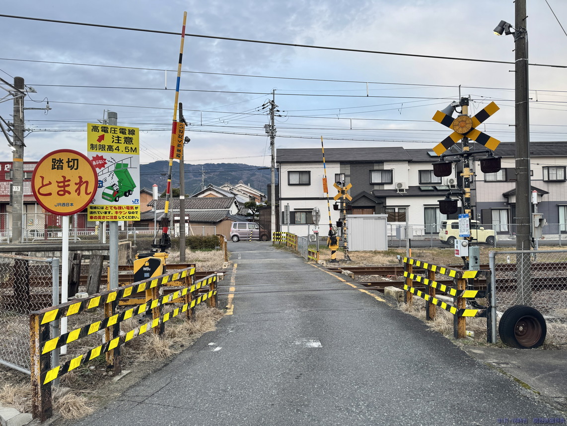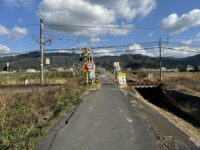 この踏切ではもう単線になっています。柳本の集落はここまでという感じで、道路の南側には農地が広がりだしますが、まだ家もいくらかあります。