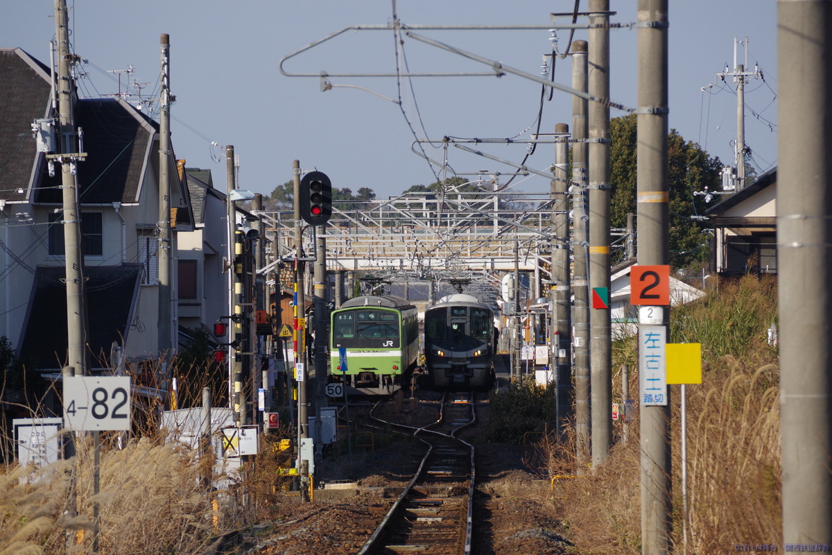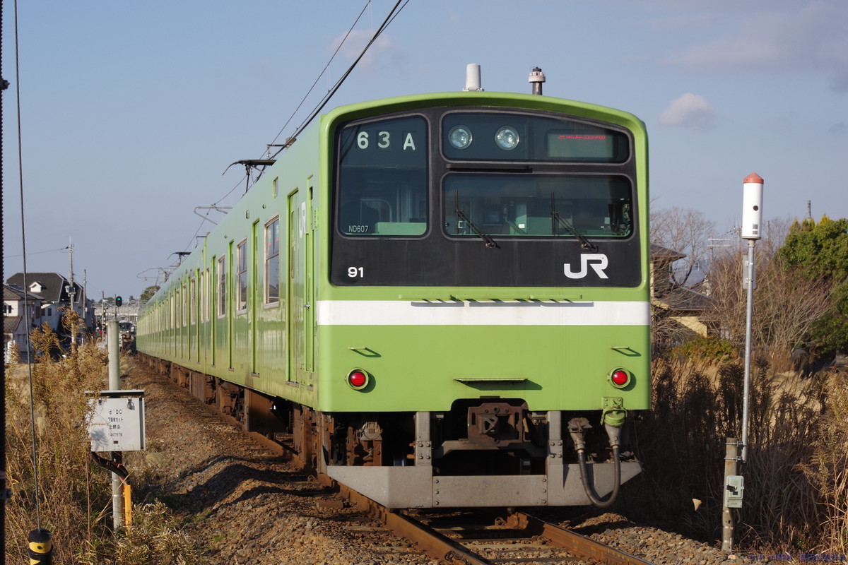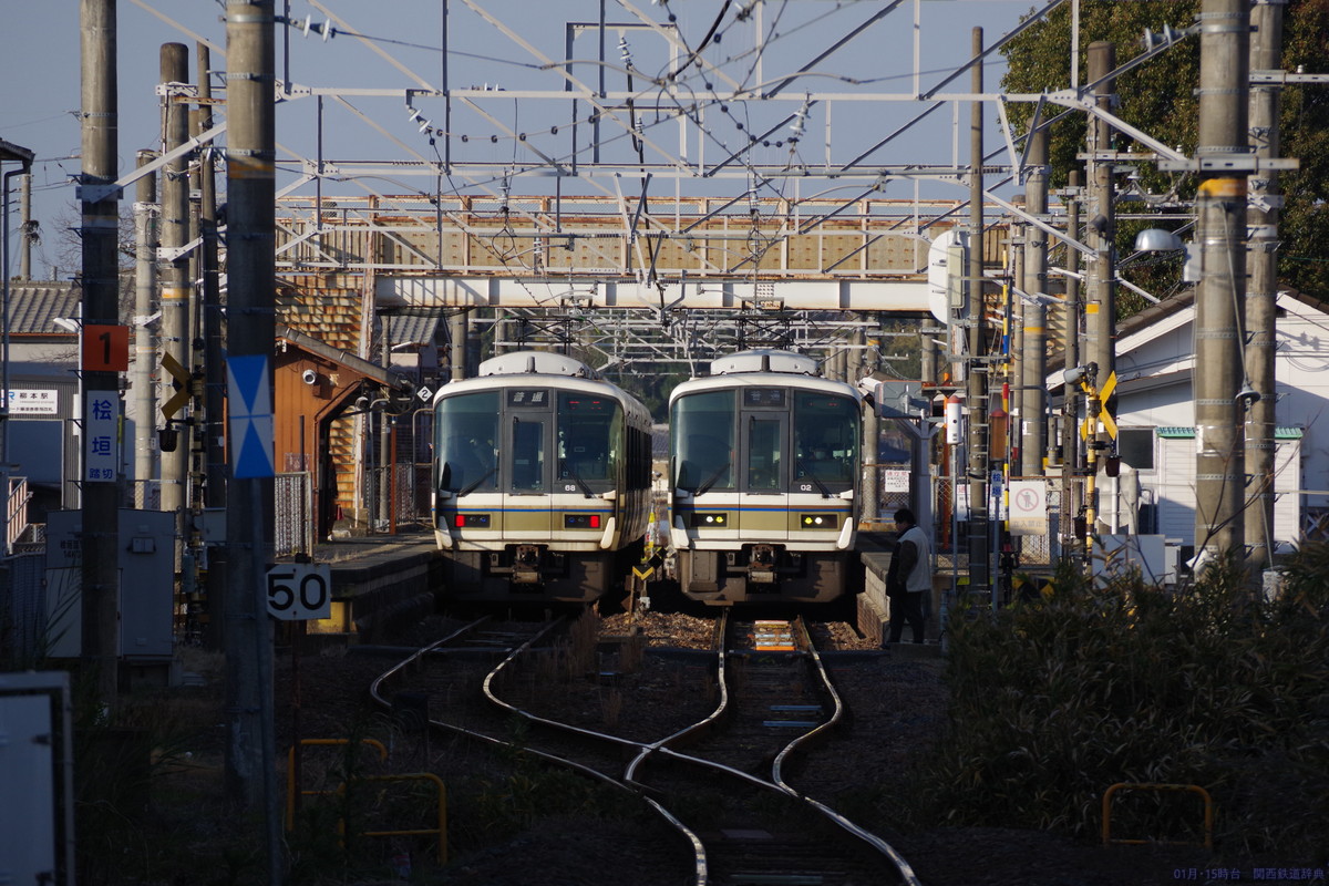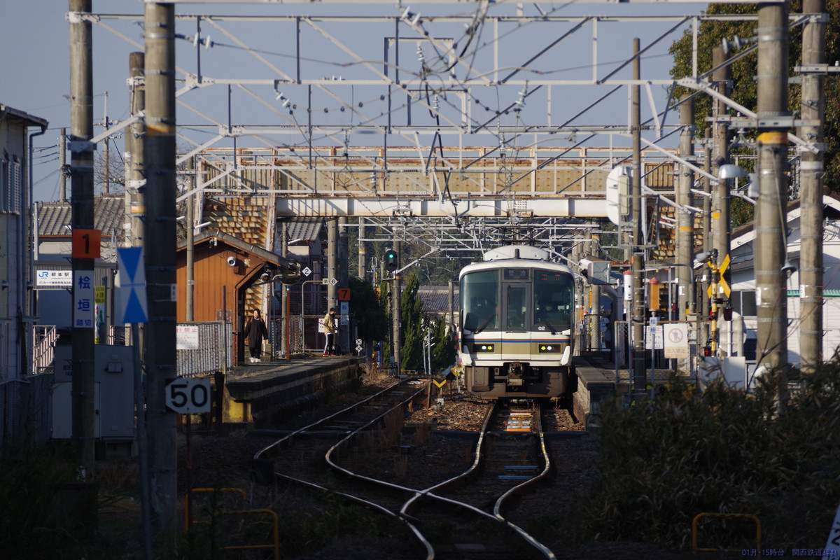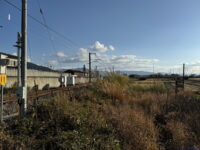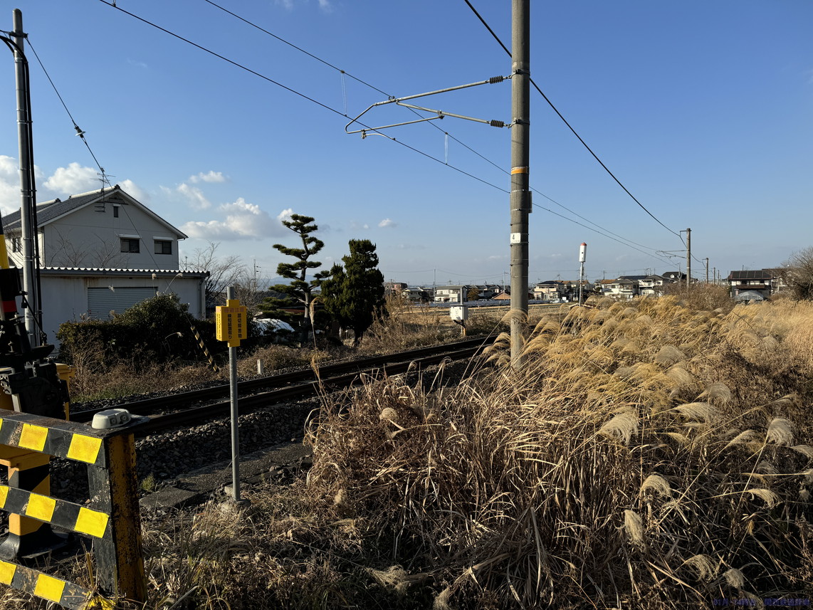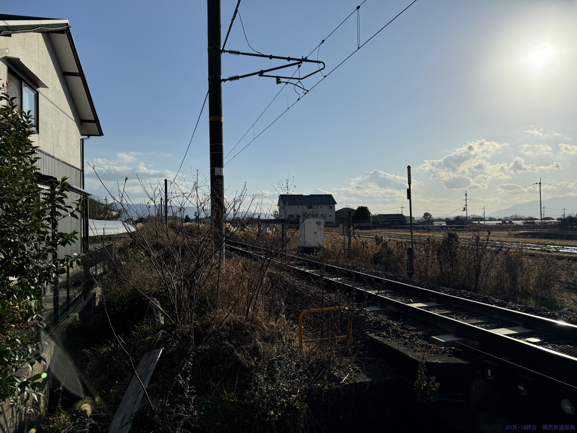 「おおがい」と読むそうです。櫟本〜天理間に「大梅(おうめ)踏切」があってややこしいですね。ここまでは道路沿いに建物があり、踏切脇からの撮影。ここも東側に架線柱なので午後向きですが、線路脇の雑草や柱でやや撮影しにくくも感じます。