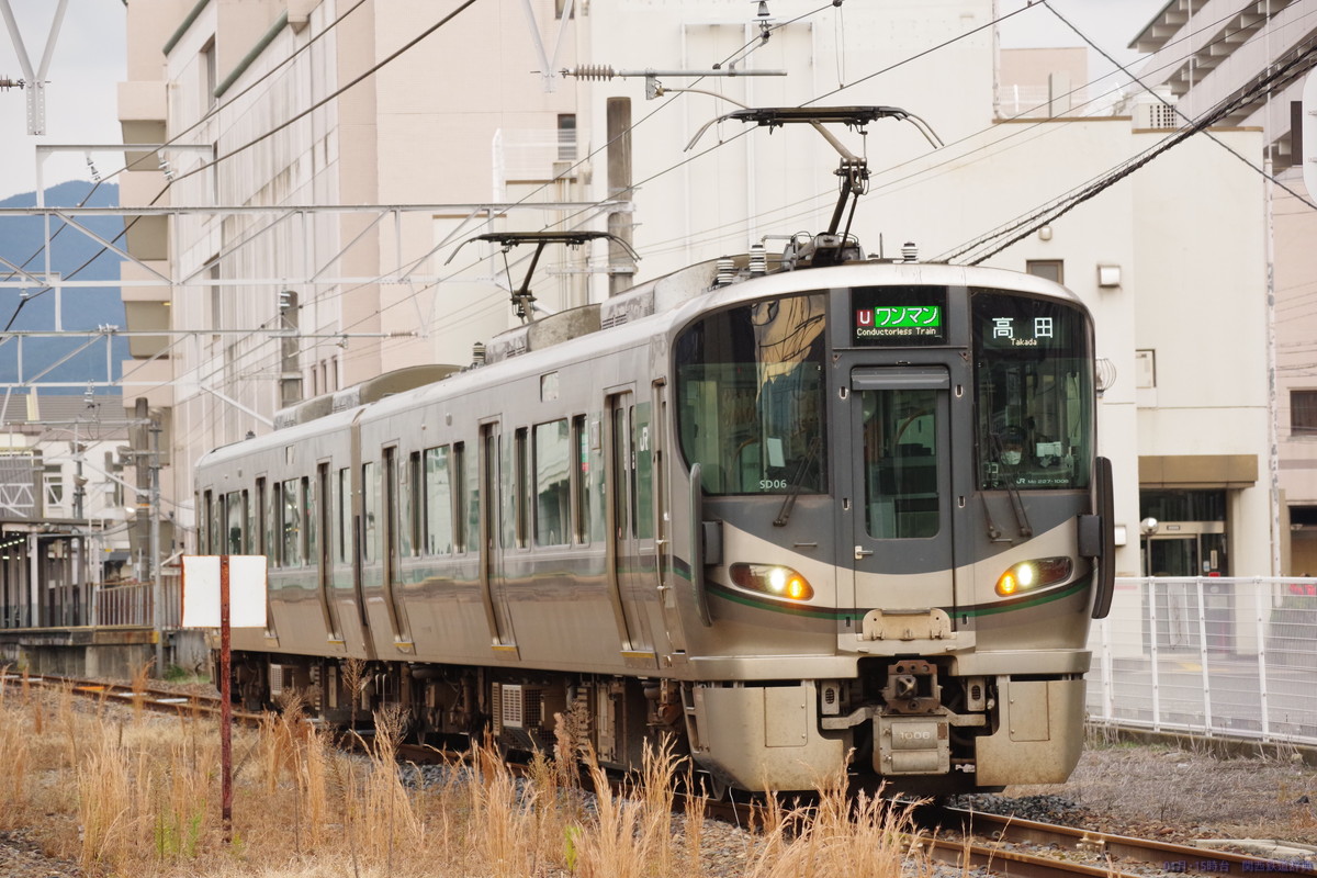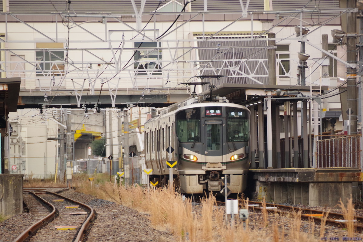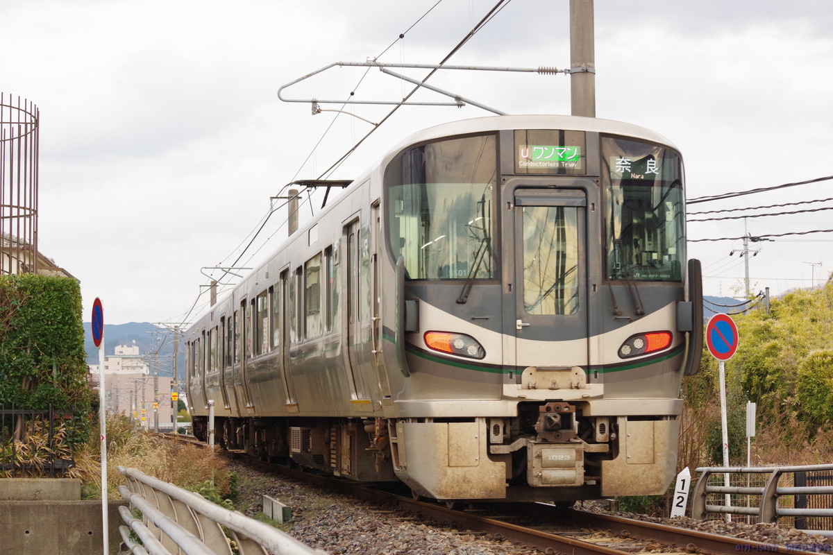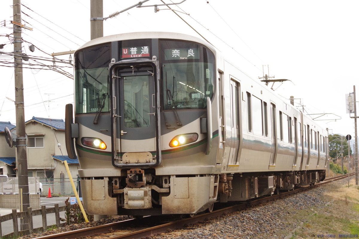 桜井線北側にに沿ってきた住宅地ですが、国道169号バイパスが桜井線をアンダーパスする場所で終わり、そこから西は桜井線と近鉄との間に広い農地が広がります。このアンダーパスの上には桜井線に沿って橋があり、ここから特に高田方向に向けて何もなく、架線柱も逆側なので撮りやすいです。ただしほぼ東西方向なので、奈良行きが側面含めて順光になるのは早朝です。