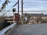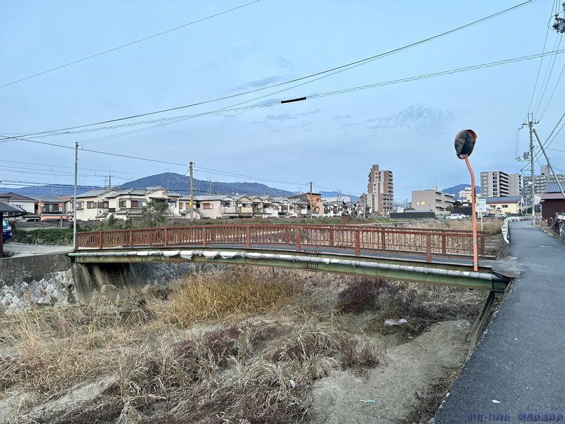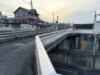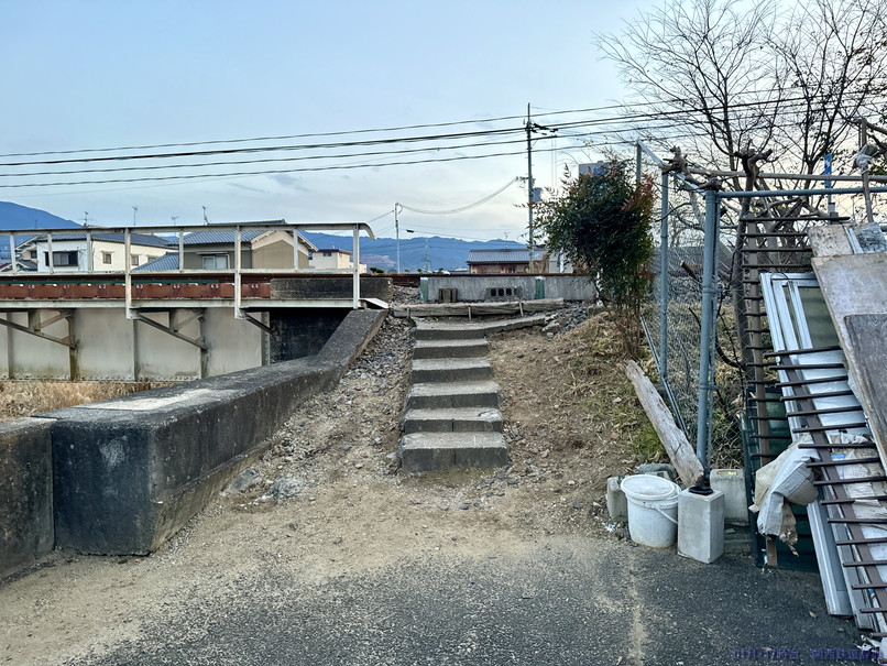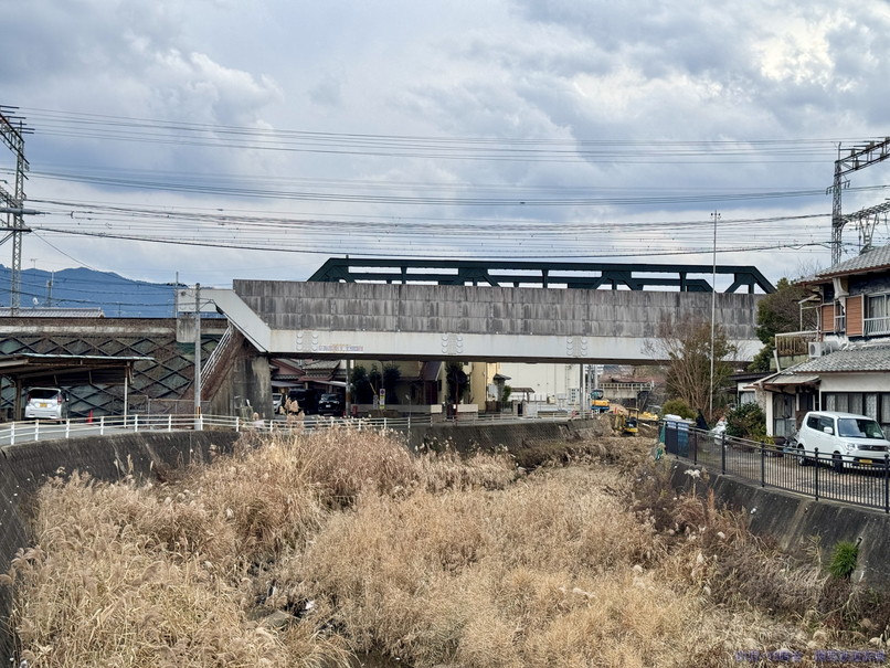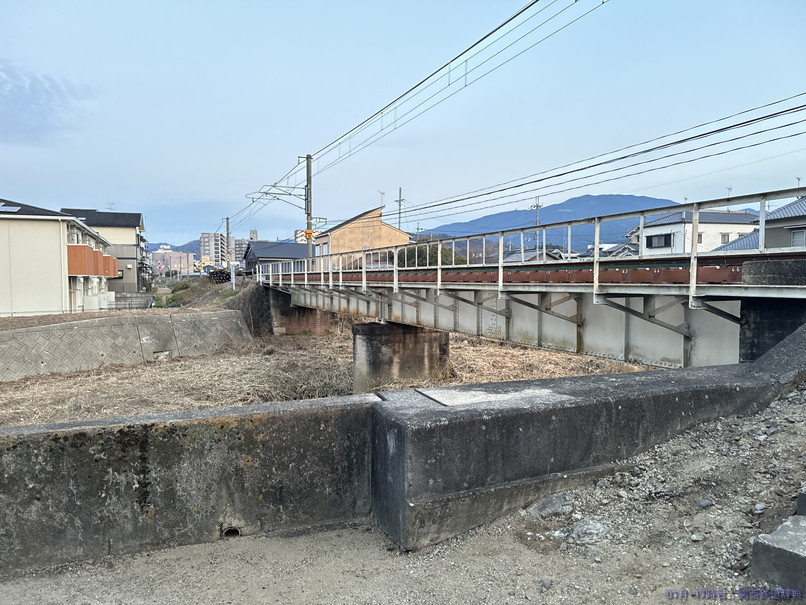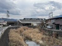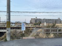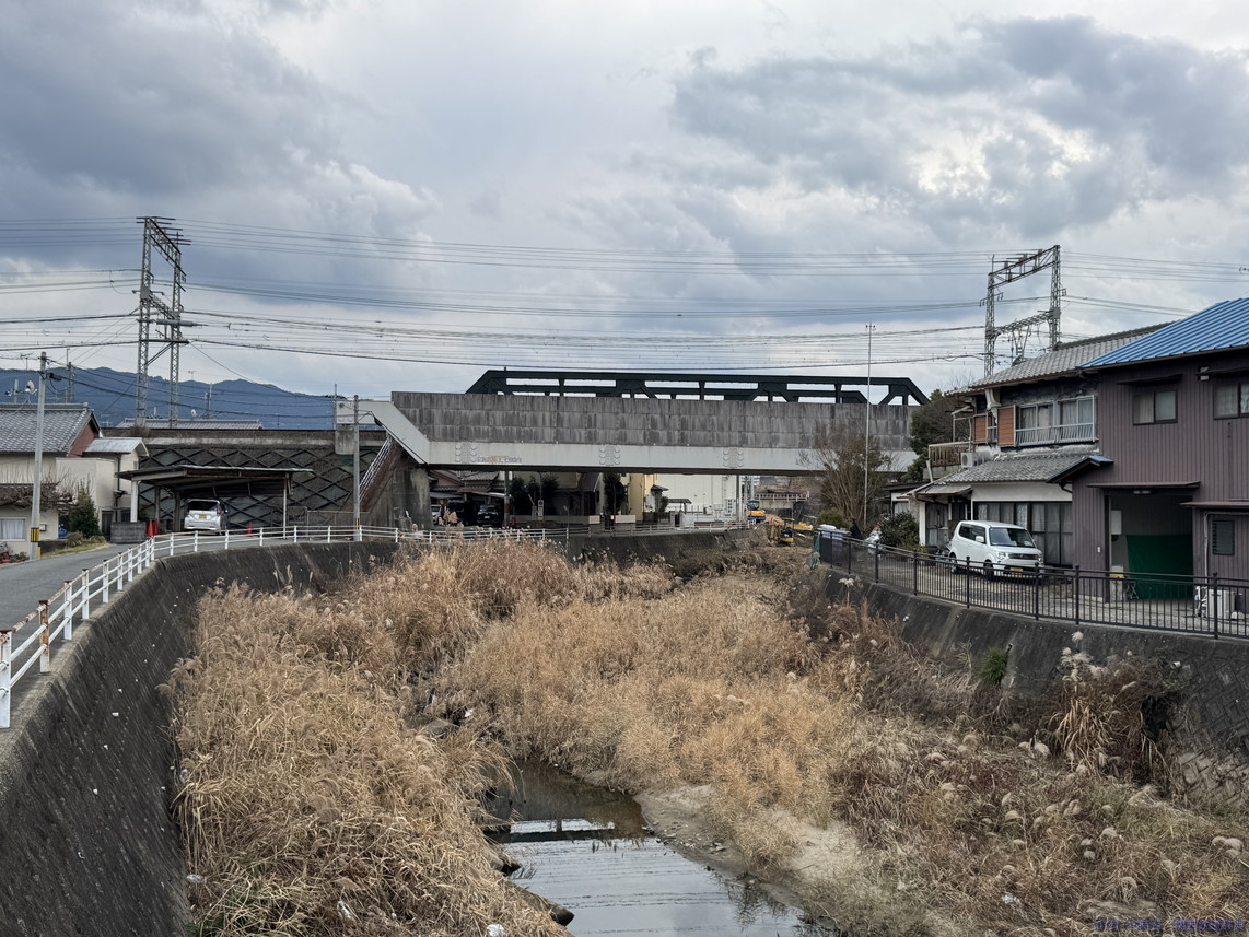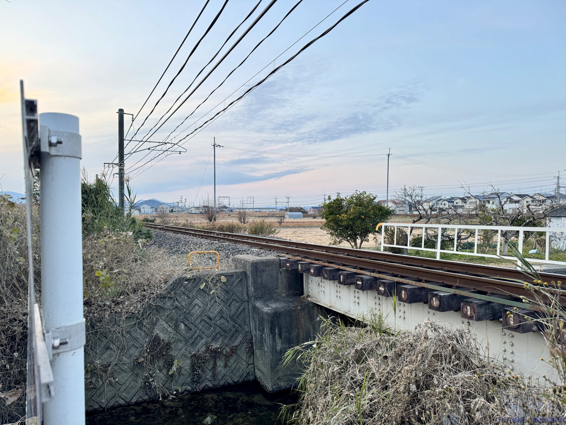 先ほどの農地から少し西に行ったところ。農地沿いの川が線路と交差するあたり。勝手踏切があって、ご丁寧にブロックで階段が作ってありました。その階段を線路に入らないくらいまで上がって奈良方を見ると、橋梁を渡る列車が撮りやすそうです。