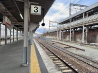桜井駅は相対式1面1線+島式1面2線の国鉄型配線で、高田方向から来る列車はほとんど外側の3番線に発着します。
