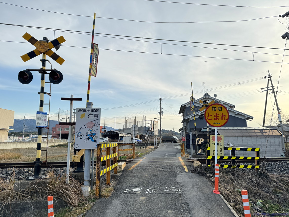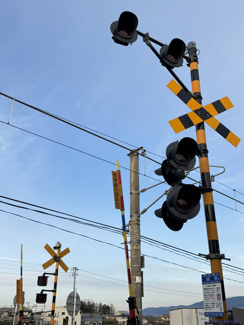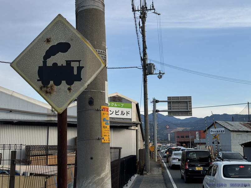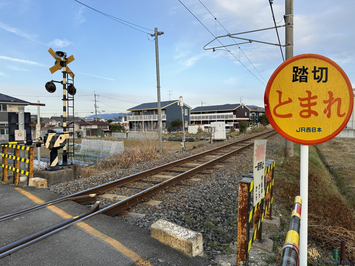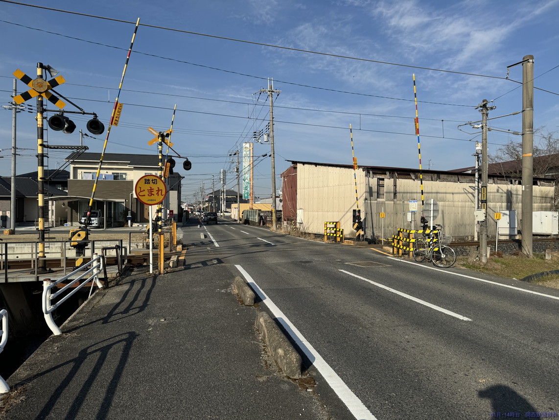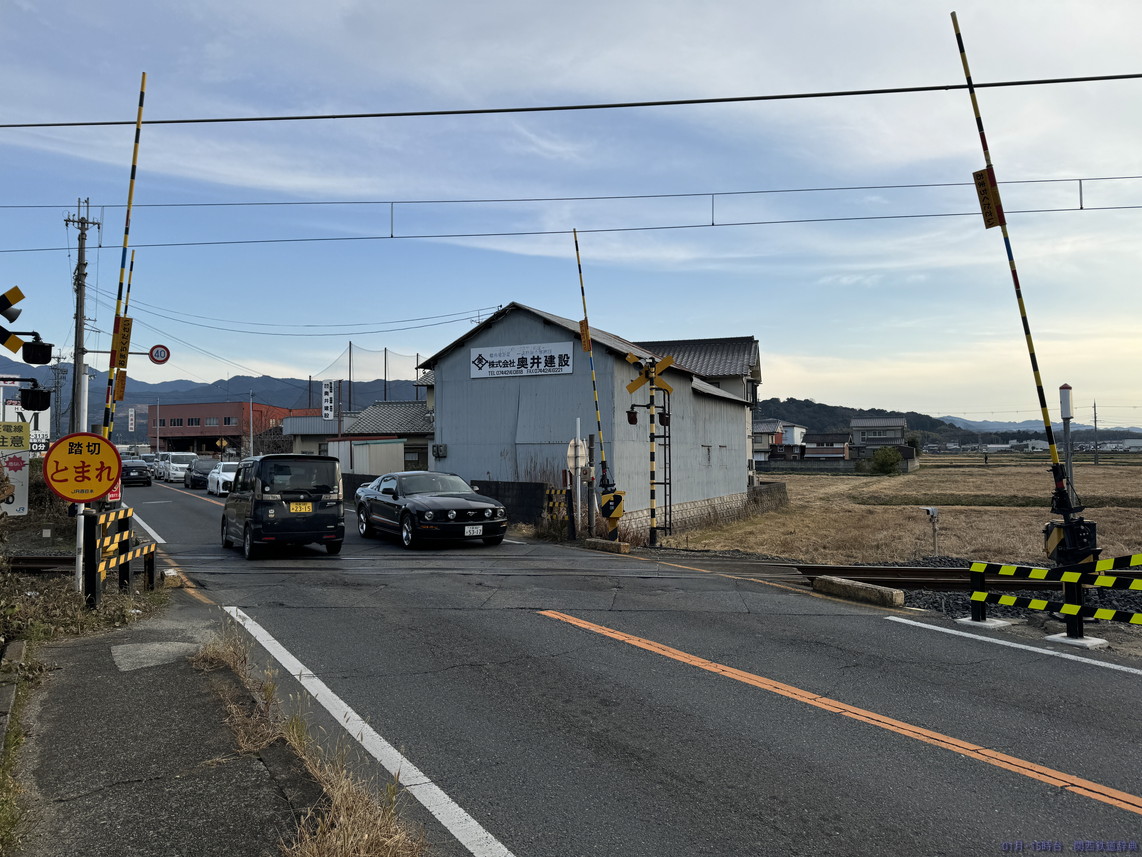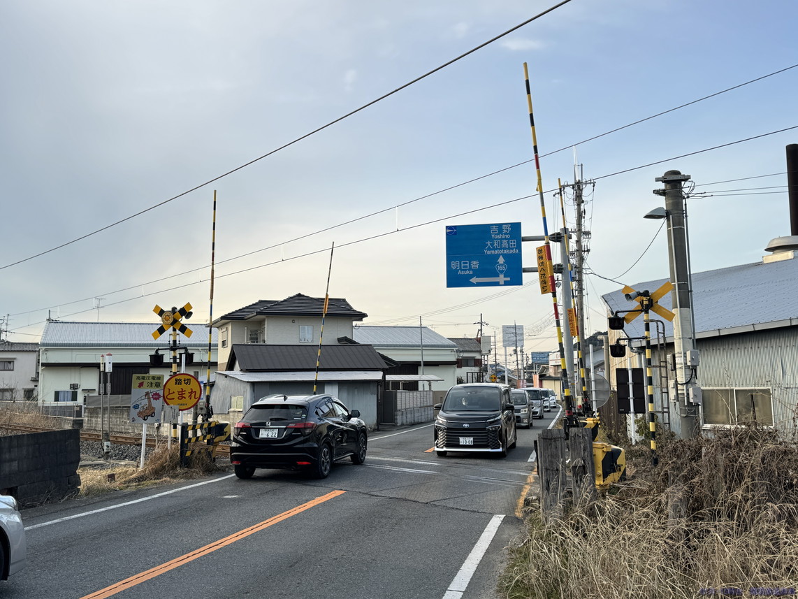 橿原(畝傍)と桜井との間で国道165号・166号・169号が三重重複していますが、その道がこの踏切から東は南側・西側では北側となり、線路と道路が入れ替わるのがこの踏切。ロードサイド店舗がかなりあるので常に混んでいそうな道です。撮れないことはないですが、ここじゃなくても感。