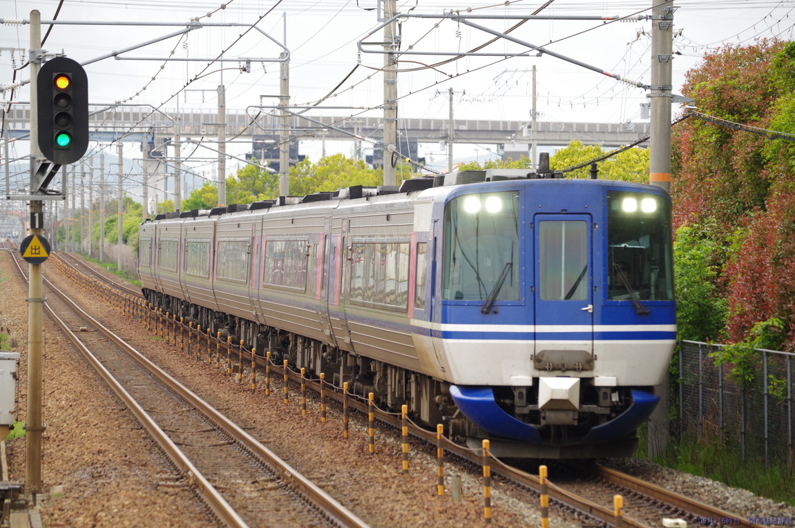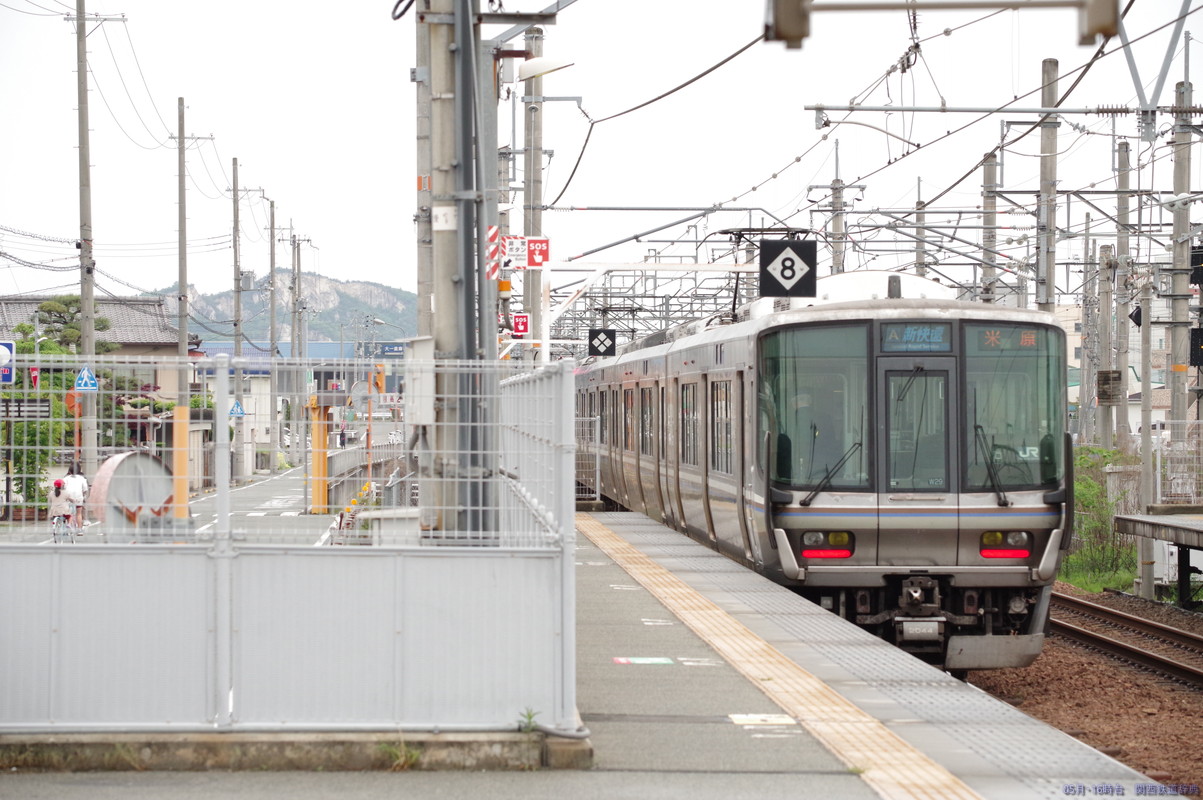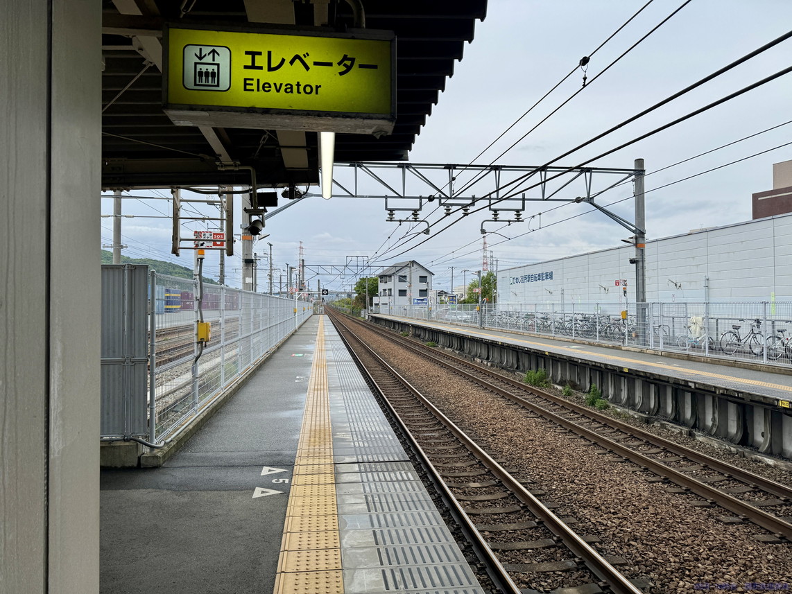下りホームからの上り列車撮影。ホーム狭めでホーム端には柱がありますが、直線区間というのもあり望遠で隙間を抜いて。