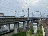 下りホームからの下り列車撮影。新幹線は橋梁ゆえか間隔が短い架線柱が気になりますね。