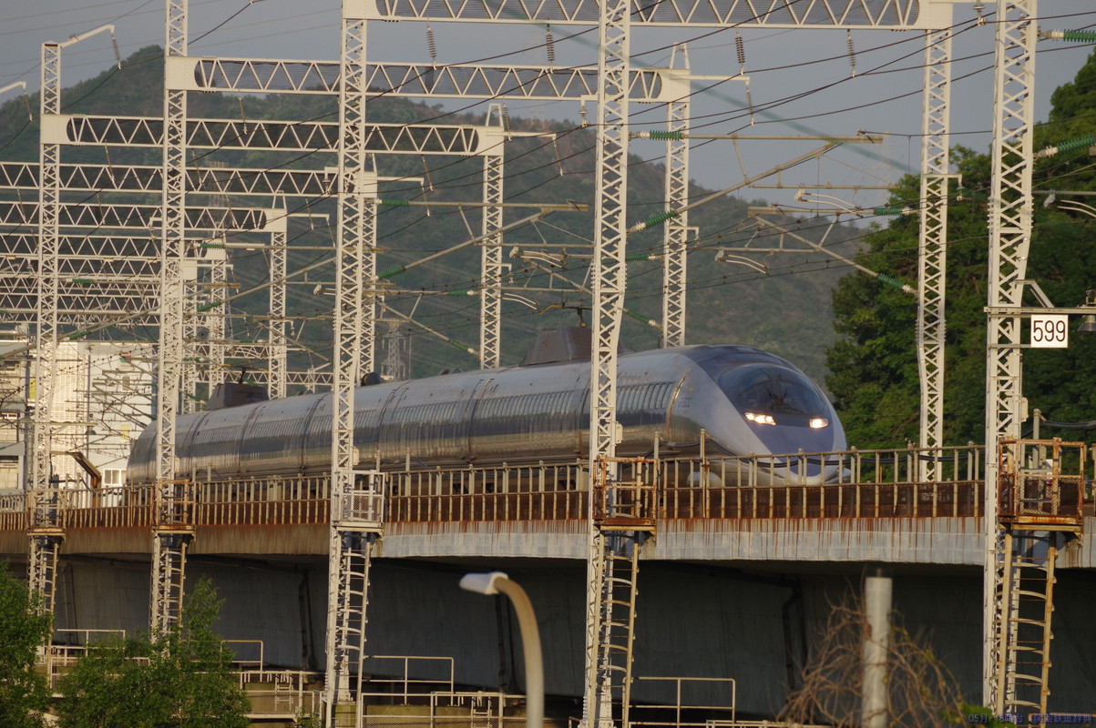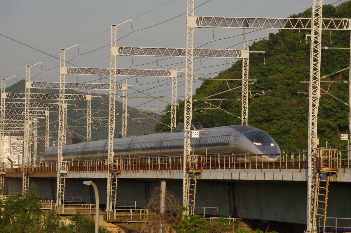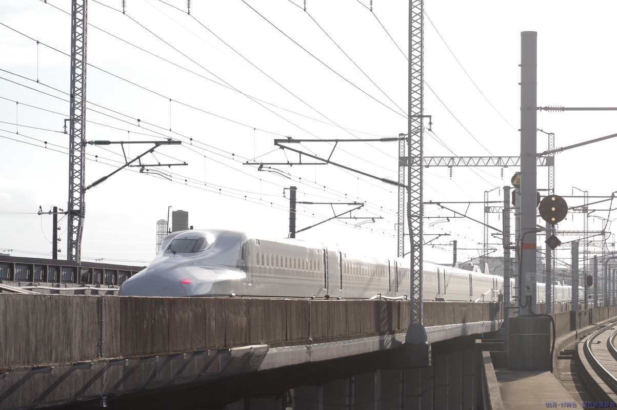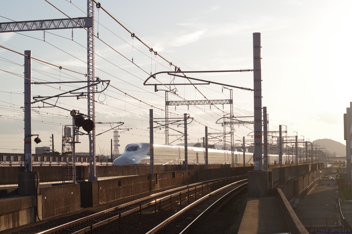 下りホームからの下り列車撮影。新幹線は橋梁ゆえか間隔が短い架線柱が気になりますね。