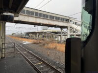 敦賀方面ホームからの敦賀方面行き列車。ホームは入りますが、駅の横がS字カーブなので、見た目に悪くありません。