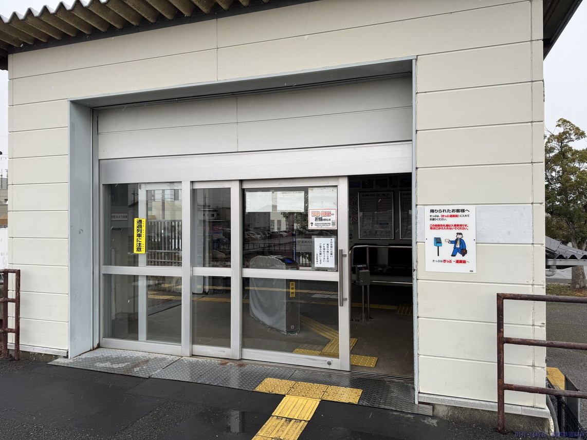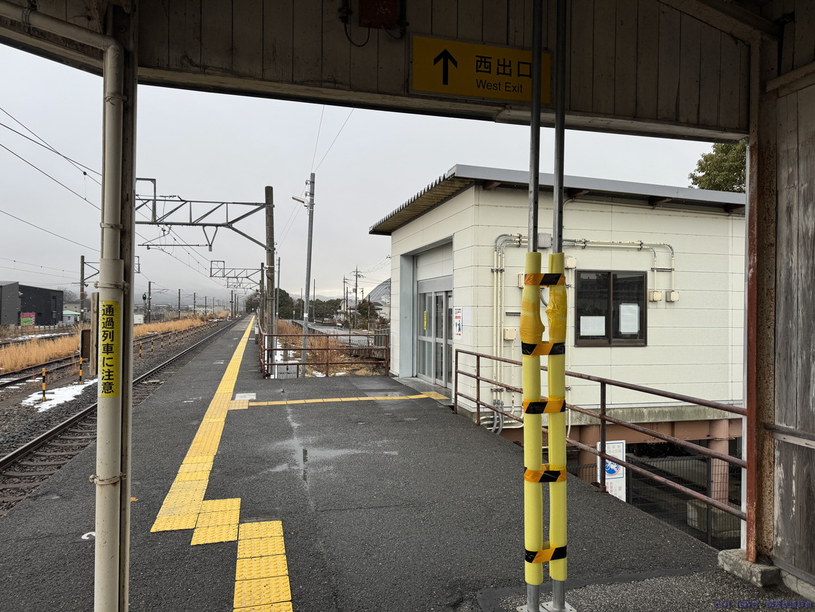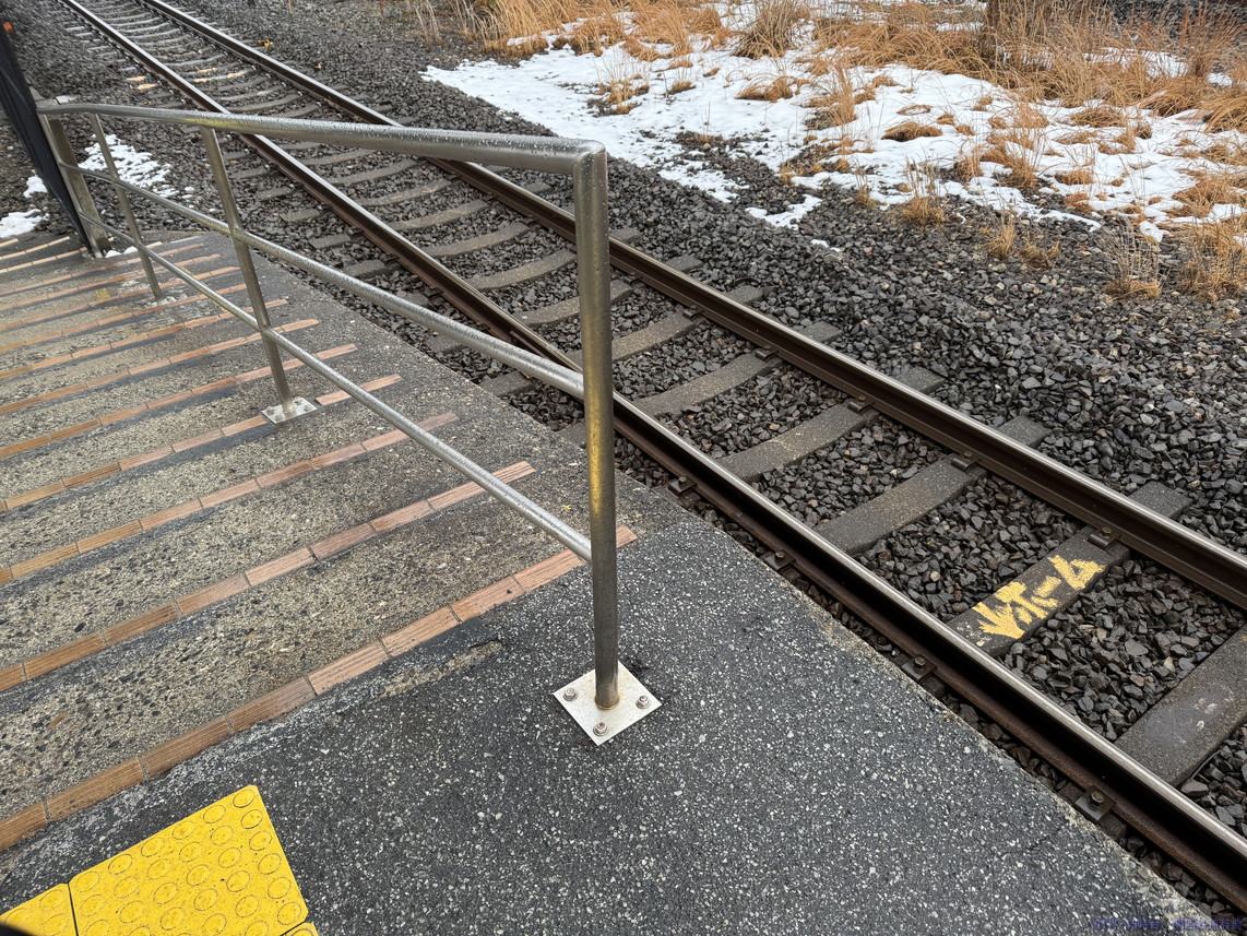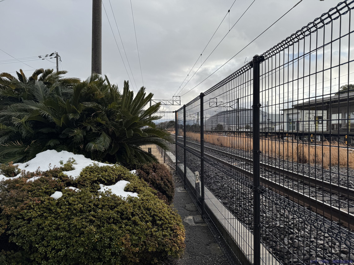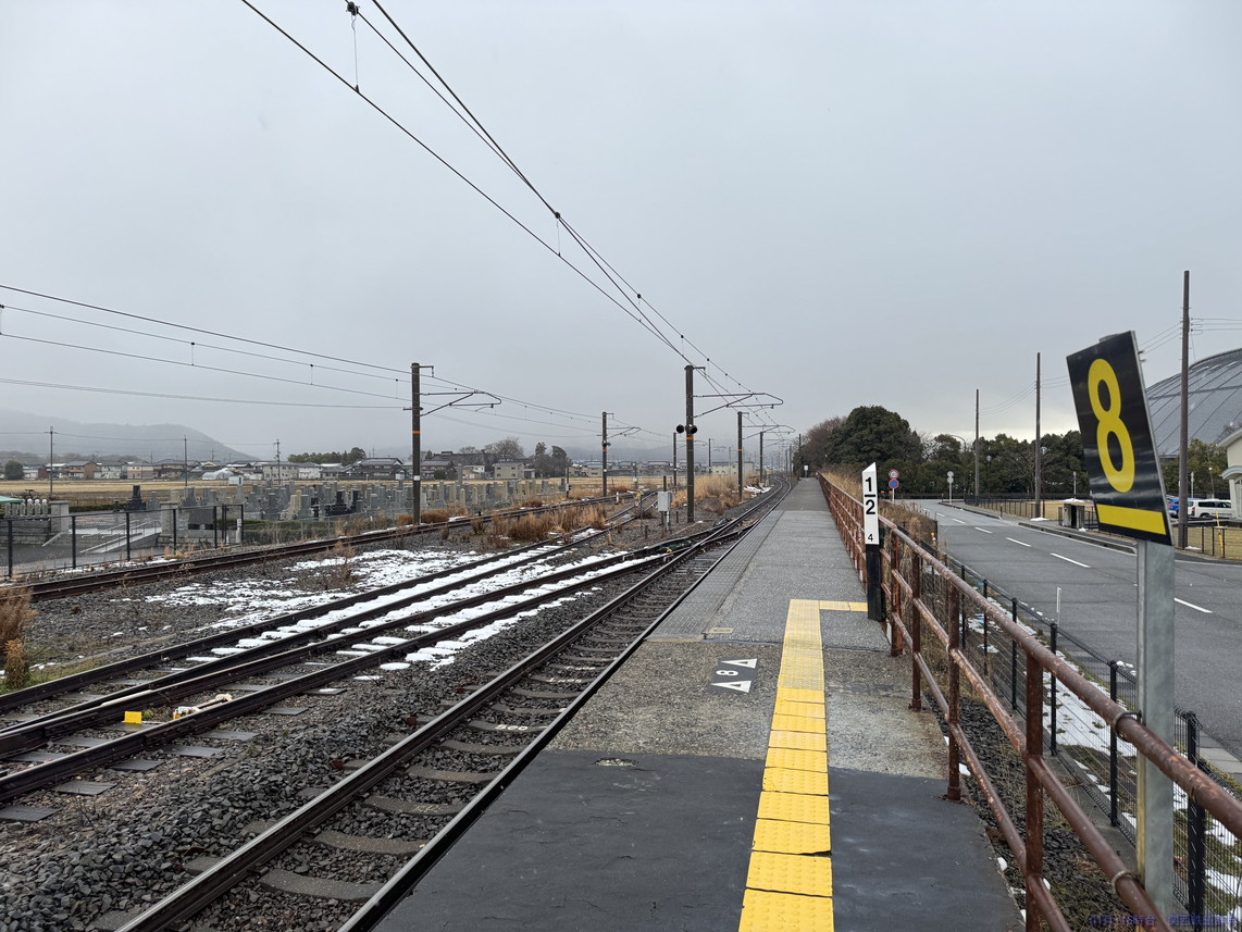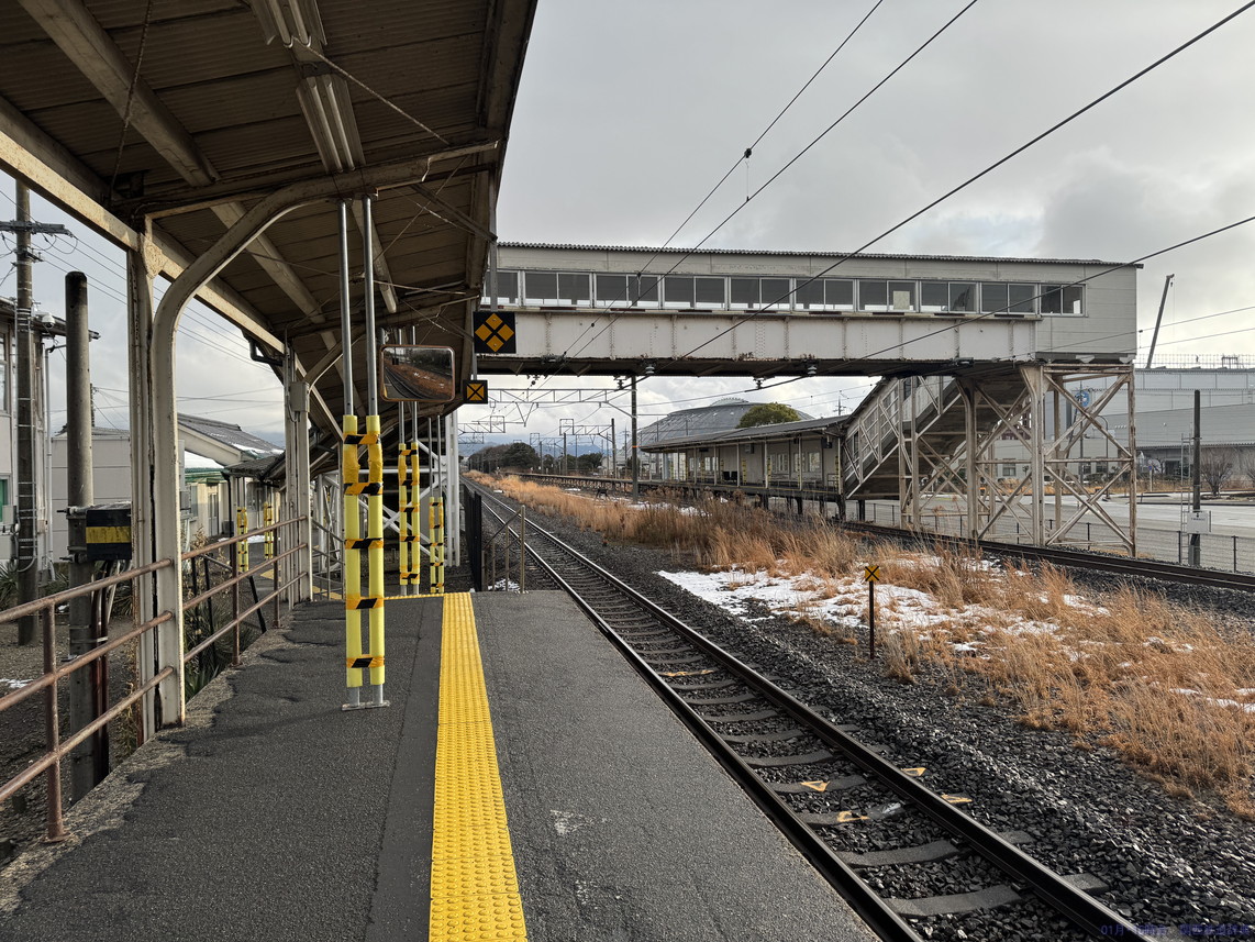 敦賀方面ホームからの敦賀方面行き列車。ホームは入りますが、駅の横がS字カーブなので、見た目に悪くありません。