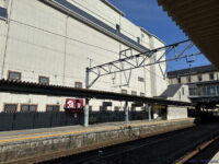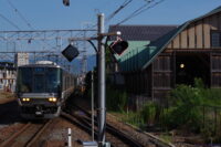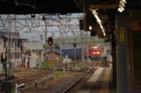 単式の1番線から敦賀方面の列車を撮影。信号機が微妙な位置にあります。でも、隣に長浜鉄道スクエアがあるので、それと一緒に撮るのはありですね(庫内の車両は曇り向きですが)。