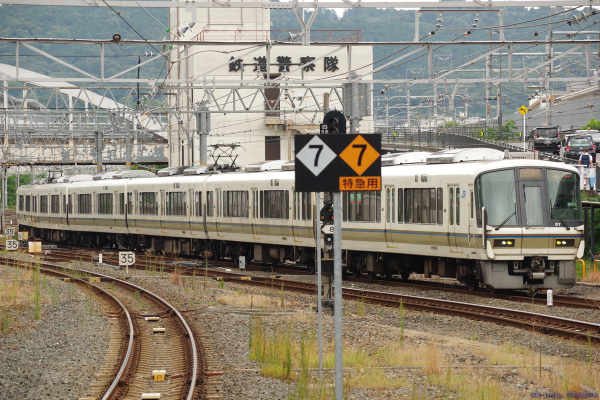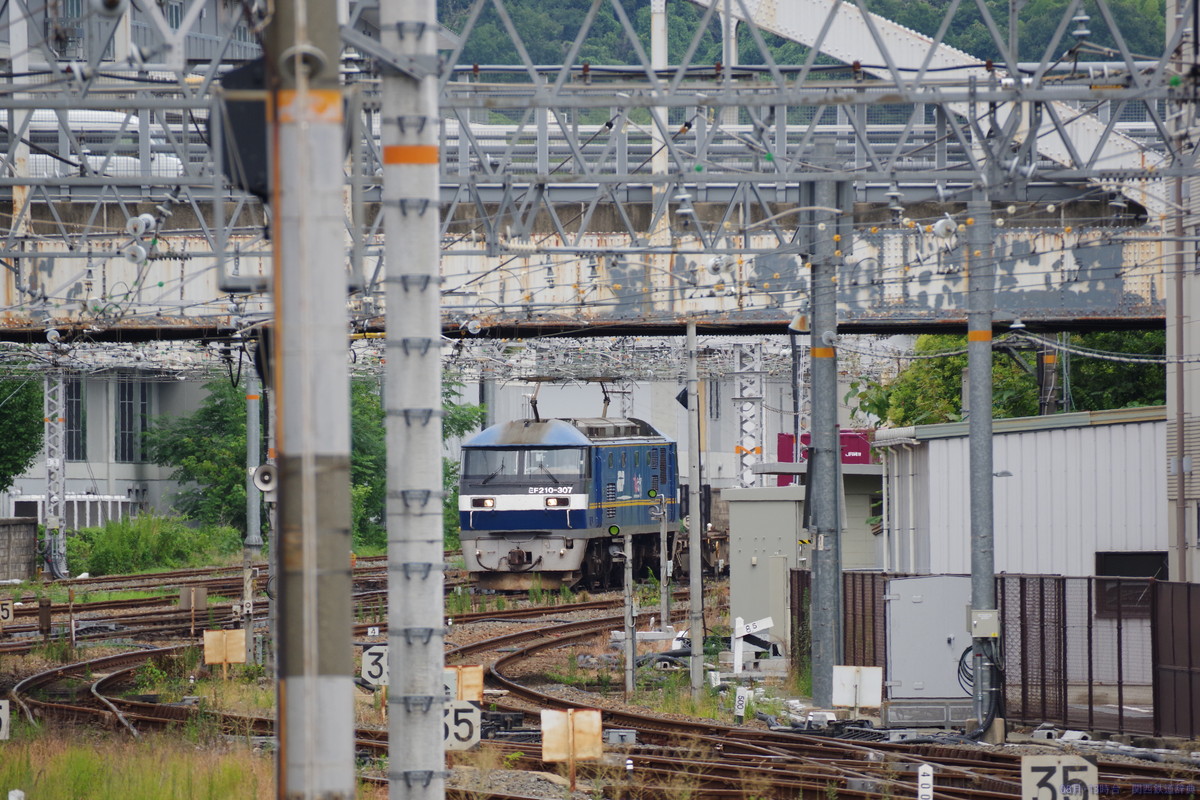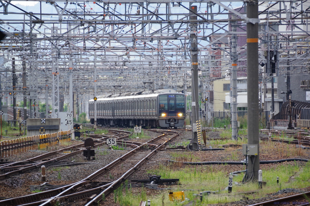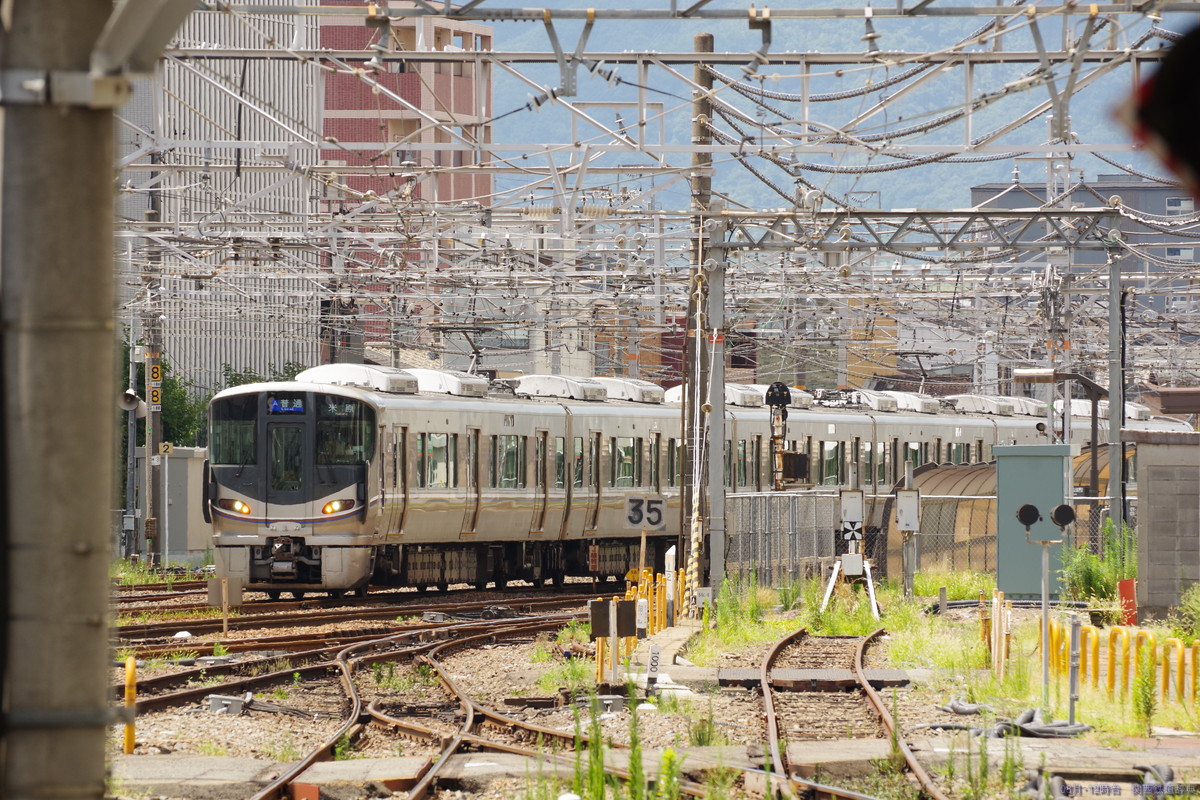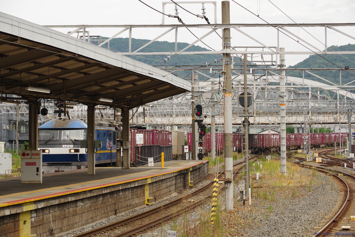 何のことはない駅撮りです。貨物列車の通過は、主に特急が停車する0番線と新快速・快速が停車する2番線の間にある中線=1番線を通ることが多く、0番線からでも側面の撮影が可能。甲種は梅小路で長時間停車するためか、他駅からの移動やら学校帰りの学生やらで撮影者が集まりやすいです。目玉の際は駅員が出ますが…結構フリーダム。