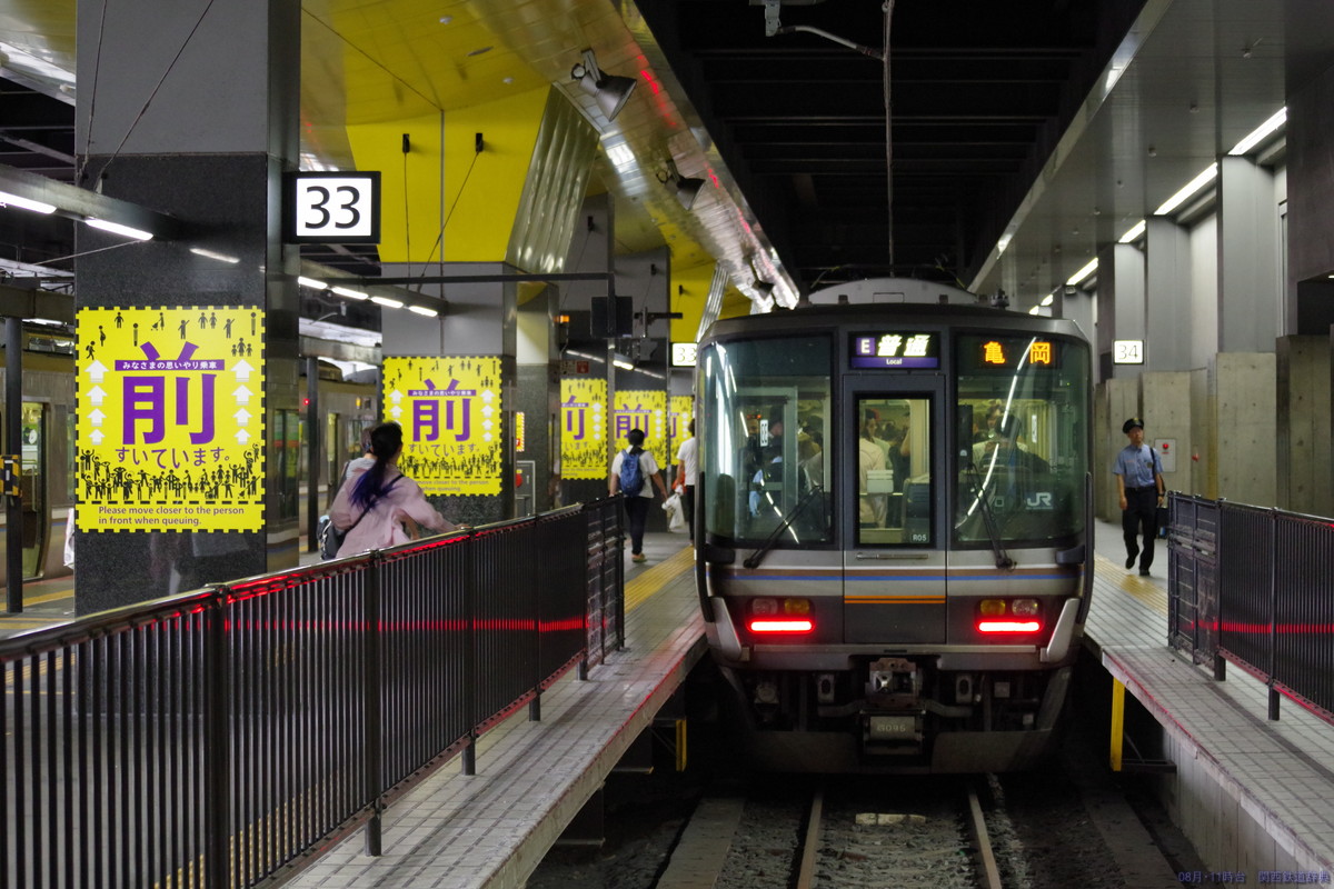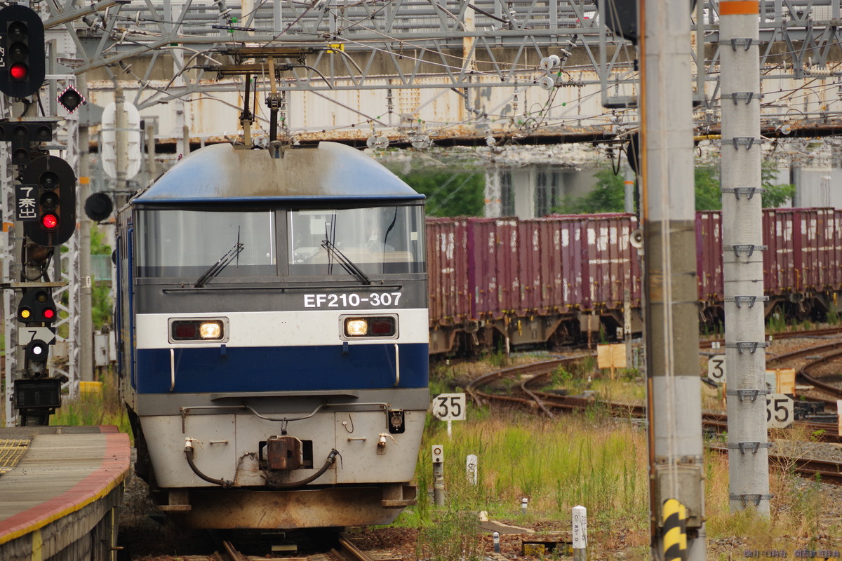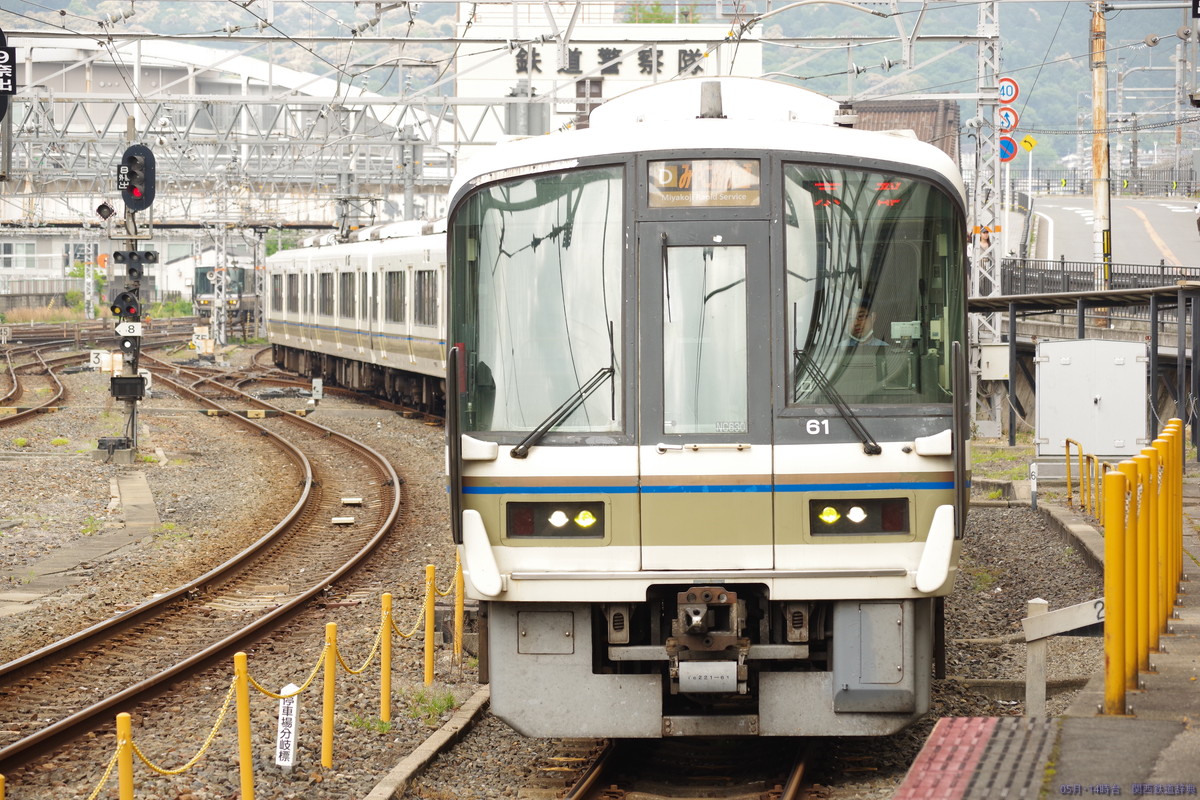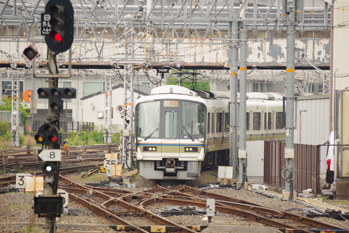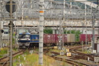何のことはない駅撮りです。貨物列車の通過は、主に特急が停車する0番線と新快速・快速が停車する2番線の間にある中線=1番線を通ることが多く、0番線からでも側面の撮影が可能。甲種は梅小路で長時間停車するためか、他駅からの移動やら学校帰りの学生やらで撮影者が集まりやすいです。目玉の際は駅員が出ますが…結構フリーダム。