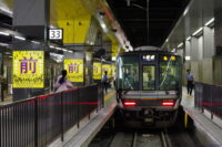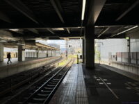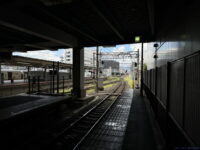 2番乗り場から0番乗り場・1番線の電車を。2番乗り場の12両停車位置よりさらに山科方にはホーム側に柵があり、そこからホーム端までが撮影可能スペースです。0番乗り場は間に1線あるぶん奥まで見通しやすいのと、駅ビルと一体化した0番乗り場の天井がかなり高くスッキリとしているのが良いところ。