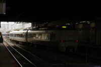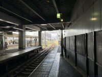 改札付近から撮影。改札前はホームが非常に広くなっています。1両+α分しか入らないのだが、天井が高いため空が広がり、ホームは車内の光を映します。ついついそのまま乗り込みたくなる…