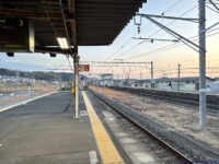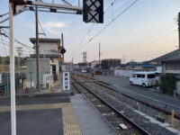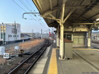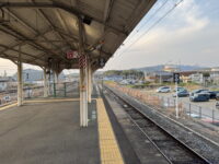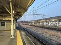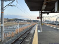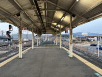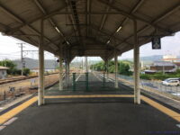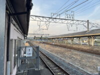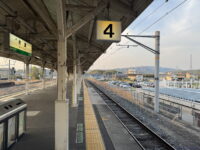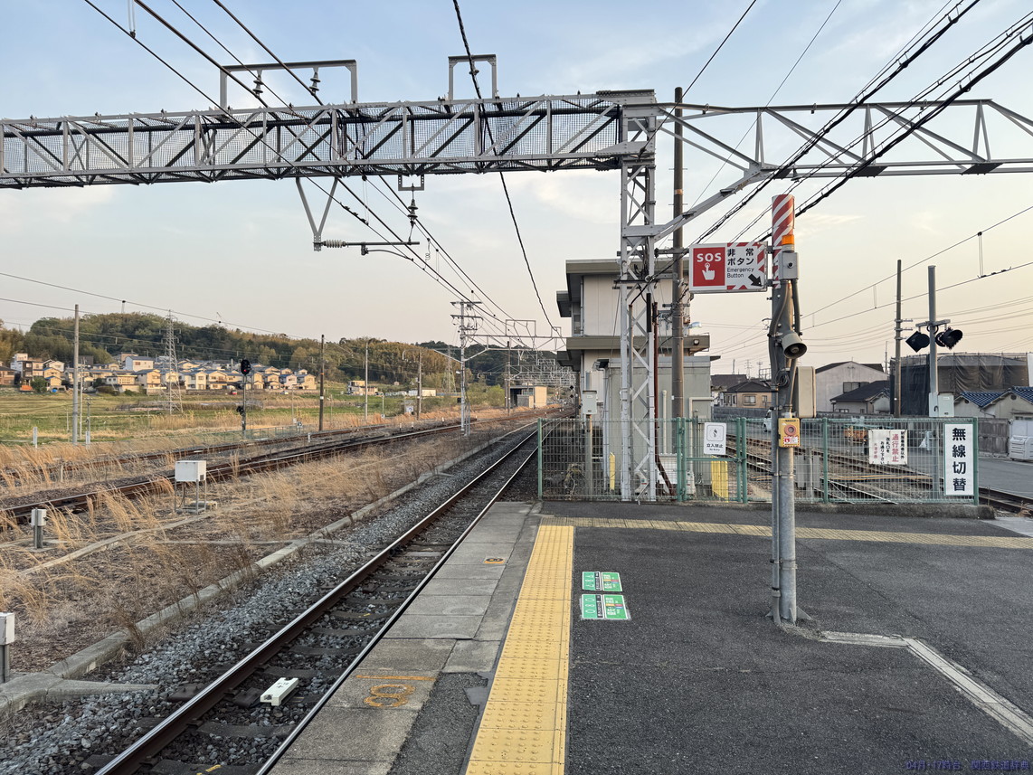 奈良方面ホームの奈良方。この駅は2面4線ですが、かつて中線が2本あったそうで、両ホームの間は広くなっています。また、分岐の関係か、対向側ホームははるか向こうまで伸びています。そうなるとホームを入れて撮るか、向こうで中線跡に立っている架線柱が被るか、になります。