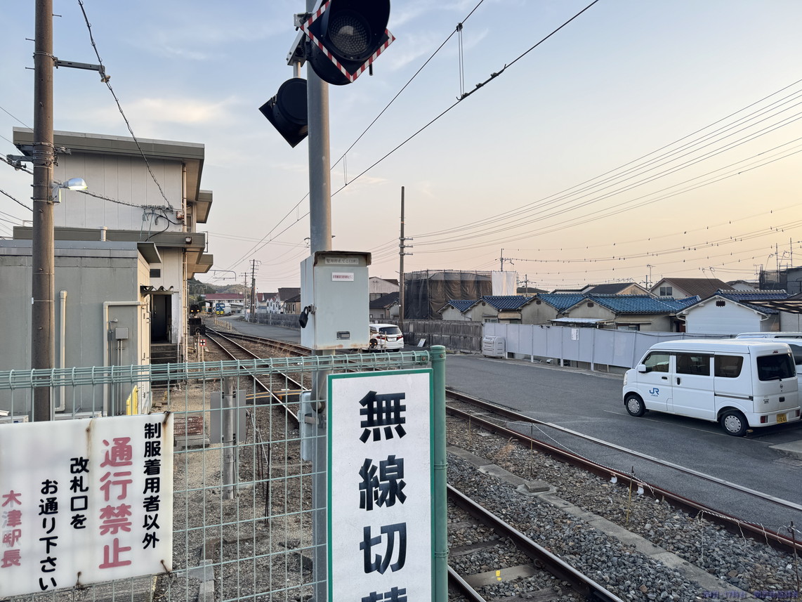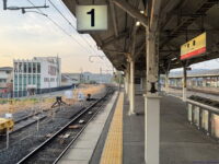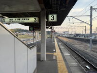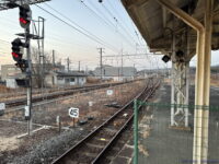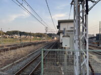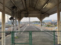 奈良方面ホームの各方面方。こちらはホームに立ち入れるのが8両分ですが、さらに先に数両分嵩上げされていない部分が伸びており、雑草が繁茂しています。そのため大和路線の列車は撮りにくいのですが、奈良線はホームの使われている部分の少しだけ先・未嵩上げ部分で合流。そのため望遠で入ってくる列車が撮りやすくなっています。