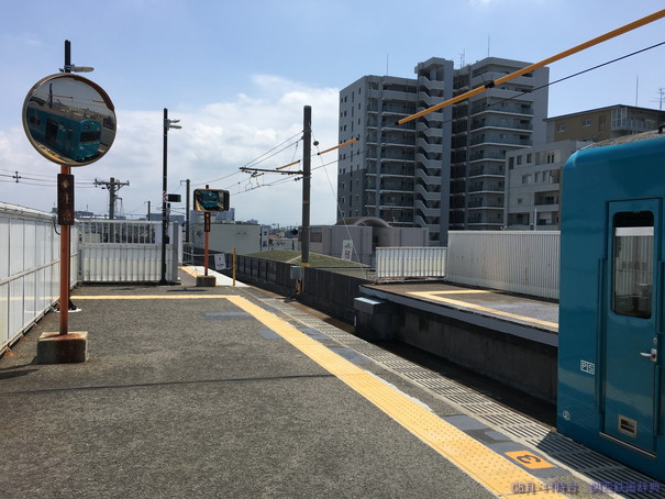 なお線路は西南西-東北東向きなので午後に降車ホームから撮影というのも一案だったが、延伸時に降車ホームは廃止、出入り口が塞がれて入れないようになっている。