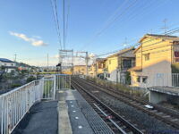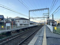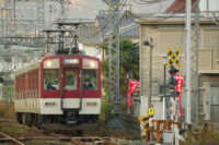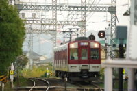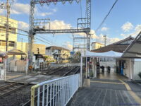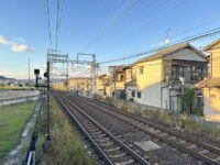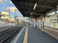 下りホーム下り方からの撮影。当麻寺駅の東側はごく短い直線のあと、下り向きに左カーブしています。そのため上り列車は4両となると手前の踏切まで引いての撮影でなんとか。障検は被ります。