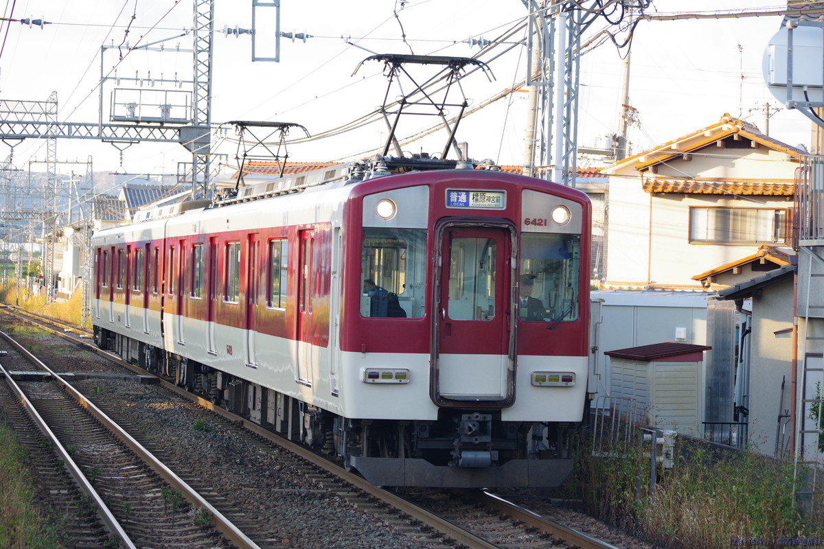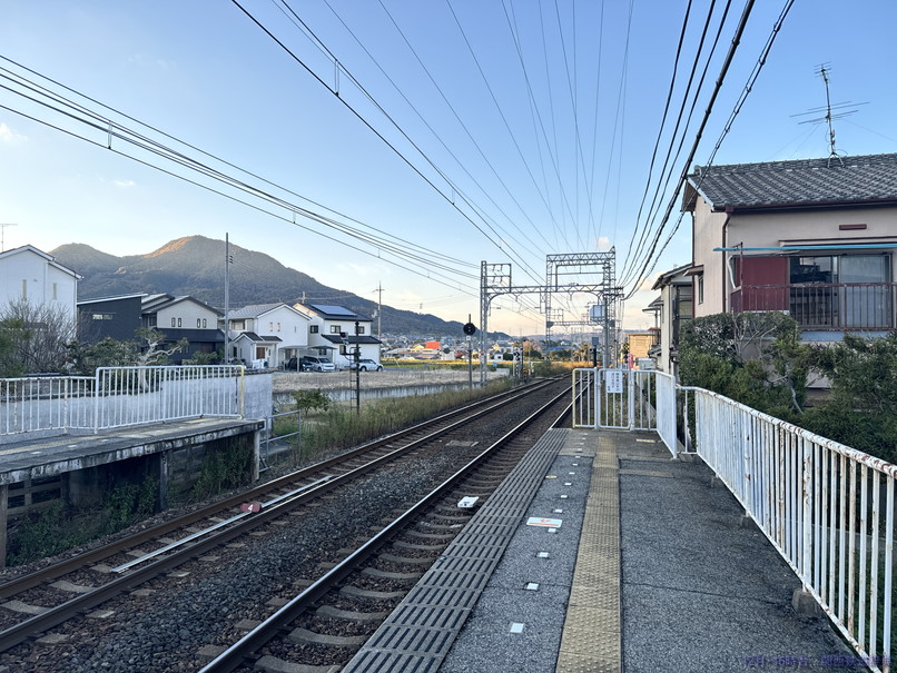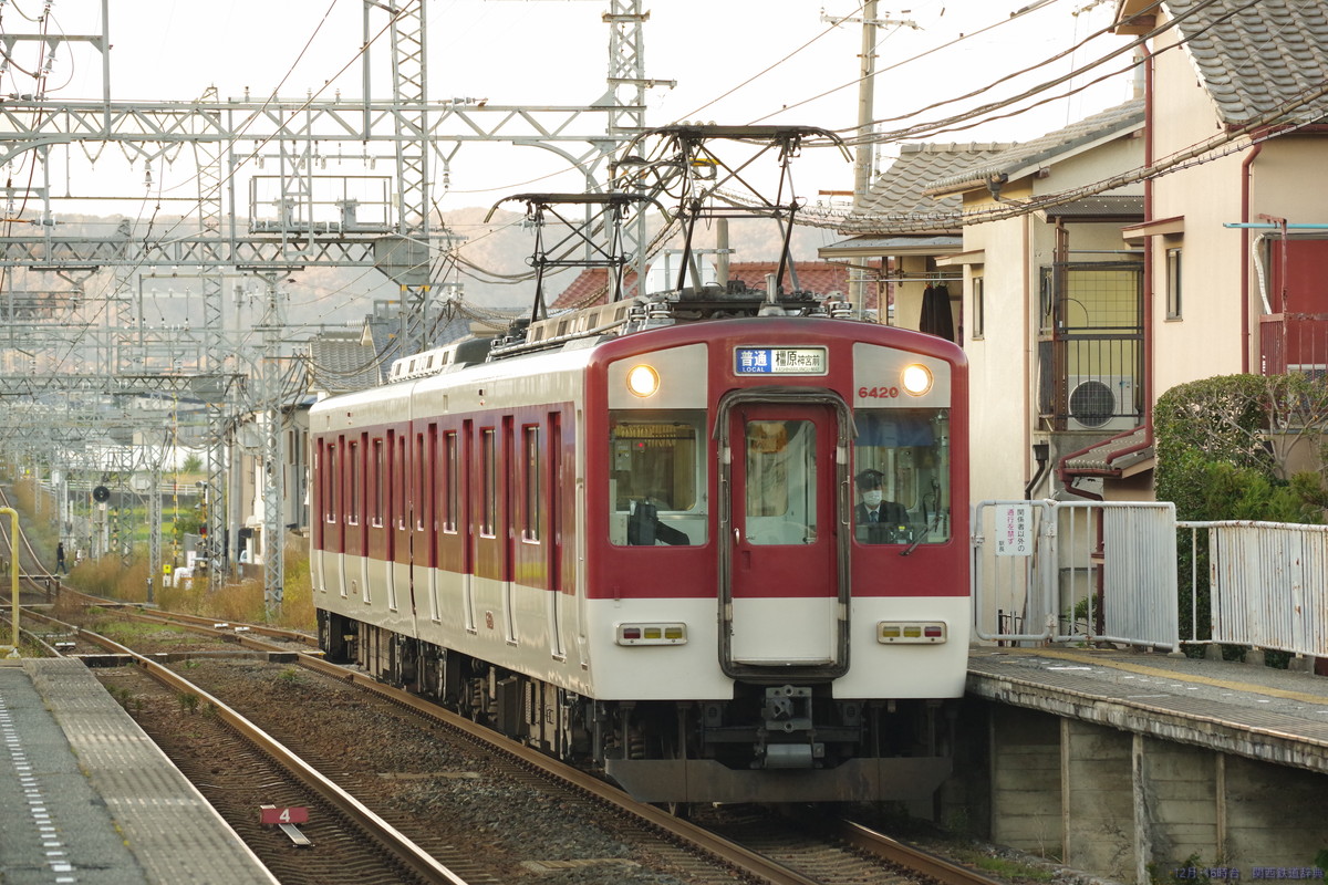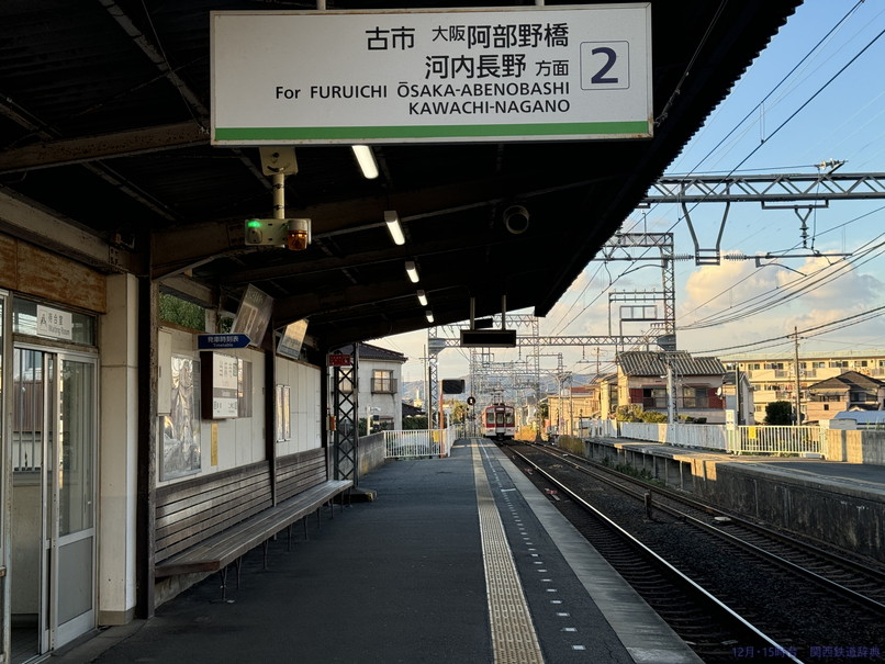 下りホーム下り方からの撮影。当麻寺駅の東側はごく短い直線のあと、下り向きに左カーブしています。そのため上り列車は4両となると手前の踏切まで引いての撮影でなんとか。障検は被ります。