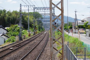 大阪方の端はカーブになっているため、どうしても架線柱が重なるのに加え、機器箱もある。10両編成しか停車しない部分で昼間は人もあまり来ないので撮影はしやすいが、階段が遠い。