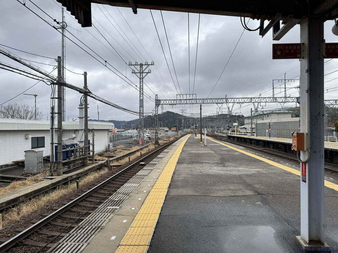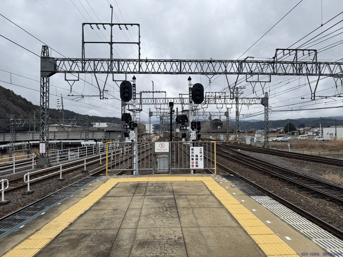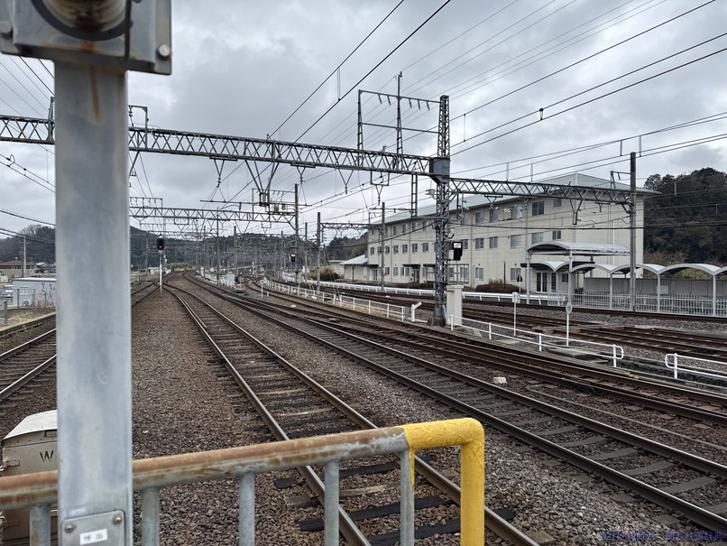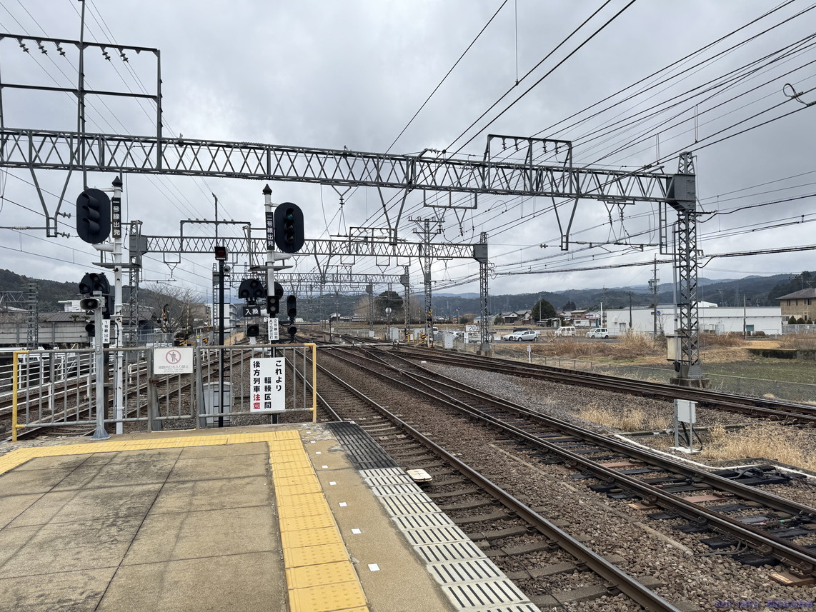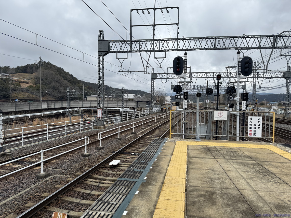 右奥に留置線があります。ホームからは下り待避線からしか出入できません(ほか、ホームの脇を通って下り方引上げ線とも出入可能)