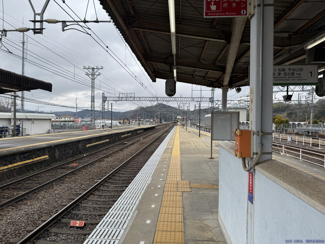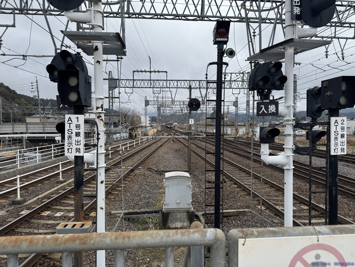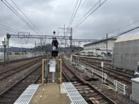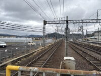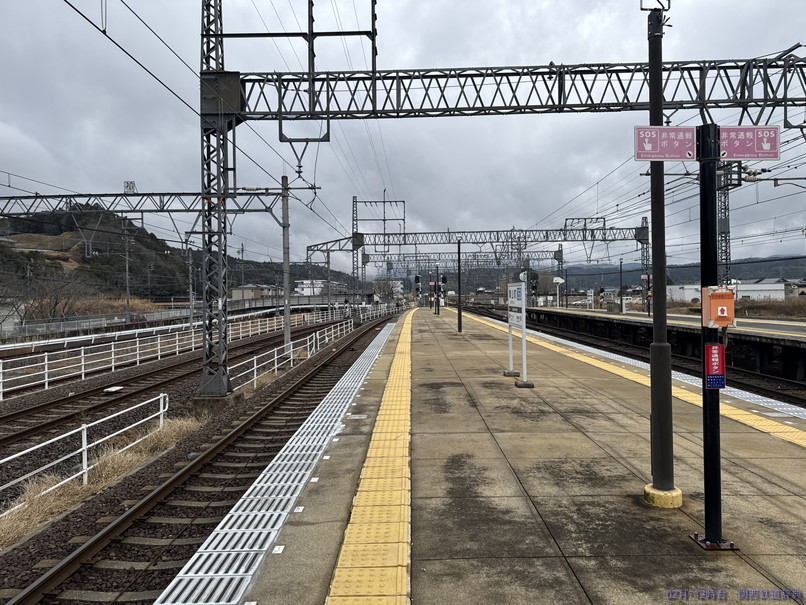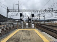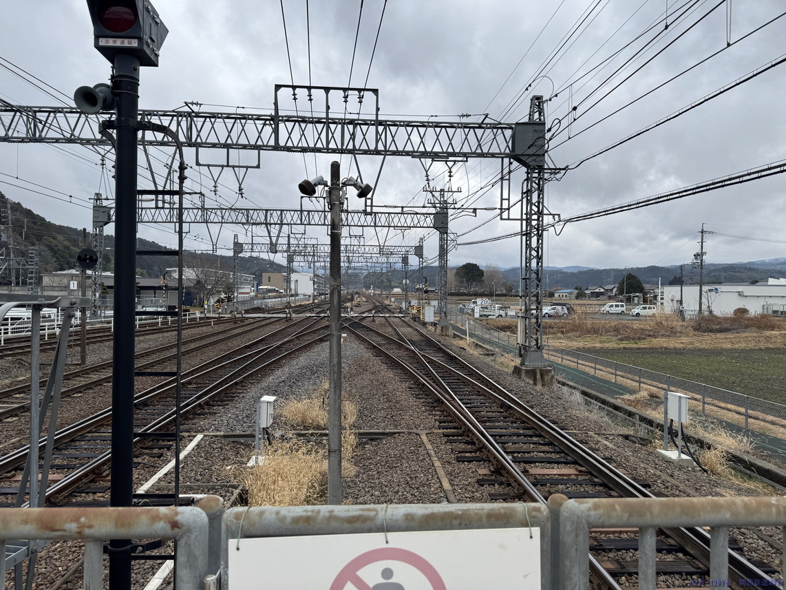 右奥に留置線があります。ホームからは下り待避線からしか出入できません(ほか、ホームの脇を通って下り方引上げ線とも出入可能)