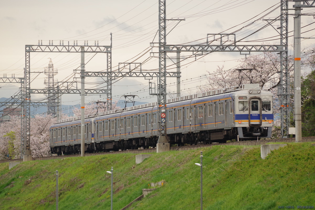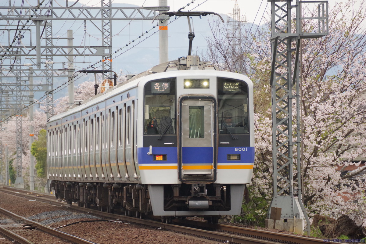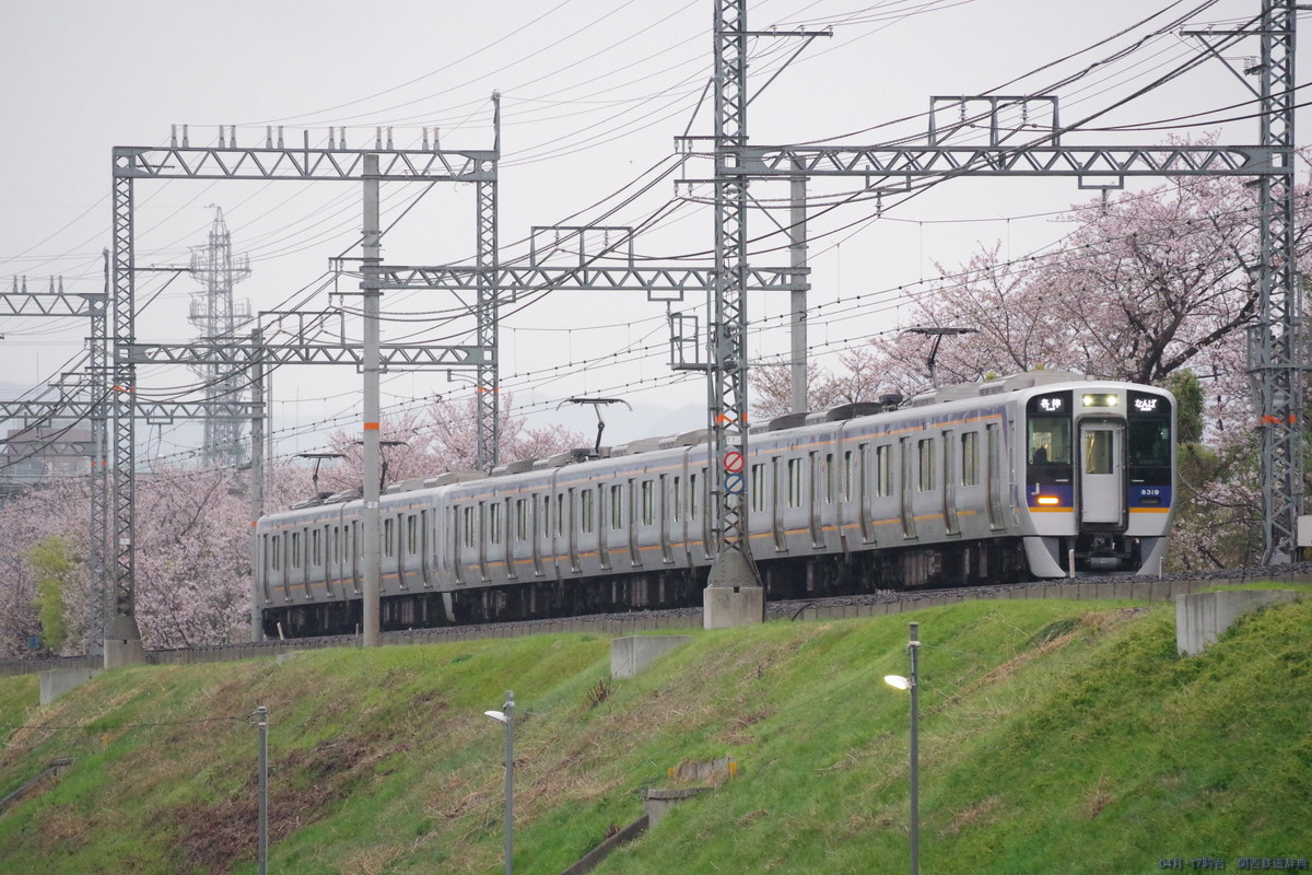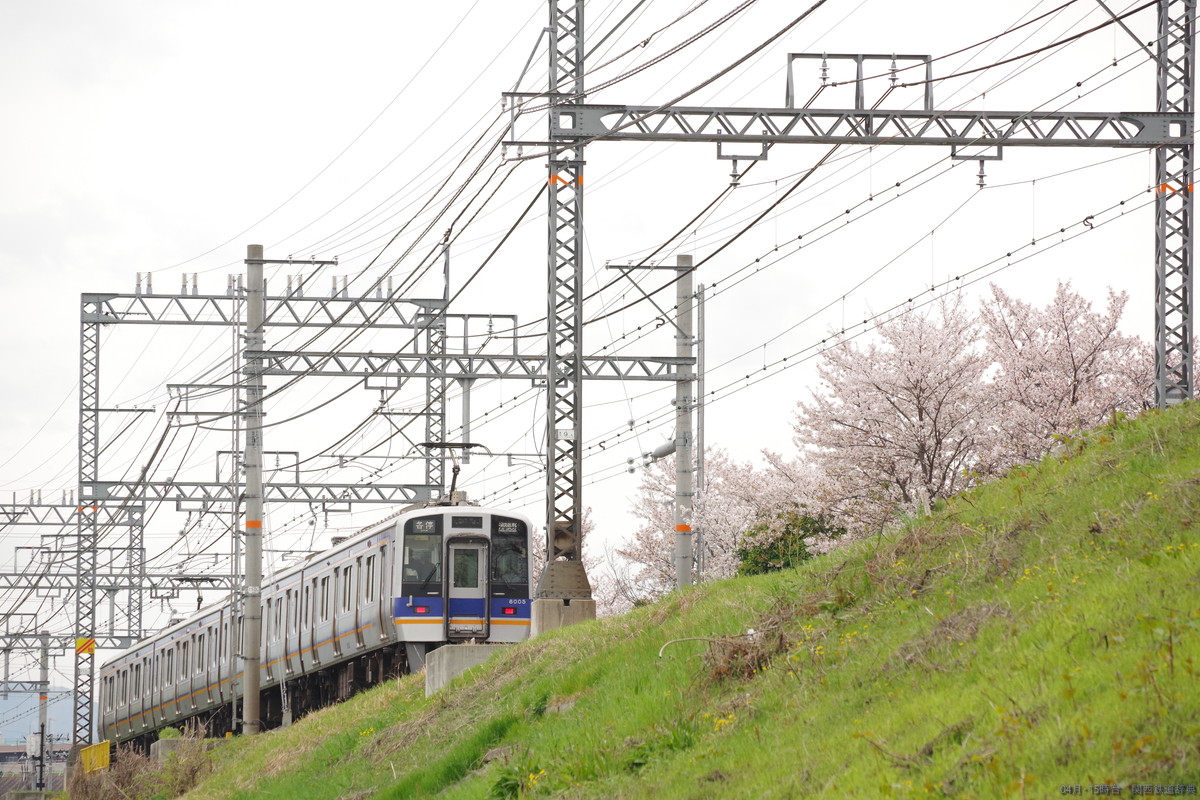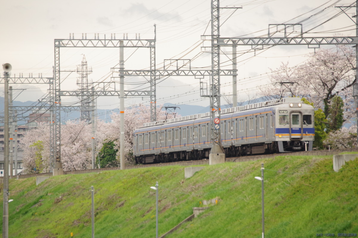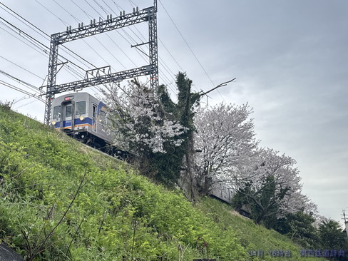 狭山から大阪狭山市の間は、大半の区間が真っ直ぐ築堤で進む形。その築堤の片側には多くの桜が植えられており、桜の季節には南海でも有数の列車沿い桜並木となっています。