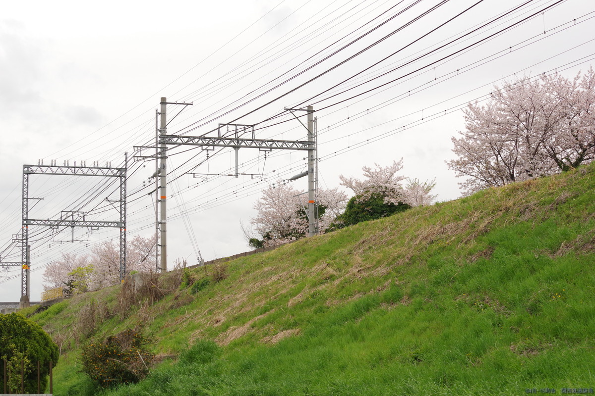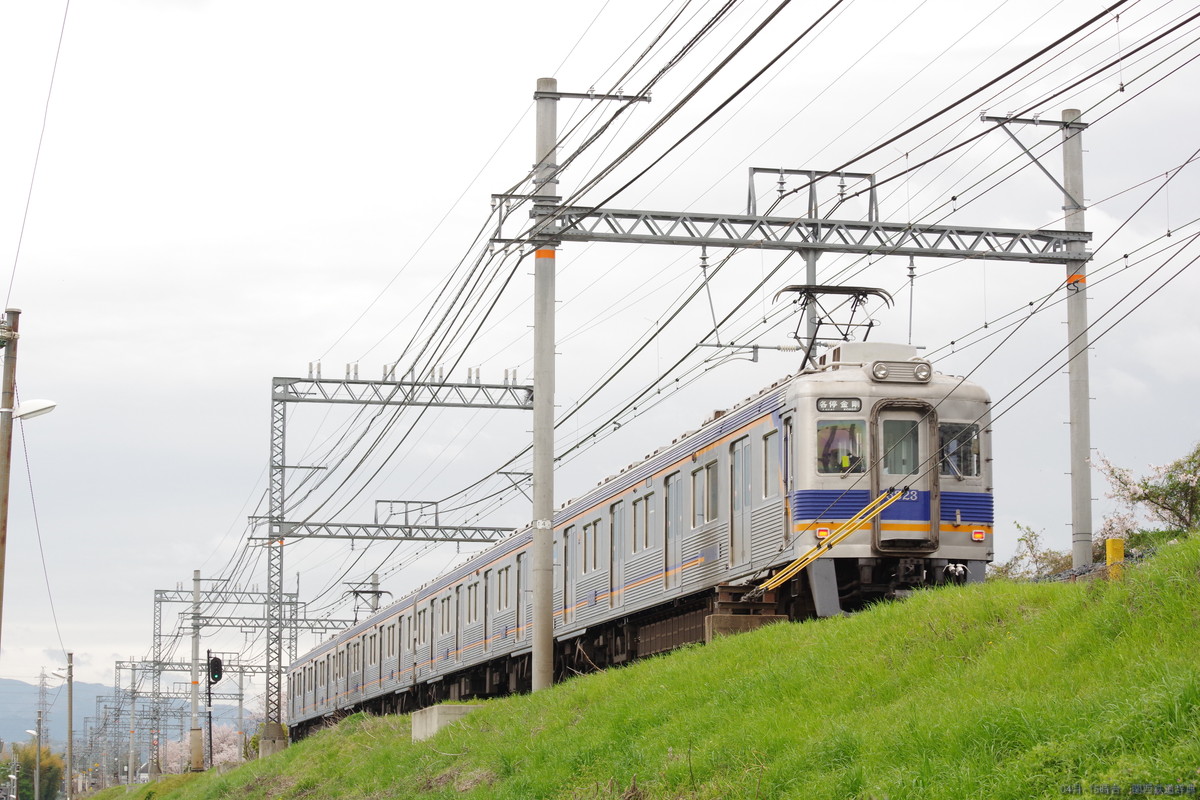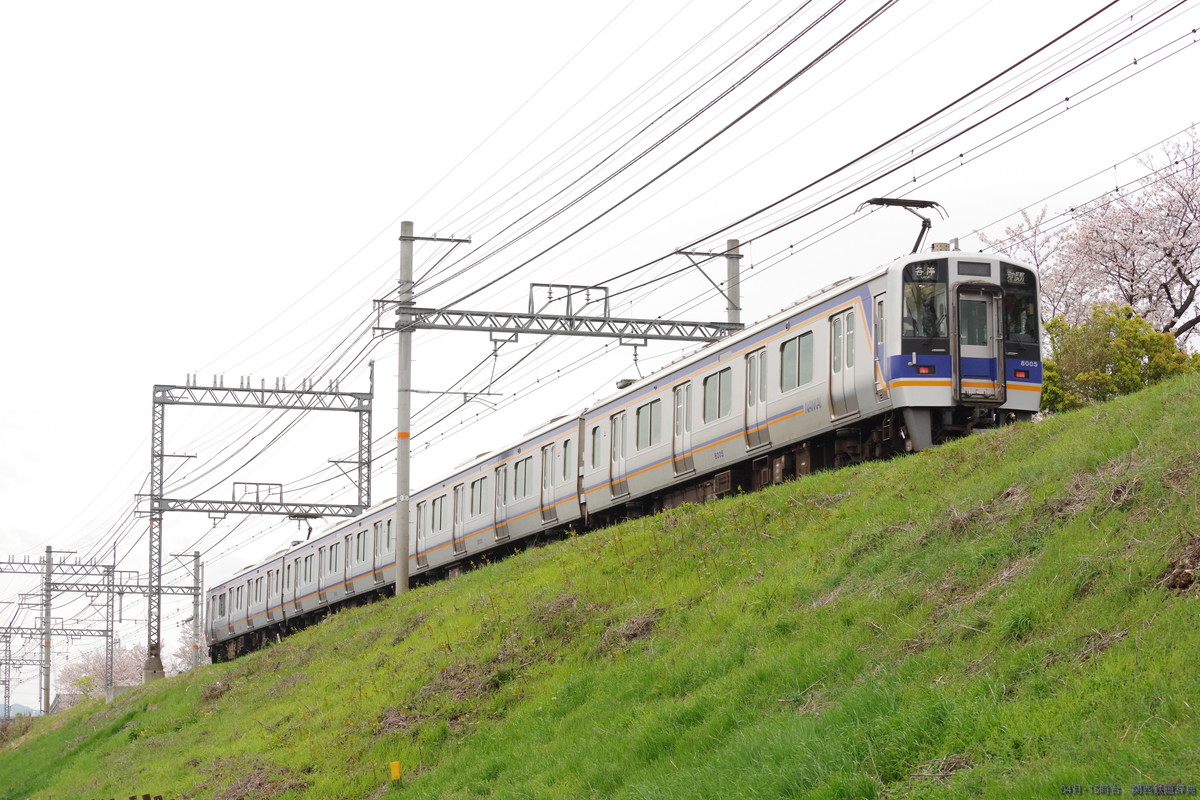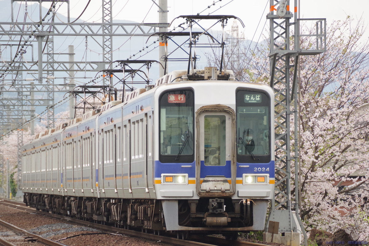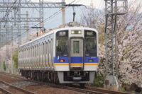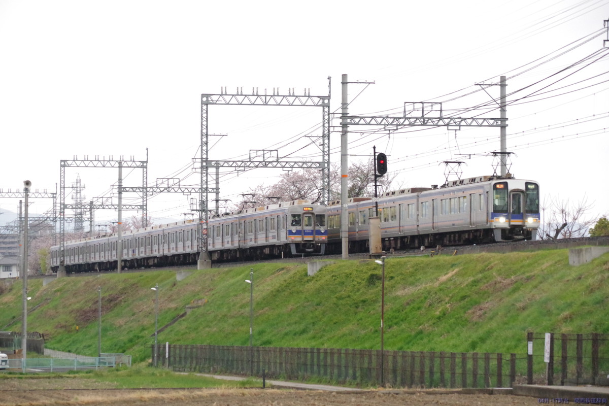 狭山から大阪狭山市の間は、大半の区間が真っ直ぐ築堤で進む形。その築堤の片側には多くの桜が植えられており、桜の季節には南海でも有数の列車沿い桜並木となっています。