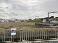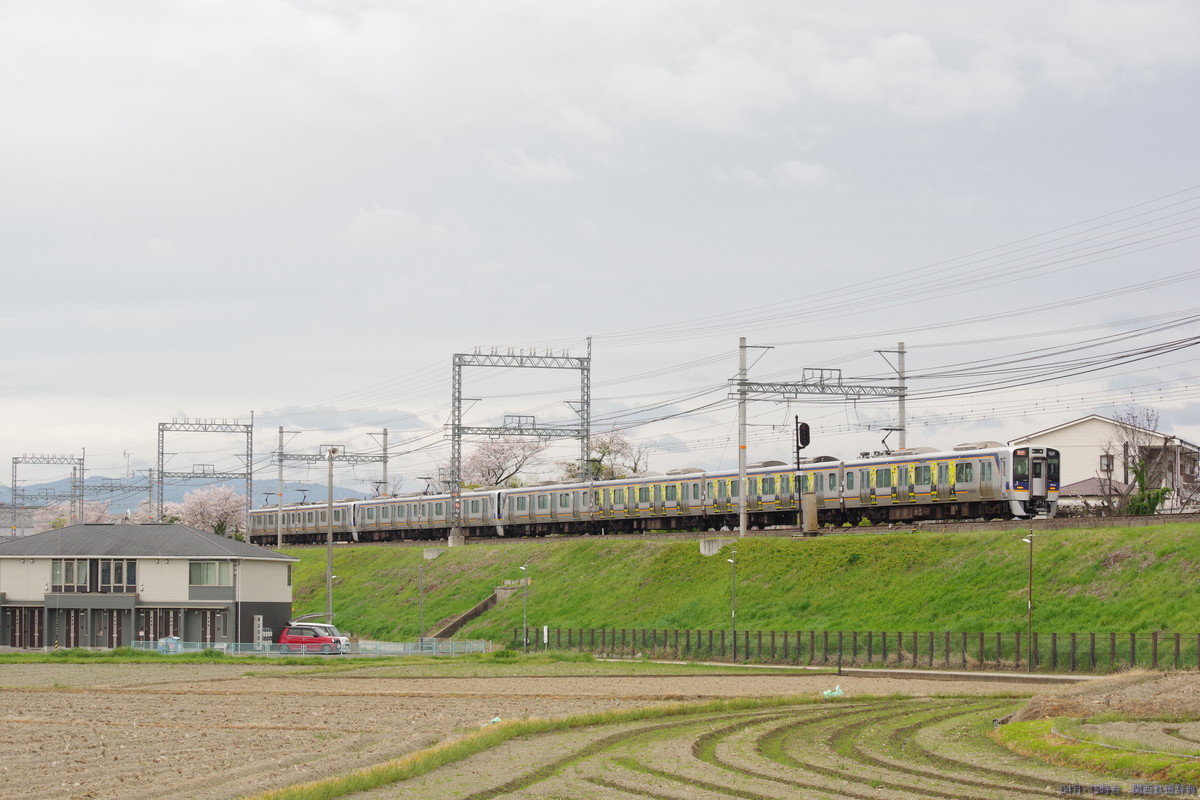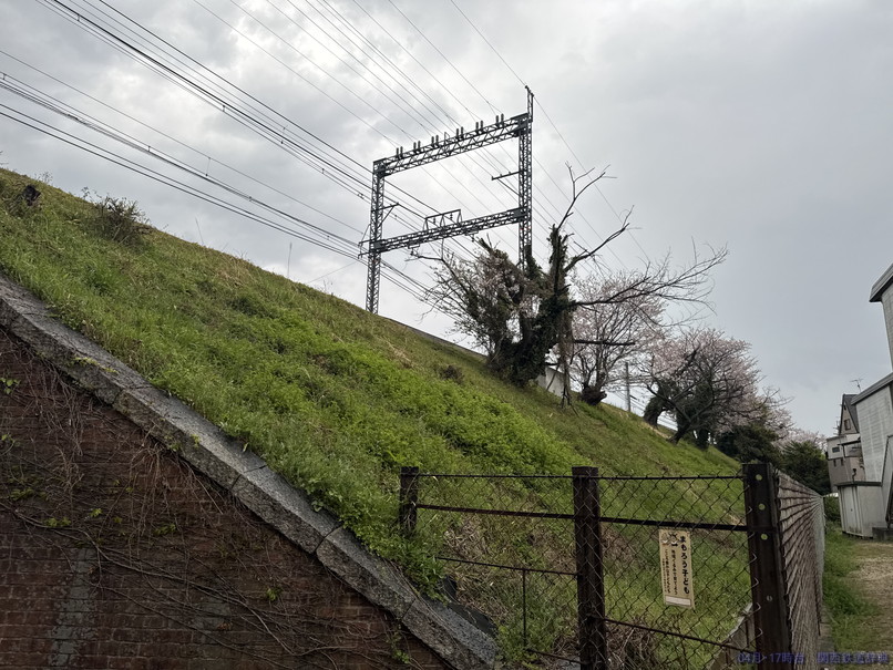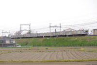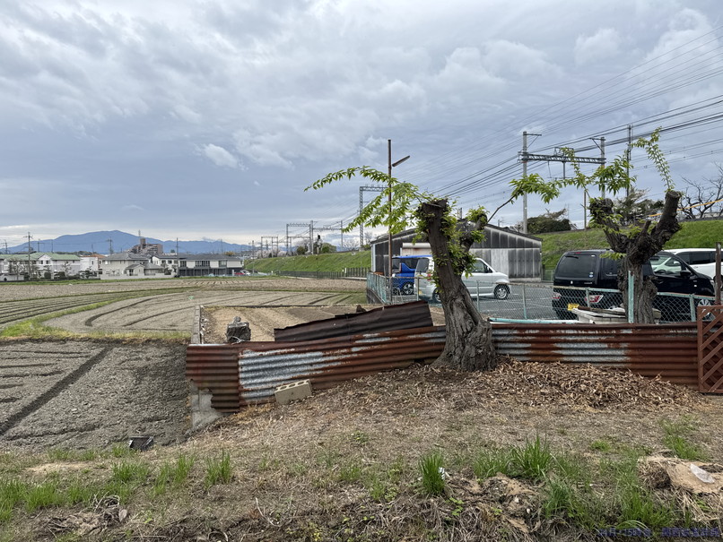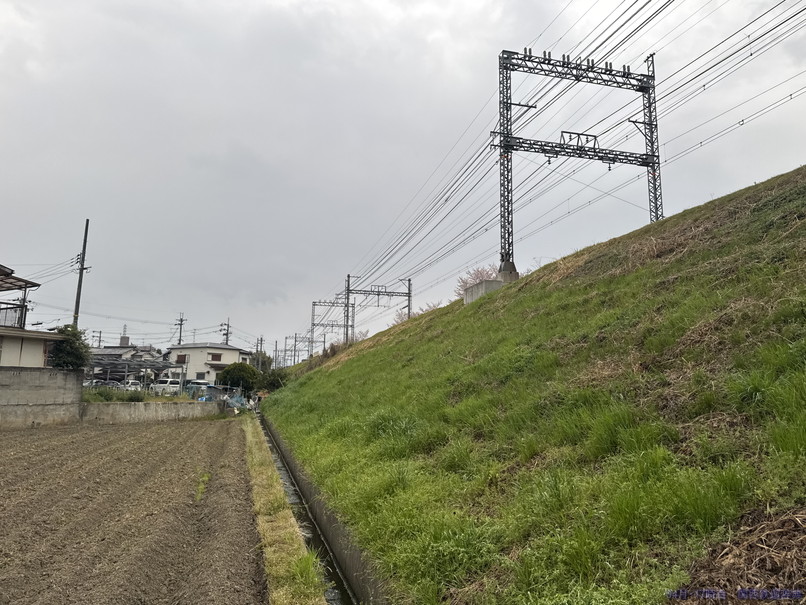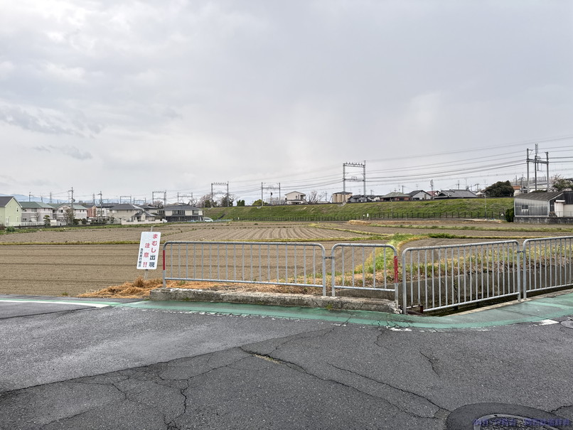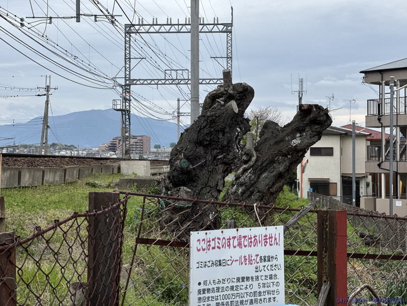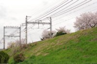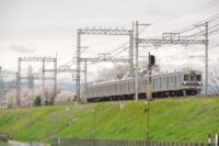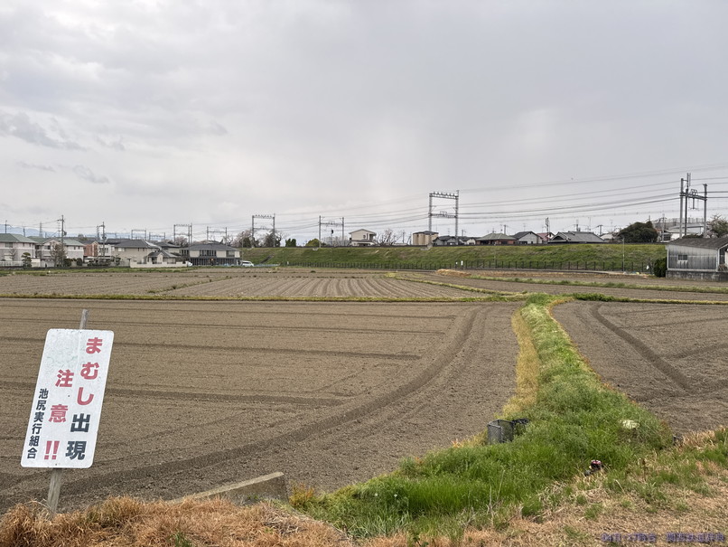 築堤の狭山駅付近の北側は農地が広がっています。築堤付近からだとやや見づらいですが、農地越しで望遠すれば、これもまた桜との共演がいい感じです。