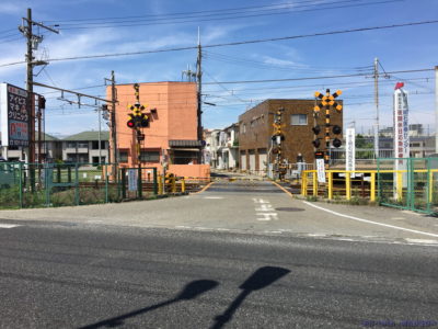 中八木駅西側すぐにある踏切。車道踏切だが狭く、上り列車は架線柱で遮られる。下り列車はもちろん駅。