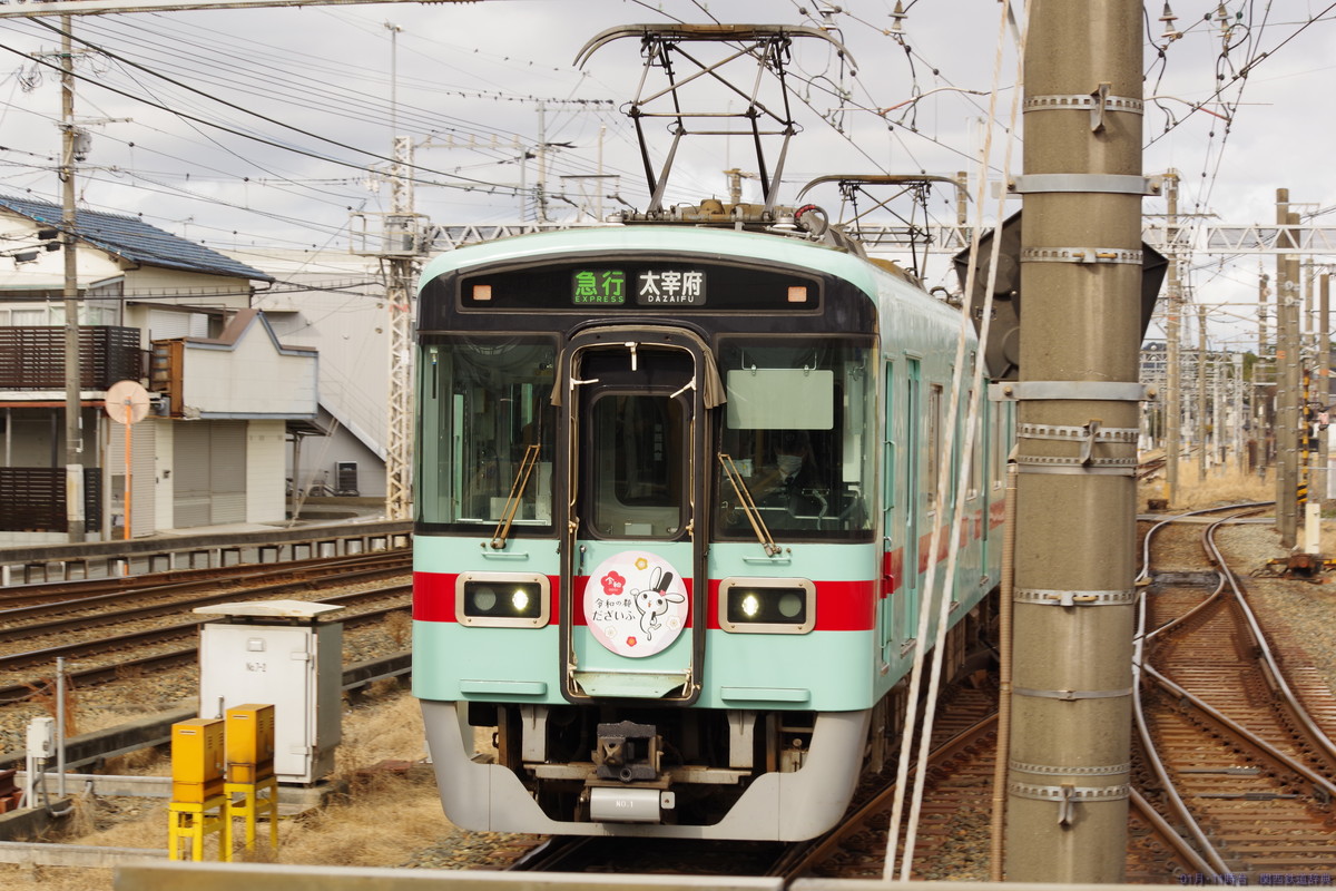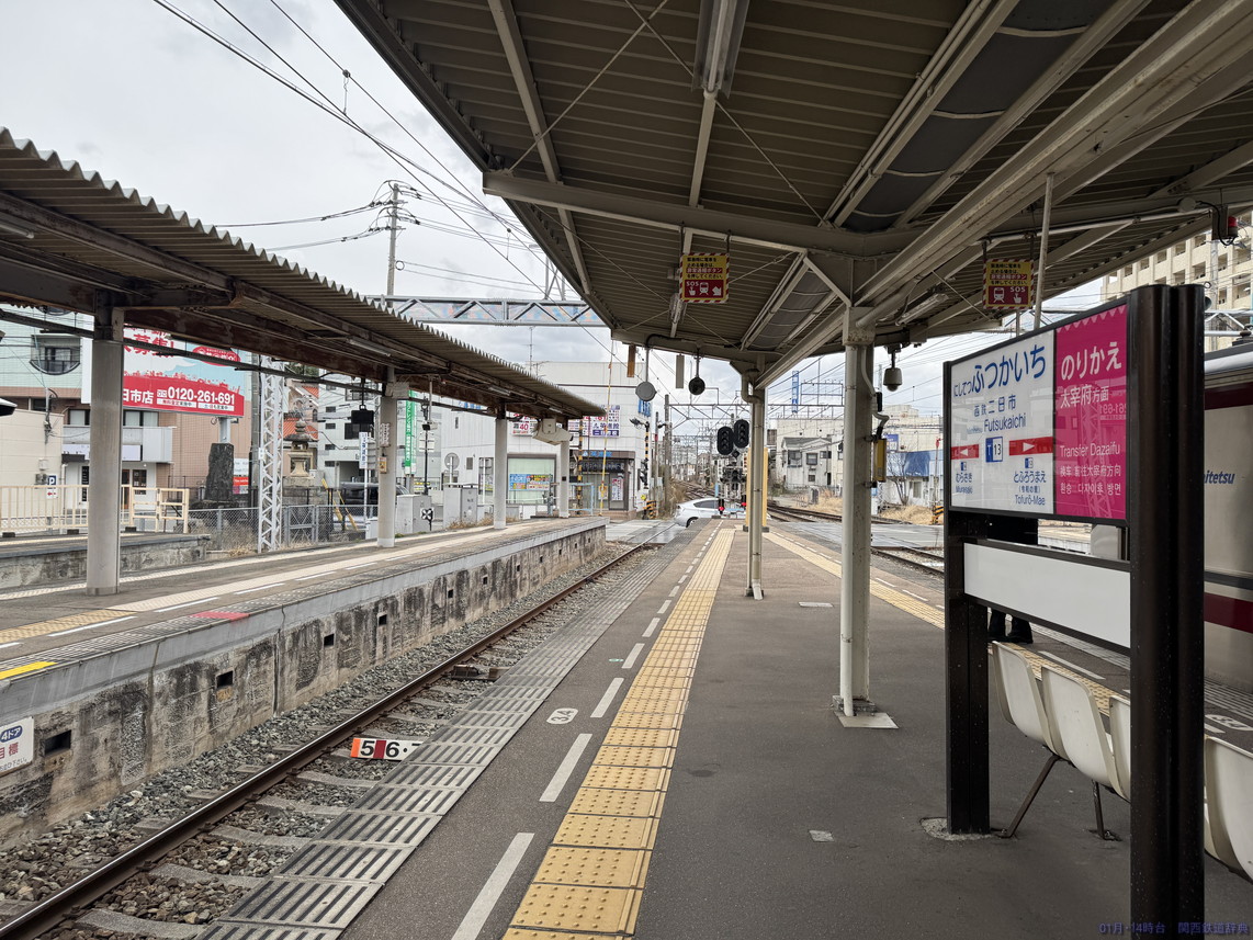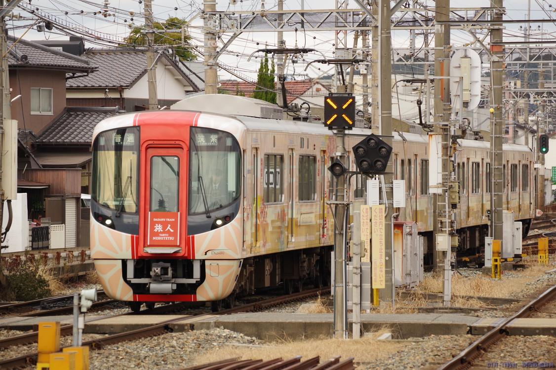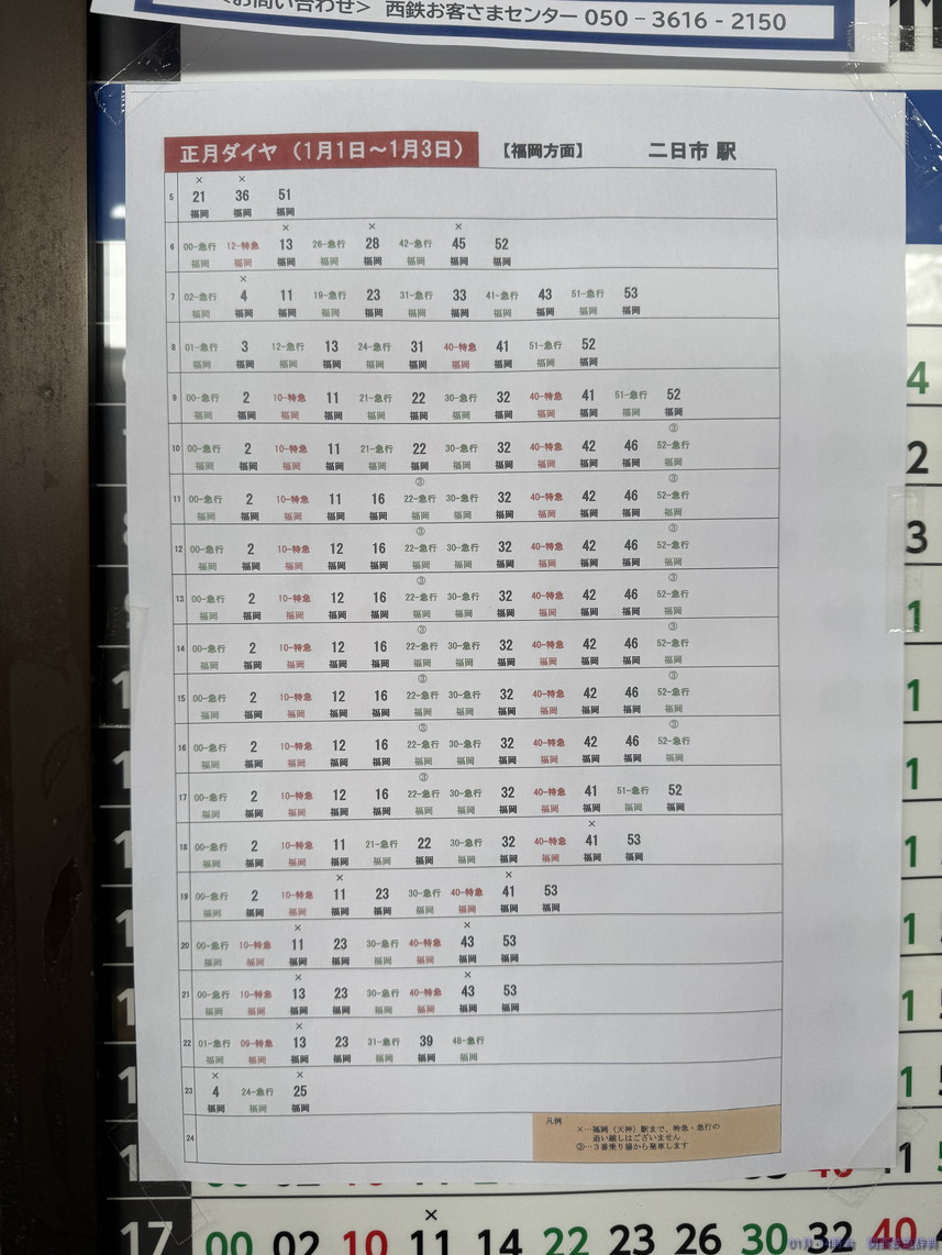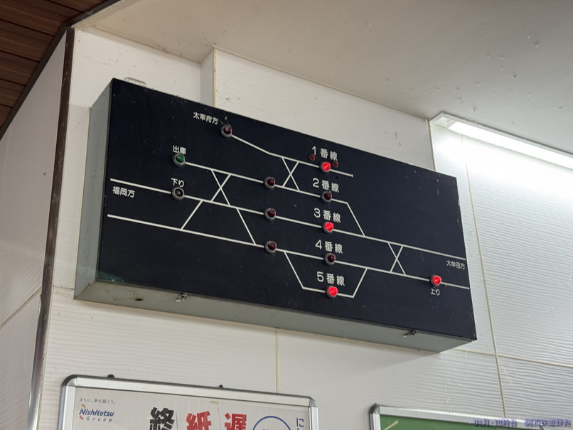 ・備考:正月は、普通が主本線に入り、特急・急行が副本線に入って両側のドアを開けて1番線の太宰府行きとの対面乗り換えを実施するとともに、福岡→太宰府と太宰府→福岡の直通急行が2番線を使用して下り普通と対面乗換を実施していました(普通着→特急着発→普通発→普通着→太宰府発福岡行き折返着発→急行着発→普通発→普通着→福岡発太宰府行急行折返着発→普通発→普通着→特急着発)