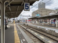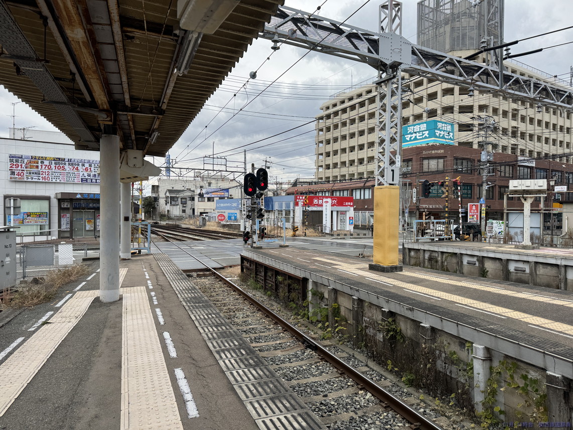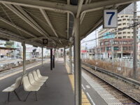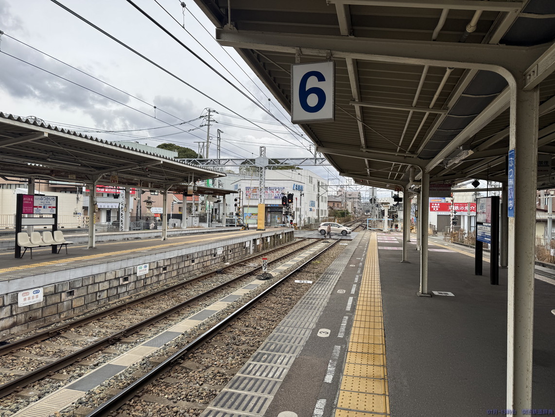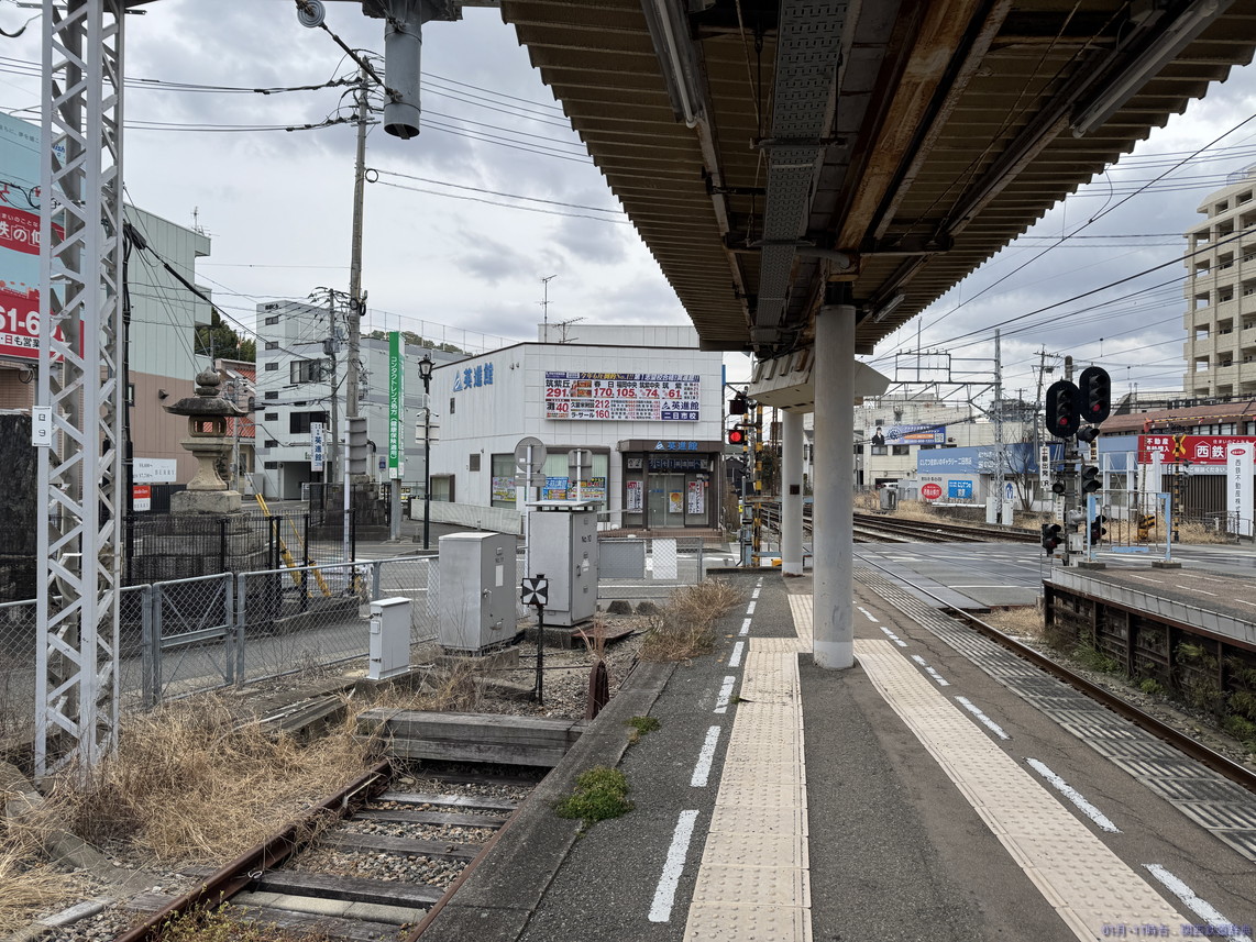 西鉄二日市駅は東端に太宰府線専用の1番線があり、その東側にある単式ホームが1番のりばです。1番線は太宰府方が行き止まりとなっています。それなら頭端式でもよさそうですが、そうはなっておらず、昔はこの先に続いていたかのような形です。しかし今はすぐ先が道路で天神大牟田線の線路が見えることはありません。