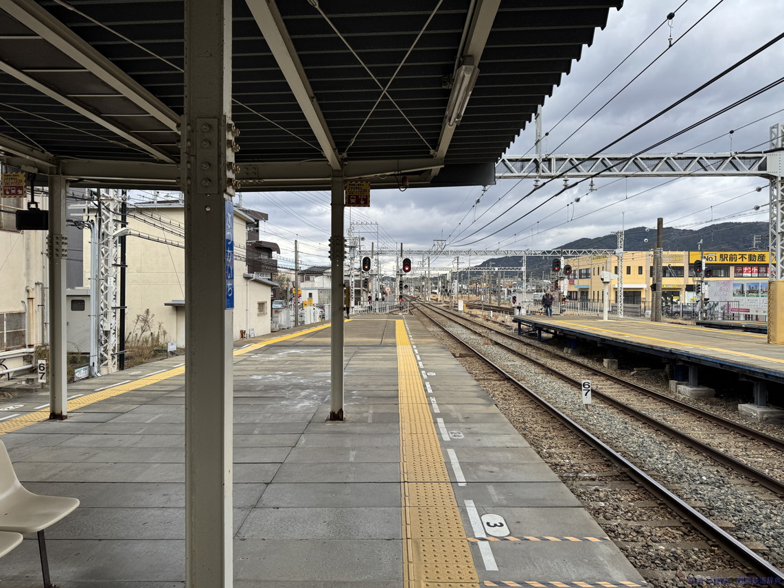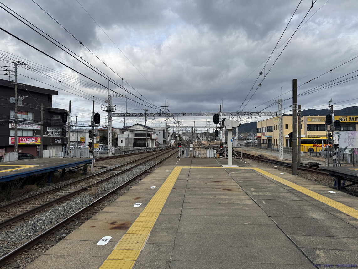 単式の1番のりばの福岡方からの撮影です。ホーム端せまく、架線柱もあって撮影にはイマイチです。