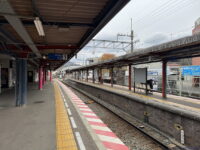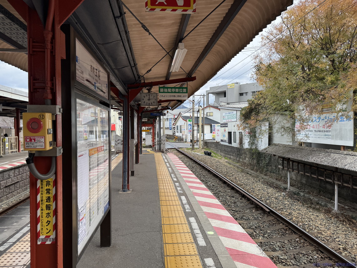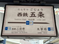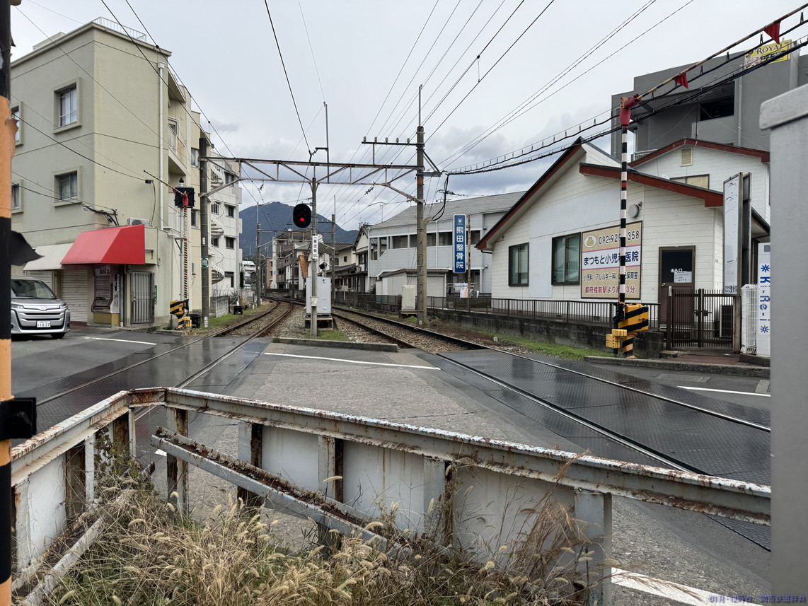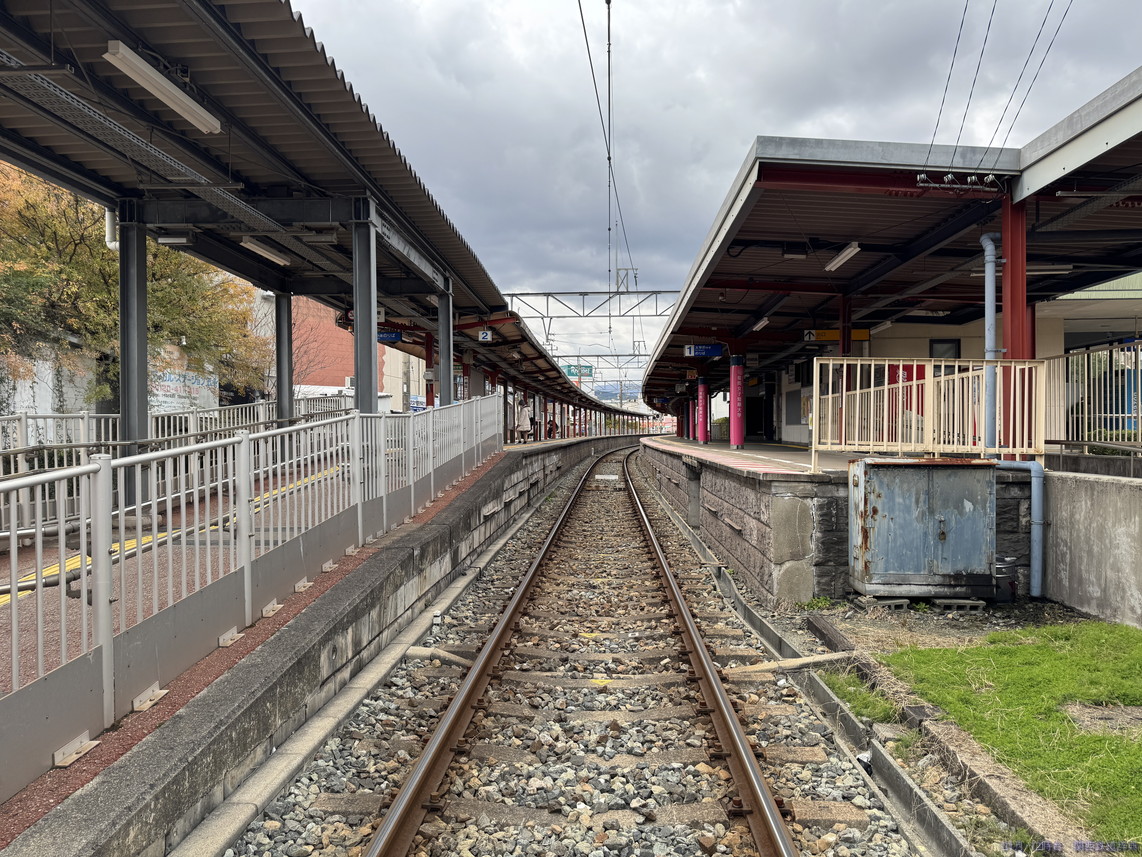 西鉄五条駅はこれまでに見たことがない不思議な駅。単線交換駅で、片側の線路だけ両側にホーム。ホーム増設は、なんば駅とか旧・渋谷とかありますが、そういう場合柵で塞ぐだろうに、それはなく現在ものりば番号設定。なぜ…?