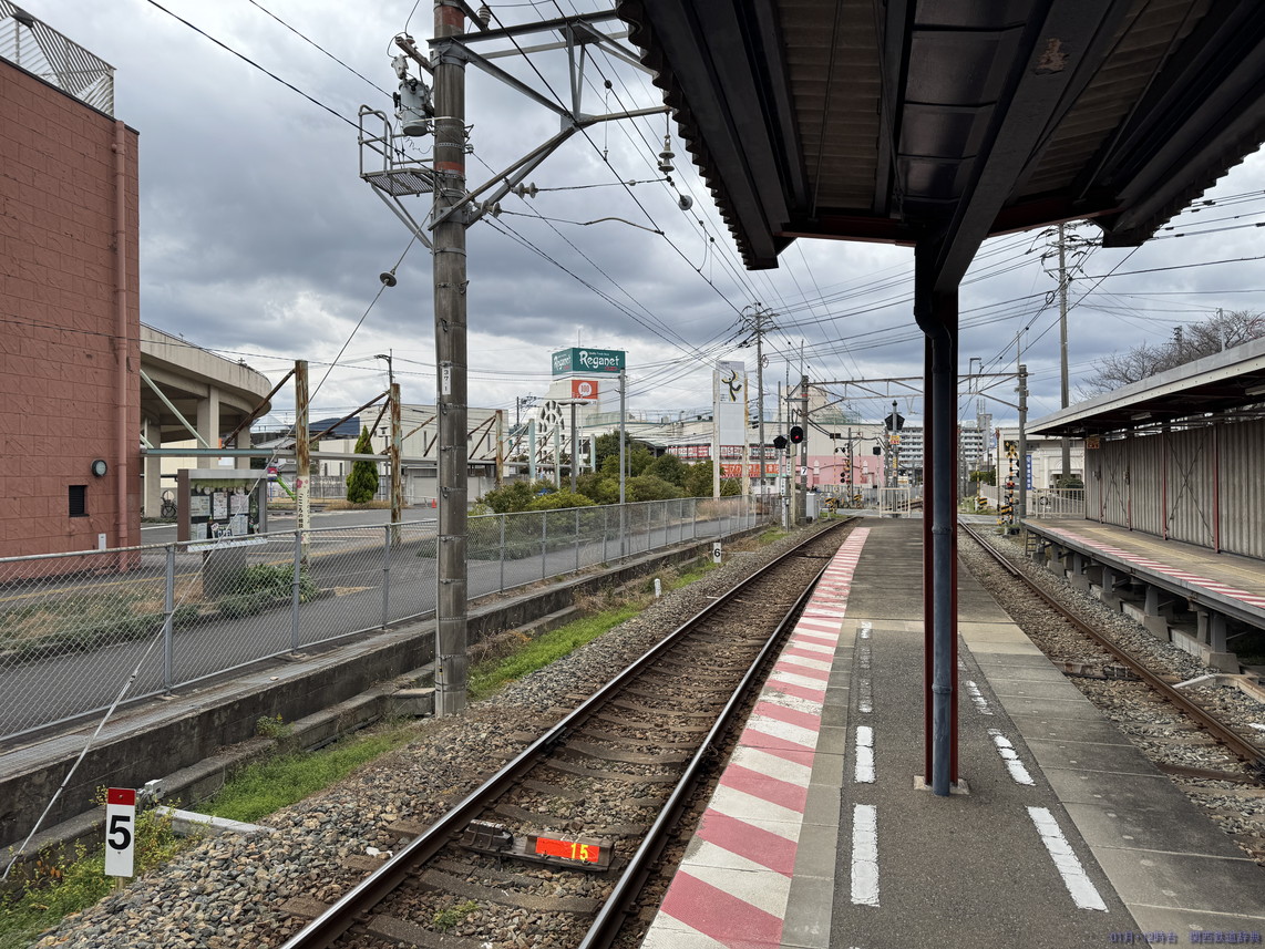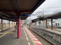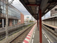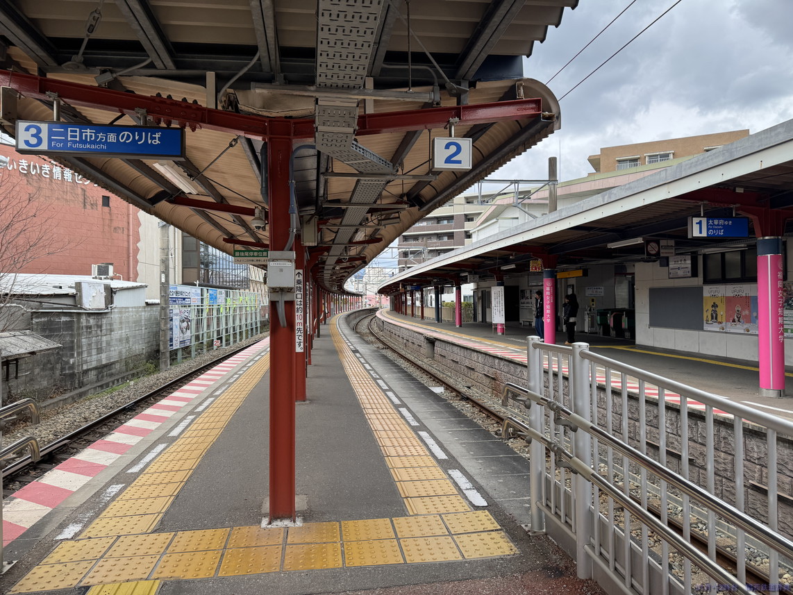 太宰府方面ホームの二日市方。最初にこのへんに降りて、「なんだこの駅!?」と思いましたね。対向側のホームですが、こちらは壁。狭いホームに壁が続いていて、線路がホームで挟まれてる…なにこれ